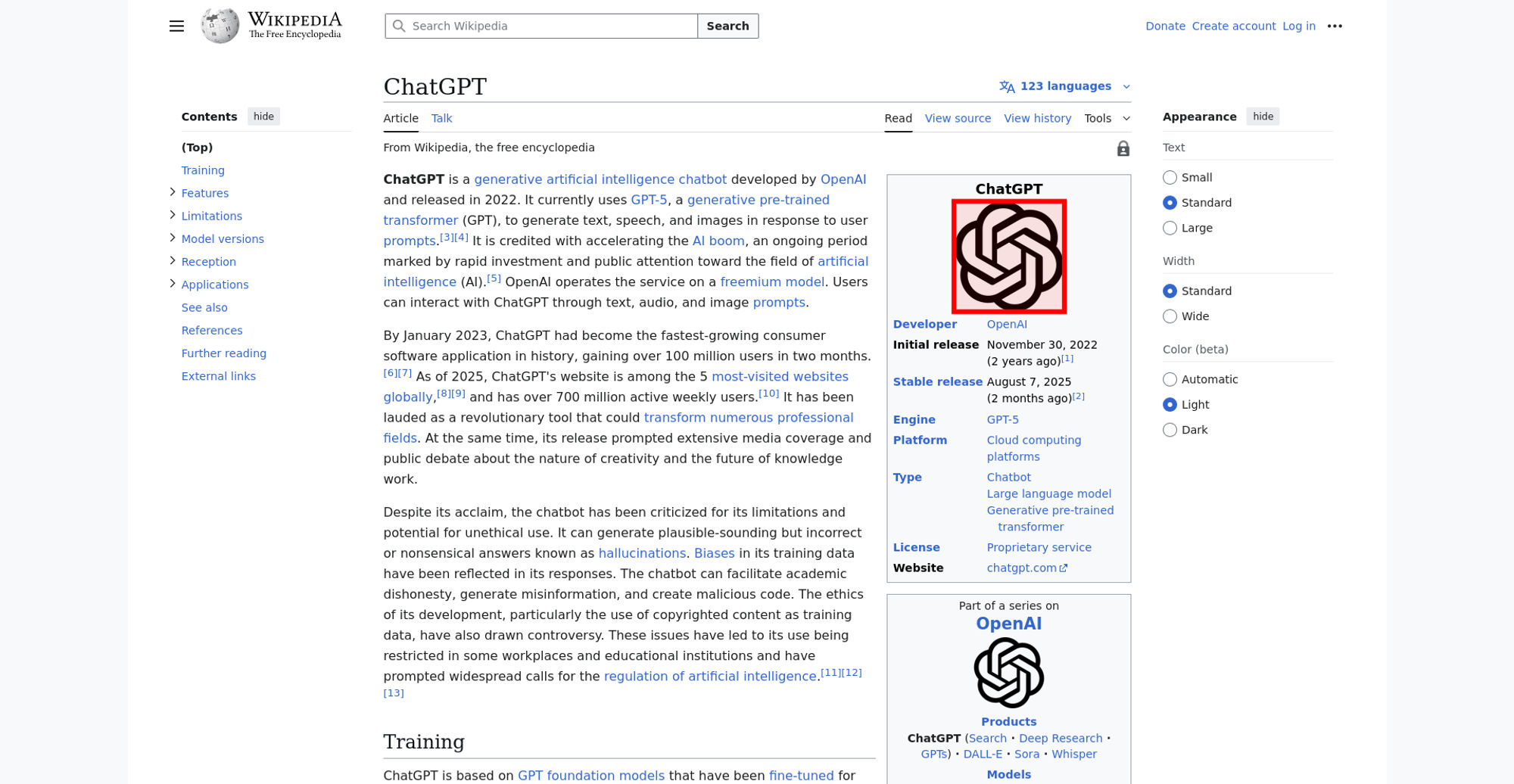 | Offenders: https://upload.wikimedia.org/wikipedia/en/thumb/1/1b/Semi-protection-shackle.svg...n-shackle.svg.png https://upload.wikimedia.org/wikipedia/commons/thumb/e/ef/ChatGPT-Logo.svg/250px...tGPT-Logo.svg.png https://upload.wikimedia.org/wikipedia/commons/thumb/e/ef/ChatGPT-Logo.svg/120px...tGPT-Logo.svg.png https://upload.wikimedia.org/wikipedia/commons/thumb/b/b5/Three-stage_large_lang..._workflow.svg.png https://upload.wikimedia.org/wikipedia/commons/thumb/a/a9/ChatGPT_screenshot_-_A...ug_25%2C_2025.png https://upload.wikimedia.org/wikipedia/commons/thumb/4/47/A_pictorial_interpreta...ed_by_ChatGPT.jpg https://upload.wikimedia.org/wikipedia/commons/thumb/3/3a/ChatGPT_hallucination....hallucination.png https://upload.wikimedia.org/wikipedia/commons/thumb/8/8d/Sam_Altman_CropEdit_Ja...t_James_Tamim.jpg https://upload.wikimedia.org/wikipedia/commons/thumb/b/b6/The_AI_Arms_Race_Is_Ch...erything.webp.png https://upload.wikimedia.org/wikipedia/commons/thumb/9/97/Chatgpt_usage.svg/250p...gpt_usage.svg.png https://upload.wikimedia.org/wikipedia/commons/thumb/e/eb/Countries_where_ChatGP...available.svg.png https://upload.wikimedia.org/wikipedia/commons/thumb/8/84/ChatGPT_essay_draft.pn...T_essay_draft.png https://upload.wikimedia.org/wikipedia/commons/thumb/2/2e/Books_about_ChatGPT_in...aka_bookstore.jpg https://upload.wikimedia.org/wikipedia/commons/thumb/d/de/Globe_of_letters.svg/2...f_letters.svg.png https://upload.wikimedia.org/wikipedia/commons/thumb/a/a9/Noun-technology.svg/20...echnology.svg.png https://upload.wikimedia.org/wikipedia/en/thumb/4/4a/Commons-logo.svg/40px-Commons-logo.svg.png https://upload.wikimedia.org/wikipedia/en/thumb/8/8a/OOjs_UI_icon_edit-ltr-progr...ogressive.svg.png https://upload.wikimedia.org/wikipedia/commons/thumb/a/af/OpenAI_logo_2025_%28wo...rdmark%29.svg.png https://upload.wikimedia.org/wikipedia/en/thumb/9/96/Symbol_category_class.svg/2...ory_class.svg.png https://upload.wikimedia.org/wikipedia/commons/6/65/Lock-green.svg https://upload.wikimedia.org/wikipedia/commons/4/4d/Icon_pdf_file.png https://upload.wikimedia.org/wikipedia/commons/a/aa/Lock-red-alt-2.svg https://upload.wikimedia.org/wikipedia/commons/d/d6/Lock-gray-alt-2.svg https://en.wikipedia.org/wiki/Special:CentralAutoLogin/start?useformat=desktop&type=script&usesul3=1 https://auth.wikimedia.org/metawiki/wiki/Special:CentralAutoLogin/checkLoggedIn...gin/checkLoggedIn |