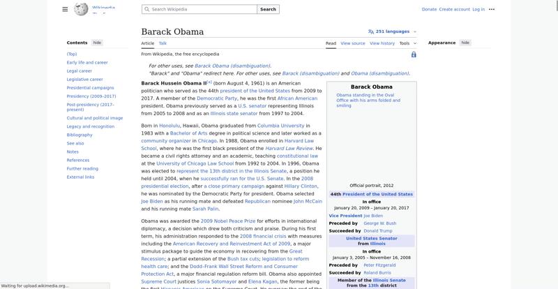 | Offenders: https://upload.wikimedia.org/wikipedia/en/thumb/8/8c/Extended-protection-shackle...n-shackle.svg.png https://upload.wikimedia.org/wikipedia/commons/thumb/8/8d/President_Barack_Obama..._Barack_Obama.jpg https://upload.wikimedia.org/wikipedia/commons/thumb/1/11/Barack_Obama_signature...signature.svg.png https://upload.wikimedia.org/wikipedia/commons/thumb/e/e7/Obama_2008_portrait_cr...se_cropped%29.jpg https://upload.wikimedia.org/wikipedia/commons/thumb/3/36/Seal_of_the_President_...ed_States.svg.png https://upload.wikimedia.org/wikipedia/en/thumb/3/33/Ann_Dunham_with_father_and_..._and_children.jpg https://upload.wikimedia.org/wikipedia/commons/thumb/9/99/Barry_Soetoro_school_r...school_record.jpg https://upload.wikimedia.org/wikipedia/commons/thumb/1/1b/Nuvola_apps_kaboodle.s..._kaboodle.svg.png https://upload.wikimedia.org/wikipedia/commons/thumb/2/26/Obama_family_portrait_...he_Green_Room.jpg https://upload.wikimedia.org/wikipedia/commons/thumb/3/3d/Obamas_at_church_on_In...tion_Day_2013.jpg https://upload.wikimedia.org/wikipedia/commons/thumb/b/b6/Obamamiltondavis1.jpg/...amiltondavis1.jpg https://upload.wikimedia.org/wikipedia/commons/thumb/a/a4/Chicago%2C_November_2%...5471954323%29.jpg https://upload.wikimedia.org/wikipedia/commons/thumb/f/f1/BarackObamaportrait.jp...Obamaportrait.jpg https://upload.wikimedia.org/wikipedia/commons/thumb/2/24/ElectoralCollege2008.s...llege2008.svg.png https://upload.wikimedia.org/wikipedia/commons/thumb/3/33/Barack_obama_by_bill_c...y_bill_cramer.jpg https://upload.wikimedia.org/wikipedia/commons/thumb/4/44/ElectoralCollege2012.s...llege2012.svg.png https://upload.wikimedia.org/wikipedia/commons/thumb/d/d7/US_President_Barack_Ob...e_-_2009Jan20.jpg https://upload.wikimedia.org/wikipedia/commons/thumb/e/e9/Official_portrait_of_B..._Barack_Obama.jpg https://upload.wikimedia.org/wikipedia/commons/thumb/3/32/Barack_Obama_addresses...ss_2009-02-24.jpg https://upload.wikimedia.org/wikipedia/commons/thumb/4/4b/Barack_Obama_visiting_...rora_shooting.jpg https://upload.wikimedia.org/wikipedia/commons/thumb/f/fc/U.S._Total_Deficits_vs...ses_2001-2010.png https://upload.wikimedia.org/wikipedia/commons/thumb/2/25/US_Employment_Statisti...tatistics.svg.png https://upload.wikimedia.org/wikipedia/commons/thumb/9/9f/Job_Growth_by_U.S._Pre...resident_-_v1.png https://upload.wikimedia.org/wikipedia/commons/thumb/6/63/Obama-venice-la.jpg/25...ama-venice-la.jpg https://upload.wikimedia.org/wikipedia/commons/thumb/7/79/PPACA_Premium_Chart.jp...Premium_Chart.jpg https://upload.wikimedia.org/wikipedia/commons/thumb/8/84/Percentage_of_Individu...%2C_1963-2015.png https://upload.wikimedia.org/wikipedia/commons/thumb/9/99/P06409PS-0571_%2835946...3594694537%29.jpg https://upload.wikimedia.org/wikipedia/commons/thumb/6/6f/Barack_Obama%27s_trip_..._2016_%289%29.jpg https://upload.wikimedia.org/wikipedia/commons/thumb/7/70/Barack_Obama_with_Afgh...and_Joe_Biden.jpg https://upload.wikimedia.org/wikipedia/commons/thumb/a/ac/Obama_and_Biden_await_..._on_bin_Laden.jpg https://upload.wikimedia.org/wikipedia/commons/thumb/f/f6/Handshake_between_the_...C3%BAl_Castro.jpg https://upload.wikimedia.org/wikipedia/commons/thumb/1/1b/Barack_Obama_welcomes_...e_Oval_Office.jpg https://upload.wikimedia.org/wikipedia/commons/thumb/1/17/Barack_Obama_talks_wit...8637772147%29.jpg https://upload.wikimedia.org/wikipedia/commons/thumb/e/eb/Vladimir_Putin_and_Bar...5-09-29%29_01.jpg https://upload.wikimedia.org/wikipedia/commons/thumb/9/96/Obama_Macri_October_20..._October_2017.jpg https://upload.wikimedia.org/wikipedia/commons/thumb/1/15/P20220405AS-1082_%2852...2067439422%29.jpg https://upload.wikimedia.org/wikipedia/commons/thumb/2/28/Former_President_Barac...%28cropped%29.jpg https://upload.wikimedia.org/wikipedia/commons/thumb/c/c0/Gallup_Poll-Approval_R...ack_Obama.svg.png https://upload.wikimedia.org/wikipedia/en/thumb/6/69/P_vip.svg/40px-P_vip.svg.png https://upload.wikimedia.org/wikipedia/en/thumb/a/a4/Flag_of_the_United_States.s...ed_States.svg.png https://upload.wikimedia.org/wikipedia/commons/thumb/e/ef/Flag_of_Hawaii.svg/40p...of_Hawaii.svg.png https://upload.wikimedia.org/wikipedia/commons/thumb/9/9b/Flag_of_Chicago%2C_Ill..._Illinois.svg.png https://upload.wikimedia.org/wikipedia/commons/thumb/0/01/Flag_of_Illinois.svg/4..._Illinois.svg.png https://upload.wikimedia.org/wikipedia/commons/thumb/1/17/Balance%2C_by_David.sv..._by_David.svg.png https://upload.wikimedia.org/wikipedia/en/thumb/0/01/A_coloured_voting_box.svg/4...oting_box.svg.png https://upload.wikimedia.org/wikipedia/commons/thumb/c/c1/Blue_iPod_Nano.jpg/20px-Blue_iPod_Nano.jpg https://upload.wikimedia.org/wikipedia/commons/thumb/9/9d/IPhone5white.png/20px-IPhone5white.png https://upload.wikimedia.org/wikipedia/en/thumb/4/4a/Commons-logo.svg/20px-Commons-logo.svg.png https://upload.wikimedia.org/wikipedia/commons/thumb/2/24/Wikinews-logo.svg/40px...news-logo.svg.png https://upload.wikimedia.org/wikipedia/commons/thumb/f/fa/Wikiquote-logo.svg/40p...uote-logo.svg.png https://upload.wikimedia.org/wikipedia/commons/thumb/4/4c/Wikisource-logo.svg/40...urce-logo.svg.png https://upload.wikimedia.org/wikipedia/commons/thumb/f/ff/Wikidata-logo.svg/40px...data-logo.svg.png https://upload.wikimedia.org/wikipedia/en/thumb/8/8a/OOjs_UI_icon_edit-ltr-progr...ogressive.svg.png https://upload.wikimedia.org/wikipedia/commons/thumb/2/21/Speaker_Icon.svg/20px-Speaker_Icon.svg.png https://upload.wikimedia.org/wikipedia/en/thumb/9/96/Symbol_category_class.svg/2...ory_class.svg.png https://upload.wikimedia.org/wikipedia/en/thumb/d/db/Symbol_list_class.svg/20px-...ist_class.svg.png https://upload.wikimedia.org/wikipedia/commons/thumb/f/f0/Seal_of_the_United_Sta...es_Senate.svg.png https://upload.wikimedia.org/wikipedia/commons/thumb/4/4b/Michelle_Obama_2013_of...cial_portrait.jpg https://upload.wikimedia.org/wikipedia/en/thumb/e/ed/Nobel_Prize.png/120px-Nobel_Prize.png https://upload.wikimedia.org/wikipedia/commons/a/aa/Lock-red-alt-2