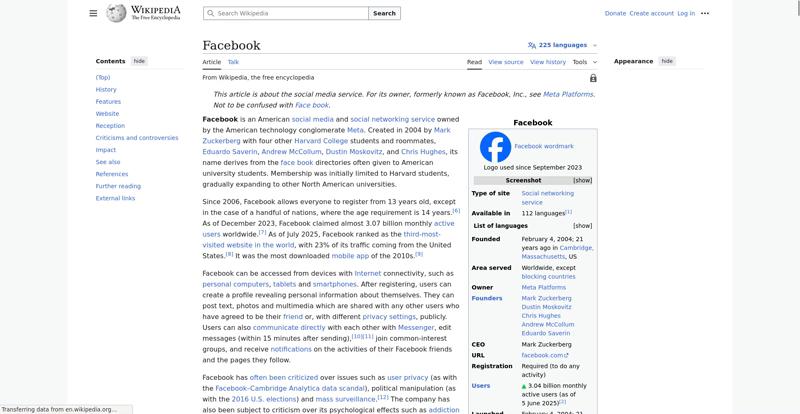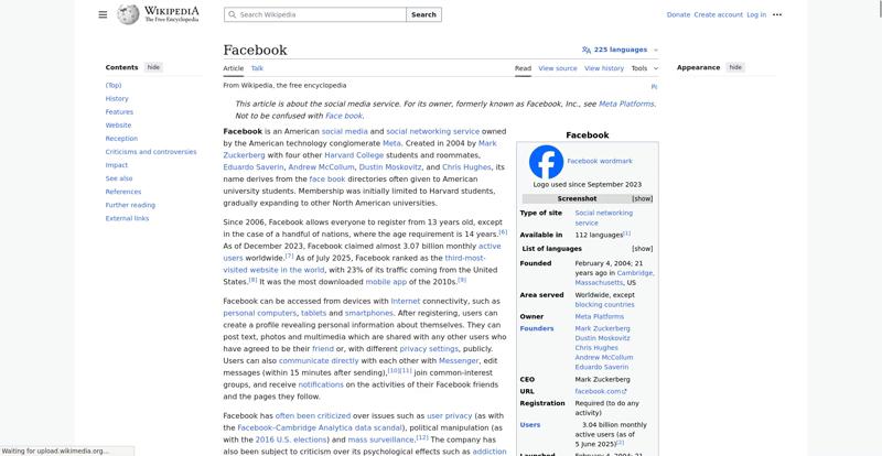 | Offenders: https://upload.wikimedia.org/wikipedia/en/thumb/1/1b/Semi-protection-shackle.svg...n-shackle.svg.png https://upload.wikimedia.org/wikipedia/commons/thumb/b/b9/2023_Facebook_icon.svg...book_icon.svg.png https://upload.wikimedia.org/wikipedia/commons/thumb/9/93/Facebook_logo_%282023%...282023%29.svg.png https://upload.wikimedia.org/wikipedia/en/6/64/Facebook_user_page.png https://upload.wikimedia.org/wikipedia/commons/thumb/b/b0/Increase2.svg/20px-Increase2.svg.png https://upload.wikimedia.org/wikipedia/commons/thumb/0/05/Meta_Platforms_Inc._lo...ropped%29.svg.png https://upload.wikimedia.org/wikipedia/commons/3/38/Facebook_Like_React.png https://upload.wikimedia.org/wikipedia/commons/thumb/f/fc/MarkZuckerberg-crop.jp...ckerberg-crop.jpg https://upload.wikimedia.org/wikipedia/en/thumb/1/12/Original-facebook.jpg/250px...inal-facebook.jpg https://upload.wikimedia.org/wikipedia/commons/thumb/0/06/Facebook.svg/250px-Facebook.svg.png https://upload.wikimedia.org/wikipedia/commons/thumb/6/69/Screen_of_Facebook_%28...ebook_%282%29.PNG https://upload.wikimedia.org/wikipedia/commons/thumb/f/f4/Facebook_t-shirt_with_...d_for_Hackers.jpg https://upload.wikimedia.org/wikipedia/commons/thumb/5/5d/Population_pyramid_of_..._users_by_age.png https://upload.wikimedia.org/wikipedia/commons/thumb/9/9c/Facebook_censorship.sv...ensorship.svg.png https://upload.wikimedia.org/wikipedia/commons/thumb/f/f3/PRISM_Collection_Detai...ction_Details.jpg https://upload.wikimedia.org/wikipedia/commons/thumb/6/62/Onavo_logo.png/250px-Onavo_logo.png https://upload.wikimedia.org/wikipedia/commons/thumb/2/26/Hands_Off%21_protest%2...5%2C_2025-053.jpg https://upload.wikimedia.org/wikipedia/commons/thumb/c/c9/Berlin_%289163009052%2...9163009052%29.jpg https://upload.wikimedia.org/wikipedia/commons/thumb/6/61/Ad-tech_London_2010_%2..._2010_%285%29.JPG https://upload.wikimedia.org/wikipedia/commons/thumb/2/27/2011_Egyptian_protests...26_jan25_card.jpg https://upload.wikimedia.org/wikipedia/commons/thumb/9/99/SF_Pride_2014_-_Stierc...4_-_Stierch_7.jpg https://upload.wikimedia.org/wikipedia/commons/thumb/2/2a/Industry5.svg/40px-Industry5.svg.png https://upload.wikimedia.org/wikipedia/commons/thumb/f/f9/Crystal_Clear_app_linn...ghborhood.svg.png https://upload.wikimedia.org/wikipedia/en/thumb/0/06/Wiktionary-logo-v2.svg/40px...y-logo-v2.svg.png https://upload.wikimedia.org/wikipedia/en/thumb/4/4a/Commons-logo.svg/20px-Commons-logo.svg.png https://upload.wikimedia.org/wikipedia/commons/thumb/2/24/Wikinews-logo.svg/40px...news-logo.svg.png https://upload.wikimedia.org/wikipedia/commons/thumb/f/fa/Wikiquote-logo.svg/40p...uote-logo.svg.png https://upload.wikimedia.org/wikipedia/commons/thumb/3/32/Scholia_logo.svg/40px-Scholia_logo.svg.png https://upload.wikimedia.org/wikipedia/en/thumb/8/8a/OOjs_UI_icon_edit-ltr-progr...ogressive.svg.png https://upload.wikimedia.org/wikipedia/commons/a/aa/Lock-red-alt-2.svg https://upload.wikimedia.org/wikipedia/commons/4/4d/Icon_pdf_file.png https://upload.wikimedia.org/wikipedia/commons/6/65/Lock-green.svg https://upload.wikimedia.org/wikipedia/commons/d/d6/Lock-gray-alt-2.svg https://en.wikipedia.org/wiki/Special:CentralAutoLogin/start?useformat=desktop&type=script&usesul3=1 https://auth.wikimedia.org/metawiki/wiki/Special:CentralAutoLogin/checkLoggedIn...gin/checkLoggedIn |