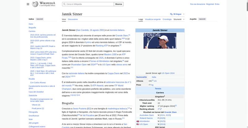 | Offenders: https://upload.wikimedia.org/wikipedia/commons/thumb/a/a5/Semi-protection-shackl...le-itwiki.svg.png https://upload.wikimedia.org/wikipedia/commons/thumb/9/97/Jannik_Sinner_%282024_...%28cropped%29.jpg https://upload.wikimedia.org/wikipedia/commons/thumb/0/03/Flag_of_Italy.svg/20px..._of_Italy.svg.png https://upload.wikimedia.org/wikipedia/commons/thumb/8/85/Tennis_pictogram.svg/4...pictogram.svg.png https://upload.wikimedia.org/wikipedia/commons/thumb/b/b9/Flag_of_Australia.svg/...Australia.svg.png https://upload.wikimedia.org/wikipedia/commons/thumb/c/c3/Flag_of_France.svg/20p...of_France.svg.png https://upload.wikimedia.org/wikipedia/commons/thumb/a/a4/Flag_of_the_United_Sta...ed_States.svg.png https://upload.wikimedia.org/wikipedia/commons/thumb/8/83/Flag_of_the_United_Kin...%283-5%29.svg.png https://upload.wikimedia.org/wikipedia/commons/6/6a/Jannik_Sinner_logo.png https://upload.wikimedia.org/wikipedia/commons/thumb/3/3e/ATP_World_Tour_Finals_...London%29.svg.png https://upload.wikimedia.org/wikipedia/commons/thumb/8/8c/Transparent.png/1px-Transparent.png https://upload.wikimedia.org/wikipedia/commons/thumb/b/be/Jannik_Sinner_after_wi...Milan%2C_2019.jpg https://upload.wikimedia.org/wikipedia/commons/thumb/f/f6/Sinner_MCM23_%288%29_%...2883593853%29.jpg https://upload.wikimedia.org/wikipedia/commons/thumb/6/66/Jannik_Sinner_%282024_...US_Open%29_01.jpg https://upload.wikimedia.org/wikipedia/commons/thumb/8/87/Magnifying_glass_icon_...icon_mgx2.svg.png https://upload.wikimedia.org/wikipedia/commons/thumb/f/f3/Flag_of_Russia.svg/20p...of_Russia.svg.png https://upload.wikimedia.org/wikipedia/commons/thumb/b/ba/Flag_of_Germany.svg/20...f_Germany.svg.png https://upload.wikimedia.org/wikipedia/commons/thumb/9/9a/Flag_of_Spain.svg/20px..._of_Spain.svg.png https://upload.wikimedia.org/wikipedia/commons/thumb/9/9c/Nastrino_Stella_Merito...tivo_2015.svg.png https://upload.wikimedia.org/wikipedia/commons/thumb/f/fa/Wikiquote-logo.svg/20p...uote-logo.svg.png https://upload.wikimedia.org/wikipedia/commons/thumb/4/4a/Commons-logo.svg/20px-Commons-logo.svg.png https://upload.wikimedia.org/wikipedia/commons/thumb/2/24/Wikinews-logo.svg/20px...news-logo.svg.png https://upload.wikimedia.org/wikipedia/commons/thumb/7/73/Blue_pencil.svg/20px-Blue_pencil.svg.png https://upload.wikimedia.org/wikipedia/commons/thumb/f/ff/Flag_of_Serbia.svg/20p...of_Serbia.svg.png https://upload.wikimedia.org/wikipedia/commons/thumb/9/9c/Flag_of_Denmark.svg/20...f_Denmark.svg.png https://upload.wikimedia.org/wikipedia/commons/thumb/0/03/Flag_of_Italy.svg/60px..._of_Italy.svg.png https://upload.wikimedia.org/wikipedia/commons/thumb/c/cb/Flag_of_Romania_%28196...931989%29.svg.png https://upload.wikimedia.org/wikipedia/commons/thumb/4/4c/Flag_of_Sweden.svg/20p...of_Sweden.svg.png https://upload.wikimedia.org/wikipedia/commons/thumb/c/cb/Flag_of_the_Czech_Repu..._Republic.svg.png https://upload.wikimedia.org/wikipedia/commons/thumb/4/41/Flag_of_Austria.svg/20...f_Austria.svg.png https://upload.wikimedia.org/wikipedia/commons/thumb/7/78/Flag_of_Chile.svg/20px..._of_Chile.svg.png https://upload.wikimedia.org/wikipedia/commons/thumb/0/05/Flag_of_Brazil.svg/20p...of_Brazil.svg.png https://upload.wikimedia.org/wikipedia/commons/thumb/f/f3/Flag_of_Switzerland.sv...itzerland.svg.png https://upload.wikimedia.org/wikipedia/commons/thumb/6/67/Crystal_Clear_app_Logi...n_Manager.svg.png https://upload.wikimedia.org/wikipedia/commons/thumb/6/61/Tennis_icon_nobkg.png/...is_icon_nobkg.png https://en.wikipedia.org/w/index.php...a.org/w/index.php https://en.wikipedia.org/w/index.php...a.org/w/index.php https://it.wikipedia.org/wiki/Special:CentralAutoLogin/start?useformat=desktop&type=script&usesul3=1 https://auth.wikimedia.org/metawiki/wiki/Special:CentralAutoLogin/checkLoggedIn...gin/checkLoggedIn |