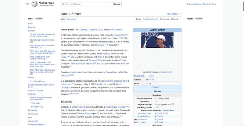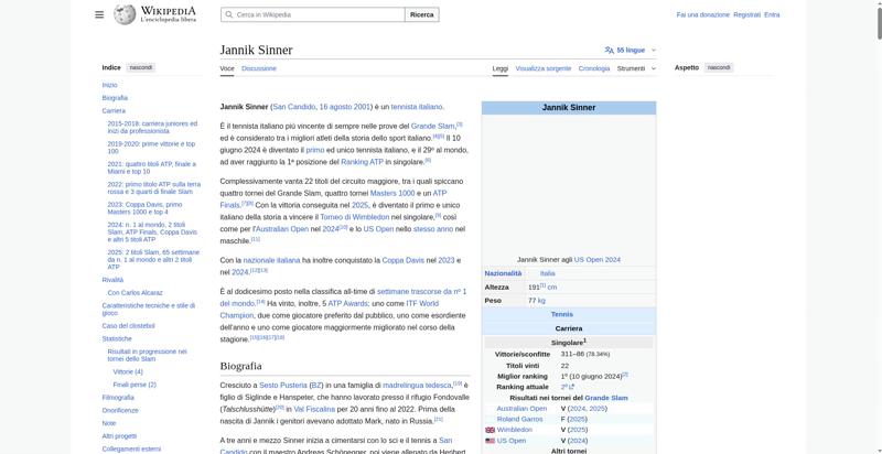 | Offenders: https://upload.wikimedia.org/wikipedia/commons/thumb/a/a5/Semi-protection-shackl...le-itwiki.svg.png https://upload.wikimedia.org/wikipedia/commons/thumb/9/97/Jannik_Sinner_%282024_...%28cropped%29.jpg https://upload.wikimedia.org/wikipedia/commons/thumb/0/03/Flag_of_Italy.svg/20px..._of_Italy.svg.png https://upload.wikimedia.org/wikipedia/commons/thumb/8/85/Tennis_pictogram.svg/4...pictogram.svg.png https://upload.wikimedia.org/wikipedia/commons/thumb/b/b9/Flag_of_Australia.svg/...Australia.svg.png https://upload.wikimedia.org/wikipedia/commons/thumb/c/c3/Flag_of_France.svg/20p...of_France.svg.png https://upload.wikimedia.org/wikipedia/commons/thumb/a/a4/Flag_of_the_United_Sta...ed_States.svg.png https://upload.wikimedia.org/wikipedia/commons/thumb/8/83/Flag_of_the_United_Kin...%283-5%29.svg.png https://upload.wikimedia.org/wikipedia/commons/thumb/3/3e/ATP_World_Tour_Finals_...London%29.svg.png https://upload.wikimedia.org/wikipedia/commons/thumb/8/8c/Transparent.png/1px-Transparent.png https://upload.wikimedia.org/wikipedia/commons/6/6a/Jannik_Sinner_logo.png https://upload.wikimedia.org/wikipedia/commons/thumb/b/be/Jannik_Sinner_after_wi...Milan%2C_2019.jpg https://upload.wikimedia.org/wikipedia/commons/thumb/f/f6/Sinner_MCM23_%288%29_%...2883593853%29.jpg https://upload.wikimedia.org/wikipedia/commons/thumb/6/66/Jannik_Sinner_%282024_...US_Open%29_01.jpg https://upload.wikimedia.org/wikipedia/commons/thumb/8/87/Magnifying_glass_icon_...icon_mgx2.svg.png https://upload.wikimedia.org/wikipedia/commons/thumb/f/f3/Flag_of_Russia.svg/20p...of_Russia.svg.png https://upload.wikimedia.org/wikipedia/commons/thumb/b/ba/Flag_of_Germany.svg/20...f_Germany.svg.png https://upload.wikimedia.org/wikipedia/commons/thumb/9/9a/Flag_of_Spain.svg/20px..._of_Spain.svg.png https://upload.wikimedia.org/wikipedia/commons/thumb/9/9c/Nastrino_Stella_Merito...tivo_2015.svg.png https://upload.wikimedia.org/wikipedia/commons/thumb/f/fa/Wikiquote-logo.svg/20p...uote-logo.svg.png https://upload.wikimedia.org/wikipedia/commons/thumb/4/4a/Commons-logo.svg/20px-Commons-logo.svg.png https://upload.wikimedia.org/wikipedia/commons/thumb/2/24/Wikinews-logo.svg/20px...news-logo.svg.png https://upload.wikimedia.org/wikipedia/commons/thumb/7/73/Blue_pencil.svg/20px-Blue_pencil.svg.png https://upload.wikimedia.org/wikipedia/commons/thumb/f/ff/Flag_of_Serbia.svg/20p...of_Serbia.svg.png https://upload.wikimedia.org/wikipedia/commons/thumb/9/9c/Flag_of_Denmark.svg/20...f_Denmark.svg.png https://upload.wikimedia.org/wikipedia/commons/thumb/0/03/Flag_of_Italy.svg/60px..._of_Italy.svg.png https://upload.wikimedia.org/wikipedia/commons/thumb/c/cb/Flag_of_Romania_%28196...931989%29.svg.png https://upload.wikimedia.org/wikipedia/commons/thumb/4/4c/Flag_of_Sweden.svg/20p...of_Sweden.svg.png https://upload.wikimedia.org/wikipedia/commons/thumb/c/cb/Flag_of_the_Czech_Repu..._Republic.svg.png https://upload.wikimedia.org/wikipedia/commons/thumb/4/41/Flag_of_Austria.svg/20...f_Austria.svg.png https://upload.wikimedia.org/wikipedia/commons/thumb/7/78/Flag_of_Chile.svg/20px..._of_Chile.svg.png https://upload.wikimedia.org/wikipedia/commons/thumb/0/05/Flag_of_Brazil.svg/20p...of_Brazil.svg.png https://upload.wikimedia.org/wikipedia/commons/thumb/f/f3/Flag_of_Switzerland.sv...itzerland.svg.png https://upload.wikimedia.org/wikipedia/commons/thumb/6/67/Crystal_Clear_app_Logi...n_Manager.svg.png https://upload.wikimedia.org/wikipedia/commons/thumb/6/61/Tennis_icon_nobkg.png/...is_icon_nobkg.png https://en.wikipedia.org/w/index.php...a.org/w/index.php https://en.wikipedia.org/w/index.php...a.org/w/index.php https://it.wikipedia.org/wiki/Special:CentralAutoLogin/start?useformat=desktop&type=script&usesul3=1 https://auth.wikimedia.org/metawiki/wiki/Special:CentralAutoLogin/checkLoggedIn...gin/checkLoggedIn |