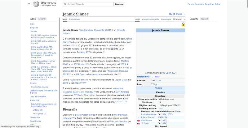 | Offenders: https://upload.wikimedia.org/wikipedia/commons/thumb/a/a5/Semi-protection-shackl...le-itwiki.svg.png https://upload.wikimedia.org/wikipedia/commons/thumb/9/97/Jannik_Sinner_%282024_...%28cropped%29.jpg https://upload.wikimedia.org/wikipedia/commons/thumb/0/03/Flag_of_Italy.svg/20px..._of_Italy.svg.png https://upload.wikimedia.org/wikipedia/commons/thumb/8/85/Tennis_pictogram.svg/4...pictogram.svg.png https://upload.wikimedia.org/wikipedia/commons/thumb/b/b9/Flag_of_Australia.svg/...Australia.svg.png https://upload.wikimedia.org/wikipedia/commons/thumb/c/c3/Flag_of_France.svg/20p...of_France.svg.png https://upload.wikimedia.org/wikipedia/commons/thumb/8/83/Flag_of_the_United_Kin...%283-5%29.svg.png https://upload.wikimedia.org/wikipedia/commons/thumb/a/a4/Flag_of_the_United_Sta...ed_States.svg.png https://upload.wikimedia.org/wikipedia/commons/thumb/3/3e/ATP_World_Tour_Finals_...London%29.svg.png https://upload.wikimedia.org/wikipedia/commons/thumb/8/8c/Transparent.png/1px-Transparent.png https://upload.wikimedia.org/wikipedia/commons/6/6a/Jannik_Sinner_logo.png https://upload.wikimedia.org/wikipedia/commons/thumb/b/be/Jannik_Sinner_after_wi...Milan%2C_2019.jpg https://upload.wikimedia.org/wikipedia/commons/thumb/f/f6/Sinner_MCM23_%288%29_%...2883593853%29.jpg https://upload.wikimedia.org/wikipedia/commons/thumb/6/66/Jannik_Sinner_%282024_...US_Open%29_01.jpg https://upload.wikimedia.org/wikipedia/commons/thumb/8/87/Magnifying_glass_icon_...icon_mgx2.svg.png https://upload.wikimedia.org/wikipedia/commons/thumb/f/f3/Flag_of_Russia.svg/20p...of_Russia.svg.png https://upload.wikimedia.org/wikipedia/commons/thumb/b/ba/Flag_of_Germany.svg/20...f_Germany.svg.png https://upload.wikimedia.org/wikipedia/commons/thumb/9/9a/Flag_of_Spain.svg/20px..._of_Spain.svg.png https://upload.wikimedia.org/wikipedia/commons/thumb/9/9c/Nastrino_Stella_Merito...tivo_2015.svg.png https://upload.wikimedia.org/wikipedia/commons/thumb/f/fa/Wikiquote-logo.svg/20p...uote-logo.svg.png https://upload.wikimedia.org/wikipedia/commons/thumb/4/4a/Commons-logo.svg/20px-Commons-logo.svg.png https://upload.wikimedia.org/wikipedia/commons/thumb/2/24/Wikinews-logo.svg/20px...news-logo.svg.png https://upload.wikimedia.org/wikipedia/commons/thumb/7/73/Blue_pencil.svg/20px-Blue_pencil.svg.png https://upload.wikimedia.org/wikipedia/commons/thumb/f/ff/Flag_of_Serbia.svg/20p...of_Serbia.svg.png https://upload.wikimedia.org/wikipedia/commons/thumb/9/9c/Flag_of_Denmark.svg/20...f_Denmark.svg.png https://upload.wikimedia.org/wikipedia/commons/thumb/0/03/Flag_of_Italy.svg/60px..._of_Italy.svg.png https://upload.wikimedia.org/wikipedia/commons/thumb/c/cb/Flag_of_Romania_%28196...931989%29.svg.png https://upload.wikimedia.org/wikipedia/commons/thumb/4/4c/Flag_of_Sweden.svg/20p...of_Sweden.svg.png https://upload.wikimedia.org/wikipedia/commons/thumb/c/cb/Flag_of_the_Czech_Repu..._Republic.svg.png https://upload.wikimedia.org/wikipedia/commons/thumb/4/41/Flag_of_Austria.svg/20...f_Austria.svg.png https://upload.wikimedia.org/wikipedia/commons/thumb/7/78/Flag_of_Chile.svg/20px..._of_Chile.svg.png https://upload.wikimedia.org/wikipedia/commons/thumb/0/05/Flag_of_Brazil.svg/20p...of_Brazil.svg.png https://upload.wikimedia.org/wikipedia/commons/thumb/f/f3/Flag_of_Switzerland.sv...itzerland.svg.png https://upload.wikimedia.org/wikipedia/commons/thumb/6/67/Crystal_Clear_app_Logi...n_Manager.svg.png https://upload.wikimedia.org/wikipedia/commons/thumb/6/61/Tennis_icon_nobkg.png/...is_icon_nobkg.png https://en.wikipedia.org/w/index.php...a.org/w/index.php https://en.wikipedia.org/w/index.php...a.org/w/index.php https://it.wikipedia.org/wiki/Special:CentralAutoLogin/start?useformat=desktop&type=script&usesul3=1 https://auth.wikimedia.org/metawiki/wiki/Special:CentralAutoLogin/checkLoggedIn...gin/checkLoggedIn |