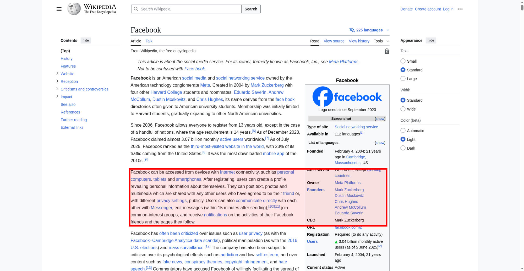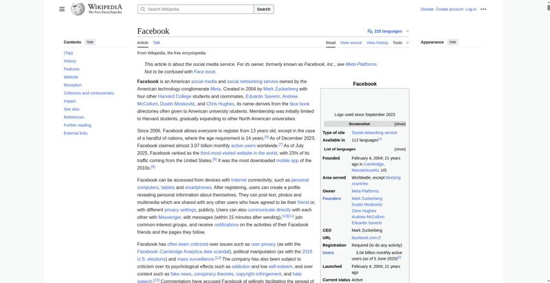 | Offenders: https://upload.wikimedia.org/wikipedia/en/thumb/1/1b/Semi-protection-shackle.svg...n-shackle.svg.png https://upload.wikimedia.org/wikipedia/commons/thumb/b/b9/2023_Facebook_icon.svg...book_icon.svg.png https://upload.wikimedia.org/wikipedia/commons/thumb/9/93/Facebook_logo_%282023%...282023%29.svg.png https://upload.wikimedia.org/wikipedia/en/6/64/Facebook_user_page.png https://upload.wikimedia.org/wikipedia/commons/thumb/b/b0/Increase2.svg/20px-Increase2.svg.png https://upload.wikimedia.org/wikipedia/commons/thumb/0/05/Meta_Platforms_Inc._lo...ropped%29.svg.png https://upload.wikimedia.org/wikipedia/commons/4/4d/Icon_pdf_file.png https://upload.wikimedia.org/wikipedia/commons/6/65/Lock-green.svg https://upload.wikimedia.org/wikipedia/commons/d/d6/Lock-gray-alt-2.svg https://upload.wikimedia.org/wikipedia/commons/thumb/f/fc/MarkZuckerberg-crop.jp...ckerberg-crop.jpg https://upload.wikimedia.org/wikipedia/en/thumb/1/12/Original-facebook.jpg/250px...inal-facebook.jpg https://upload.wikimedia.org/wikipedia/commons/thumb/0/06/Facebook.svg/250px-Facebook.svg.png https://upload.wikimedia.org/wikipedia/commons/thumb/6/69/Screen_of_Facebook_%28...ebook_%282%29.PNG https://upload.wikimedia.org/wikipedia/commons/3/38/Facebook_Like_React.png https://upload.wikimedia.org/wikipedia/commons/thumb/f/f4/Facebook_t-shirt_with_...d_for_Hackers.jpg https://upload.wikimedia.org/wikipedia/commons/thumb/5/5d/Population_pyramid_of_..._users_by_age.png https://upload.wikimedia.org/wikipedia/commons/thumb/9/9c/Facebook_censorship.sv...ensorship.svg.png https://upload.wikimedia.org/wikipedia/commons/thumb/f/f3/PRISM_Collection_Detai...ction_Details.jpg https://upload.wikimedia.org/wikipedia/commons/thumb/6/62/Onavo_logo.png/250px-Onavo_logo.png https://upload.wikimedia.org/wikipedia/commons/thumb/2/26/Hands_Off%21_protest%2...5%2C_2025-053.jpg https://upload.wikimedia.org/wikipedia/commons/thumb/c/c9/Berlin_%289163009052%2...9163009052%29.jpg https://upload.wikimedia.org/wikipedia/commons/thumb/6/61/Ad-tech_London_2010_%2..._2010_%285%29.JPG https://upload.wikimedia.org/wikipedia/commons/thumb/2/27/2011_Egyptian_protests...26_jan25_card.jpg https://upload.wikimedia.org/wikipedia/commons/thumb/9/99/SF_Pride_2014_-_Stierc...4_-_Stierch_7.jpg https://upload.wikimedia.org/wikipedia/commons/thumb/2/2a/Industry5.svg/40px-Industry5.svg.png https://upload.wikimedia.org/wikipedia/commons/thumb/f/f9/Crystal_Clear_app_linn...ghborhood.svg.png https://upload.wikimedia.org/wikipedia/en/thumb/0/06/Wiktionary-logo-v2.svg/40px...y-logo-v2.svg.png https://upload.wikimedia.org/wikipedia/en/thumb/4/4a/Commons-logo.svg/20px-Commons-logo.svg.png https://upload.wikimedia.org/wikipedia/commons/thumb/2/24/Wikinews-logo.svg/40px...news-logo.svg.png https://upload.wikimedia.org/wikipedia/commons/thumb/f/fa/Wikiquote-logo.svg/40p...uote-logo.svg.png https://upload.wikimedia.org/wikipedia/commons/thumb/3/32/Scholia_logo.svg/40px-Scholia_logo.svg.png https://upload.wikimedia.org/wikipedia/en/thumb/8/8a/OOjs_UI_icon_edit-ltr-progr...ogressive.svg.png https://upload.wikimedia.org/wikipedia/commons/a/aa/Lock-red-alt-2.svg https://en.wikipedia.org/wiki/Special:CentralAutoLogin/start?useformat=desktop&type=script&usesul3=1 https://auth.wikimedia.org/metawiki/wiki/Special:CentralAutoLogin/checkLoggedIn...gin/checkLoggedIn |