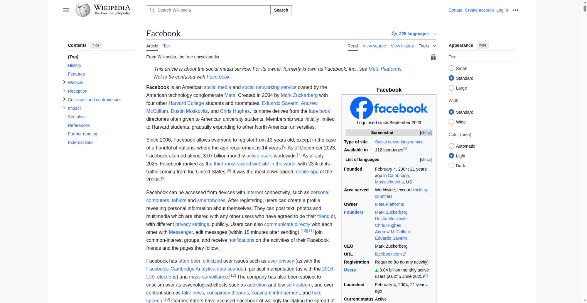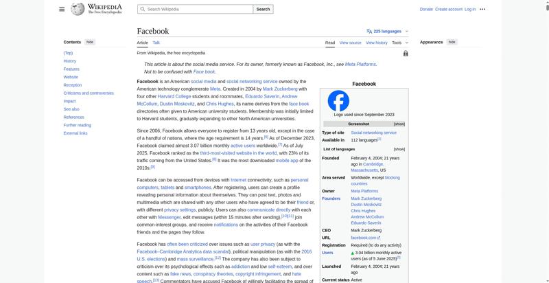 | Offenders: https://upload.wikimedia.org/wikipedia/en/thumb/1/1b/Semi-protection-shackle.svg...n-shackle.svg.png https://upload.wikimedia.org/wikipedia/commons/thumb/b/b9/2023_Facebook_icon.svg...book_icon.svg.png https://upload.wikimedia.org/wikipedia/commons/thumb/9/93/Facebook_logo_%282023%...282023%29.svg.png https://upload.wikimedia.org/wikipedia/en/6/64/Facebook_user_page.png https://upload.wikimedia.org/wikipedia/commons/thumb/b/b0/Increase2.svg/20px-Increase2.svg.png https://upload.wikimedia.org/wikipedia/commons/thumb/0/05/Meta_Platforms_Inc._lo...ropped%29.svg.png https://upload.wikimedia.org/wikipedia/commons/a/aa/Lock-red-alt-2.svg https://upload.wikimedia.org/wikipedia/commons/4/4d/Icon_pdf_file.png https://upload.wikimedia.org/wikipedia/commons/6/65/Lock-green.svg https://upload.wikimedia.org/wikipedia/commons/d/d6/Lock-gray-alt-2.svg https://upload.wikimedia.org/wikipedia/commons/thumb/f/fc/MarkZuckerberg-crop.jp...ckerberg-crop.jpg https://upload.wikimedia.org/wikipedia/en/thumb/1/12/Original-facebook.jpg/250px...inal-facebook.jpg https://upload.wikimedia.org/wikipedia/commons/thumb/0/06/Facebook.svg/250px-Facebook.svg.png https://upload.wikimedia.org/wikipedia/commons/thumb/6/69/Screen_of_Facebook_%28...ebook_%282%29.PNG https://upload.wikimedia.org/wikipedia/commons/3/38/Facebook_Like_React.png https://upload.wikimedia.org/wikipedia/commons/thumb/f/f4/Facebook_t-shirt_with_...d_for_Hackers.jpg https://upload.wikimedia.org/wikipedia/commons/thumb/5/5d/Population_pyramid_of_..._users_by_age.png https://upload.wikimedia.org/wikipedia/commons/thumb/9/9c/Facebook_censorship.sv...ensorship.svg.png https://upload.wikimedia.org/wikipedia/commons/thumb/f/f3/PRISM_Collection_Detai...ction_Details.jpg https://upload.wikimedia.org/wikipedia/commons/thumb/6/62/Onavo_logo.png/250px-Onavo_logo.png https://upload.wikimedia.org/wikipedia/commons/thumb/2/26/Hands_Off%21_protest%2...5%2C_2025-053.jpg https://upload.wikimedia.org/wikipedia/commons/thumb/c/c9/Berlin_%289163009052%2...9163009052%29.jpg https://upload.wikimedia.org/wikipedia/commons/thumb/6/61/Ad-tech_London_2010_%2..._2010_%285%29.JPG https://upload.wikimedia.org/wikipedia/commons/thumb/2/27/2011_Egyptian_protests...26_jan25_card.jpg https://upload.wikimedia.org/wikipedia/commons/thumb/9/99/SF_Pride_2014_-_Stierc...4_-_Stierch_7.jpg https://upload.wikimedia.org/wikipedia/commons/thumb/2/2a/Industry5.svg/40px-Industry5.svg.png https://upload.wikimedia.org/wikipedia/commons/thumb/f/f9/Crystal_Clear_app_linn...ghborhood.svg.png https://upload.wikimedia.org/wikipedia/en/thumb/0/06/Wiktionary-logo-v2.svg/40px...y-logo-v2.svg.png https://upload.wikimedia.org/wikipedia/en/thumb/4/4a/Commons-logo.svg/20px-Commons-logo.svg.png https://upload.wikimedia.org/wikipedia/commons/thumb/2/24/Wikinews-logo.svg/40px...news-logo.svg.png https://upload.wikimedia.org/wikipedia/commons/thumb/f/fa/Wikiquote-logo.svg/40p...uote-logo.svg.png https://upload.wikimedia.org/wikipedia/commons/thumb/3/32/Scholia_logo.svg/40px-Scholia_logo.svg.png https://upload.wikimedia.org/wikipedia/en/thumb/8/8a/OOjs_UI_icon_edit-ltr-progr...ogressive.svg.png https://en.wikipedia.org/wiki/Special:CentralAutoLogin/start?useformat=desktop&type=script&usesul3=1 https://auth.wikimedia.org/metawiki/wiki/Special:CentralAutoLogin/checkLoggedIn...gin/checkLoggedIn |