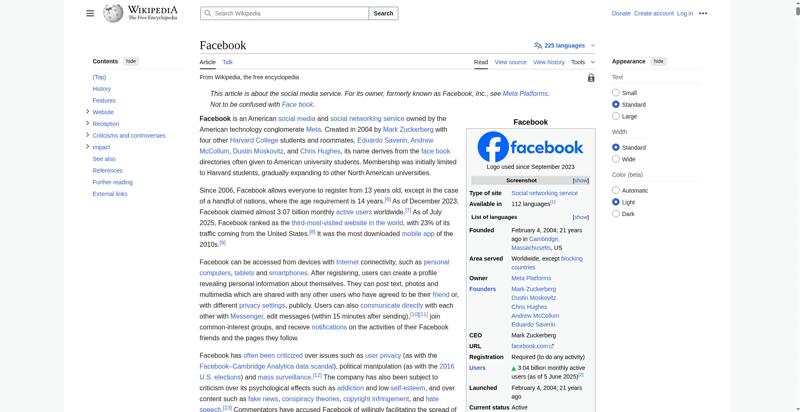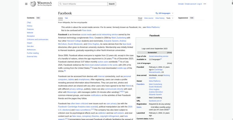 | Offenders: https://upload.wikimedia.org/wikipedia/en/thumb/1/1b/Semi-protection-shackle.svg...n-shackle.svg.png https://upload.wikimedia.org/wikipedia/commons/thumb/b/b9/2023_Facebook_icon.svg...book_icon.svg.png https://upload.wikimedia.org/wikipedia/commons/thumb/9/93/Facebook_logo_%282023%...282023%29.svg.png https://upload.wikimedia.org/wikipedia/en/6/64/Facebook_user_page.png https://upload.wikimedia.org/wikipedia/commons/thumb/b/b0/Increase2.svg/20px-Increase2.svg.png https://upload.wikimedia.org/wikipedia/commons/thumb/0/05/Meta_Platforms_Inc._lo...ropped%29.svg.png https://upload.wikimedia.org/wikipedia/commons/thumb/f/fc/MarkZuckerberg-crop.jp...ckerberg-crop.jpg https://upload.wikimedia.org/wikipedia/en/thumb/1/12/Original-facebook.jpg/250px...inal-facebook.jpg https://upload.wikimedia.org/wikipedia/commons/thumb/0/06/Facebook.svg/250px-Facebook.svg.png https://upload.wikimedia.org/wikipedia/commons/thumb/6/69/Screen_of_Facebook_%28...ebook_%282%29.PNG https://upload.wikimedia.org/wikipedia/commons/3/38/Facebook_Like_React.png https://upload.wikimedia.org/wikipedia/commons/thumb/f/f4/Facebook_t-shirt_with_...d_for_Hackers.jpg https://upload.wikimedia.org/wikipedia/commons/thumb/5/5d/Population_pyramid_of_..._users_by_age.png https://upload.wikimedia.org/wikipedia/commons/thumb/9/9c/Facebook_censorship.sv...ensorship.svg.png https://upload.wikimedia.org/wikipedia/commons/thumb/f/f3/PRISM_Collection_Detai...ction_Details.jpg https://upload.wikimedia.org/wikipedia/commons/thumb/6/62/Onavo_logo.png/250px-Onavo_logo.png https://upload.wikimedia.org/wikipedia/commons/thumb/2/26/Hands_Off%21_protest%2...5%2C_2025-053.jpg https://upload.wikimedia.org/wikipedia/commons/thumb/c/c9/Berlin_%289163009052%2...9163009052%29.jpg https://upload.wikimedia.org/wikipedia/commons/thumb/6/61/Ad-tech_London_2010_%2..._2010_%285%29.JPG https://upload.wikimedia.org/wikipedia/commons/thumb/2/27/2011_Egyptian_protests...26_jan25_card.jpg https://upload.wikimedia.org/wikipedia/commons/thumb/9/99/SF_Pride_2014_-_Stierc...4_-_Stierch_7.jpg https://upload.wikimedia.org/wikipedia/commons/thumb/2/2a/Industry5.svg/40px-Industry5.svg.png https://upload.wikimedia.org/wikipedia/commons/thumb/f/f9/Crystal_Clear_app_linn...ghborhood.svg.png https://upload.wikimedia.org/wikipedia/en/thumb/0/06/Wiktionary-logo-v2.svg/40px...y-logo-v2.svg.png https://upload.wikimedia.org/wikipedia/en/thumb/4/4a/Commons-logo.svg/20px-Commons-logo.svg.png https://upload.wikimedia.org/wikipedia/commons/thumb/2/24/Wikinews-logo.svg/40px...news-logo.svg.png https://upload.wikimedia.org/wikipedia/commons/thumb/f/fa/Wikiquote-logo.svg/40p...uote-logo.svg.png https://upload.wikimedia.org/wikipedia/commons/thumb/3/32/Scholia_logo.svg/40px-Scholia_logo.svg.png https://upload.wikimedia.org/wikipedia/en/thumb/8/8a/OOjs_UI_icon_edit-ltr-progr...ogressive.svg.png https://upload.wikimedia.org/wikipedia/commons/a/aa/Lock-red-alt-2.svg https://upload.wikimedia.org/wikipedia/commons/4/4d/Icon_pdf_file.png https://upload.wikimedia.org/wikipedia/commons/6/65/Lock-green.svg https://upload.wikimedia.org/wikipedia/commons/d/d6/Lock-gray-alt-2.svg https://en.wikipedia.org/wiki/Special:CentralAutoLogin/start?useformat=desktop&type=script&usesul3=1 https://auth.wikimedia.org/metawiki/wiki/Special:CentralAutoLogin/checkLoggedIn...gin/checkLoggedIn |