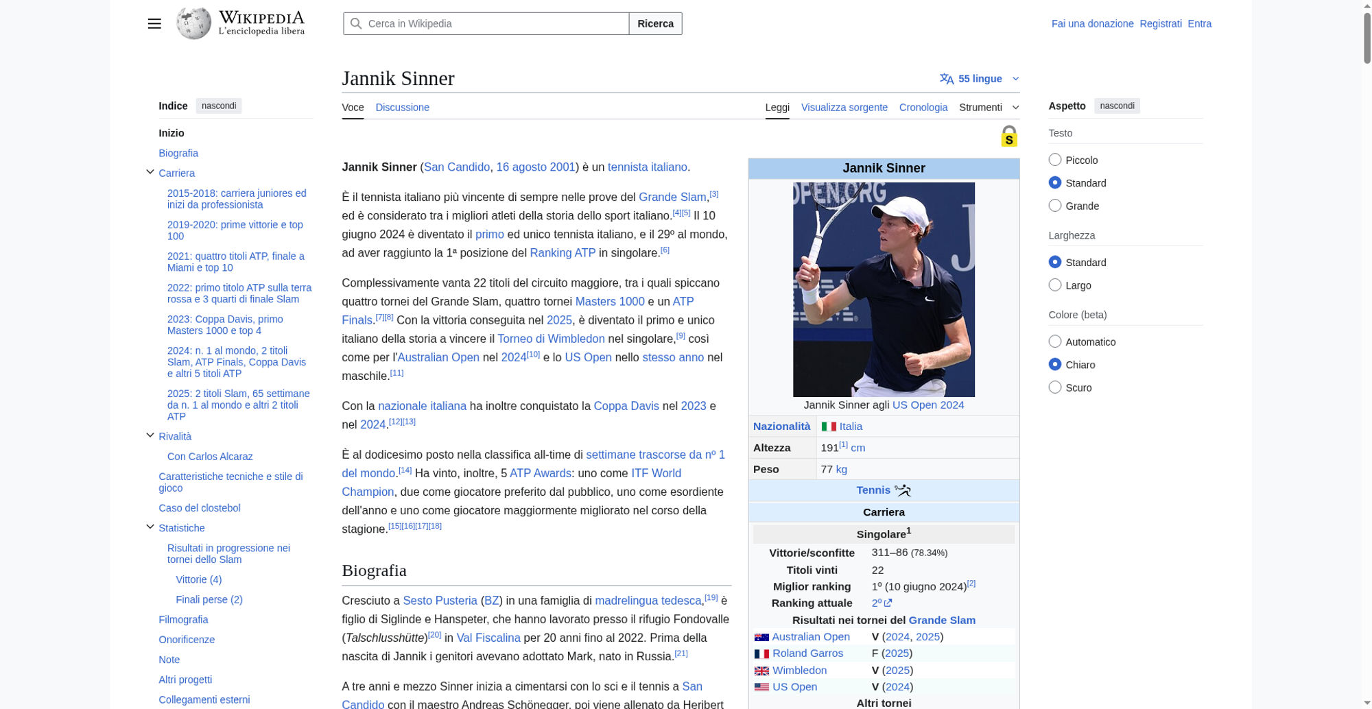 | Offenders: https://upload.wikimedia.org/wikipedia/commons/thumb/a/a5/Semi-protection-shackl...le-itwiki.svg.png https://upload.wikimedia.org/wikipedia/commons/thumb/9/97/Jannik_Sinner_%282024_...%28cropped%29.jpg https://upload.wikimedia.org/wikipedia/commons/thumb/0/03/Flag_of_Italy.svg/20px..._of_Italy.svg.png https://upload.wikimedia.org/wikipedia/commons/thumb/8/85/Tennis_pictogram.svg/4...pictogram.svg.png https://upload.wikimedia.org/wikipedia/commons/thumb/b/b9/Flag_of_Australia.svg/...Australia.svg.png https://upload.wikimedia.org/wikipedia/commons/thumb/c/c3/Flag_of_France.svg/20p...of_France.svg.png https://upload.wikimedia.org/wikipedia/commons/thumb/a/a4/Flag_of_the_United_Sta...ed_States.svg.png https://upload.wikimedia.org/wikipedia/commons/thumb/8/83/Flag_of_the_United_Kin...%283-5%29.svg.png https://upload.wikimedia.org/wikipedia/commons/thumb/3/3e/ATP_World_Tour_Finals_...London%29.svg.png https://upload.wikimedia.org/wikipedia/commons/thumb/8/8c/Transparent.png/1px-Transparent.png https://upload.wikimedia.org/wikipedia/commons/6/6a/Jannik_Sinner_logo.png https://upload.wikimedia.org/wikipedia/commons/thumb/b/be/Jannik_Sinner_after_wi...Milan%2C_2019.jpg https://upload.wikimedia.org/wikipedia/commons/thumb/f/f6/Sinner_MCM23_%288%29_%...2883593853%29.jpg https://upload.wikimedia.org/wikipedia/commons/thumb/6/66/Jannik_Sinner_%282024_...US_Open%29_01.jpg https://upload.wikimedia.org/wikipedia/commons/thumb/8/87/Magnifying_glass_icon_...icon_mgx2.svg.png https://upload.wikimedia.org/wikipedia/commons/thumb/f/f3/Flag_of_Russia.svg/20p...of_Russia.svg.png https://upload.wikimedia.org/wikipedia/commons/thumb/b/ba/Flag_of_Germany.svg/20...f_Germany.svg.png https://upload.wikimedia.org/wikipedia/commons/thumb/9/9a/Flag_of_Spain.svg/20px..._of_Spain.svg.png https://upload.wikimedia.org/wikipedia/commons/thumb/9/9c/Nastrino_Stella_Merito...tivo_2015.svg.png https://upload.wikimedia.org/wikipedia/commons/thumb/f/fa/Wikiquote-logo.svg/20p...uote-logo.svg.png https://upload.wikimedia.org/wikipedia/commons/thumb/4/4a/Commons-logo.svg/20px-Commons-logo.svg.png https://upload.wikimedia.org/wikipedia/commons/thumb/2/24/Wikinews-logo.svg/20px...news-logo.svg.png https://upload.wikimedia.org/wikipedia/commons/thumb/7/73/Blue_pencil.svg/20px-Blue_pencil.svg.png https://upload.wikimedia.org/wikipedia/commons/thumb/f/ff/Flag_of_Serbia.svg/20p...of_Serbia.svg.png https://upload.wikimedia.org/wikipedia/commons/thumb/9/9c/Flag_of_Denmark.svg/20...f_Denmark.svg.png https://upload.wikimedia.org/wikipedia/commons/thumb/0/03/Flag_of_Italy.svg/60px..._of_Italy.svg.png https://upload.wikimedia.org/wikipedia/commons/thumb/c/cb/Flag_of_Romania_%28196...931989%29.svg.png https://upload.wikimedia.org/wikipedia/commons/thumb/4/4c/Flag_of_Sweden.svg/20p...of_Sweden.svg.png https://upload.wikimedia.org/wikipedia/commons/thumb/c/cb/Flag_of_the_Czech_Repu..._Republic.svg.png https://upload.wikimedia.org/wikipedia/commons/thumb/4/41/Flag_of_Austria.svg/20...f_Austria.svg.png https://upload.wikimedia.org/wikipedia/commons/thumb/7/78/Flag_of_Chile.svg/20px..._of_Chile.svg.png https://upload.wikimedia.org/wikipedia/commons/thumb/0/05/Flag_of_Brazil.svg/20p...of_Brazil.svg.png https://upload.wikimedia.org/wikipedia/commons/thumb/f/f3/Flag_of_Switzerland.sv...itzerland.svg.png https://upload.wikimedia.org/wikipedia/commons/thumb/6/67/Crystal_Clear_app_Logi...n_Manager.svg.png https://upload.wikimedia.org/wikipedia/commons/thumb/6/61/Tennis_icon_nobkg.png/...is_icon_nobkg.png https://en.wikipedia.org/w/index.php...a.org/w/index.php https://en.wikipedia.org/w/index.php...a.org/w/index.php https://it.wikipedia.org/wiki/Special:CentralAutoLogin/start?useformat=desktop&type=script&usesul3=1 https://auth.wikimedia.org/metawiki/wiki/Special:CentralAutoLogin/checkLoggedIn...gin/checkLoggedIn |