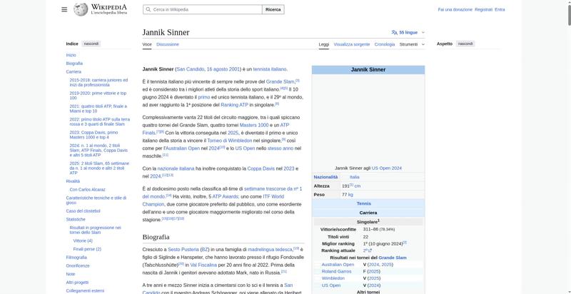 | Offenders: https://upload.wikimedia.org/wikipedia/commons/thumb/a/a5/Semi-protection-shackl...le-itwiki.svg.png https://upload.wikimedia.org/wikipedia/commons/thumb/9/97/Jannik_Sinner_%282024_...%28cropped%29.jpg https://upload.wikimedia.org/wikipedia/commons/thumb/0/03/Flag_of_Italy.svg/20px..._of_Italy.svg.png https://upload.wikimedia.org/wikipedia/commons/thumb/8/85/Tennis_pictogram.svg/4...pictogram.svg.png https://upload.wikimedia.org/wikipedia/commons/thumb/b/b9/Flag_of_Australia.svg/...Australia.svg.png https://upload.wikimedia.org/wikipedia/commons/thumb/c/c3/Flag_of_France.svg/20p...of_France.svg.png https://upload.wikimedia.org/wikipedia/commons/thumb/8/83/Flag_of_the_United_Kin...%283-5%29.svg.png https://upload.wikimedia.org/wikipedia/commons/thumb/a/a4/Flag_of_the_United_Sta...ed_States.svg.png https://upload.wikimedia.org/wikipedia/commons/6/6a/Jannik_Sinner_logo.png https://upload.wikimedia.org/wikipedia/commons/thumb/b/be/Jannik_Sinner_after_wi...Milan%2C_2019.jpg https://upload.wikimedia.org/wikipedia/commons/thumb/3/3e/ATP_World_Tour_Finals_...London%29.svg.png https://upload.wikimedia.org/wikipedia/commons/thumb/8/8c/Transparent.png/1px-Transparent.png https://upload.wikimedia.org/wikipedia/commons/thumb/f/f6/Sinner_MCM23_%288%29_%...2883593853%29.jpg https://upload.wikimedia.org/wikipedia/commons/thumb/6/66/Jannik_Sinner_%282024_...US_Open%29_01.jpg https://upload.wikimedia.org/wikipedia/commons/thumb/8/87/Magnifying_glass_icon_...icon_mgx2.svg.png https://upload.wikimedia.org/wikipedia/commons/thumb/f/f3/Flag_of_Russia.svg/20p...of_Russia.svg.png https://upload.wikimedia.org/wikipedia/commons/thumb/b/ba/Flag_of_Germany.svg/20...f_Germany.svg.png https://upload.wikimedia.org/wikipedia/commons/thumb/9/9a/Flag_of_Spain.svg/20px..._of_Spain.svg.png https://upload.wikimedia.org/wikipedia/commons/thumb/9/9c/Nastrino_Stella_Merito...tivo_2015.svg.png https://upload.wikimedia.org/wikipedia/commons/thumb/f/fa/Wikiquote-logo.svg/20p...uote-logo.svg.png https://upload.wikimedia.org/wikipedia/commons/thumb/4/4a/Commons-logo.svg/20px-Commons-logo.svg.png https://upload.wikimedia.org/wikipedia/commons/thumb/2/24/Wikinews-logo.svg/20px...news-logo.svg.png https://upload.wikimedia.org/wikipedia/commons/thumb/7/73/Blue_pencil.svg/20px-Blue_pencil.svg.png https://upload.wikimedia.org/wikipedia/commons/thumb/f/ff/Flag_of_Serbia.svg/20p...of_Serbia.svg.png https://upload.wikimedia.org/wikipedia/commons/thumb/9/9c/Flag_of_Denmark.svg/20...f_Denmark.svg.png https://upload.wikimedia.org/wikipedia/commons/thumb/0/03/Flag_of_Italy.svg/60px..._of_Italy.svg.png https://upload.wikimedia.org/wikipedia/commons/thumb/c/cb/Flag_of_Romania_%28196...931989%29.svg.png https://upload.wikimedia.org/wikipedia/commons/thumb/4/4c/Flag_of_Sweden.svg/20p...of_Sweden.svg.png https://upload.wikimedia.org/wikipedia/commons/thumb/c/cb/Flag_of_the_Czech_Repu..._Republic.svg.png https://upload.wikimedia.org/wikipedia/commons/thumb/4/41/Flag_of_Austria.svg/20...f_Austria.svg.png https://upload.wikimedia.org/wikipedia/commons/thumb/7/78/Flag_of_Chile.svg/20px..._of_Chile.svg.png https://upload.wikimedia.org/wikipedia/commons/thumb/0/05/Flag_of_Brazil.svg/20p...of_Brazil.svg.png https://upload.wikimedia.org/wikipedia/commons/thumb/f/f3/Flag_of_Switzerland.sv...itzerland.svg.png https://upload.wikimedia.org/wikipedia/commons/thumb/6/67/Crystal_Clear_app_Logi...n_Manager.svg.png https://upload.wikimedia.org/wikipedia/commons/thumb/6/61/Tennis_icon_nobkg.png/...is_icon_nobkg.png https://en.wikipedia.org/w/index.php...a.org/w/index.php https://en.wikipedia.org/w/index.php...a.org/w/index.php https://it.wikipedia.org/wiki/Special:CentralAutoLogin/start?useformat=desktop&type=script&usesul3=1 https://auth.wikimedia.org/metawiki/wiki/Special:CentralAutoLogin/checkLoggedIn...gin/checkLoggedIn |