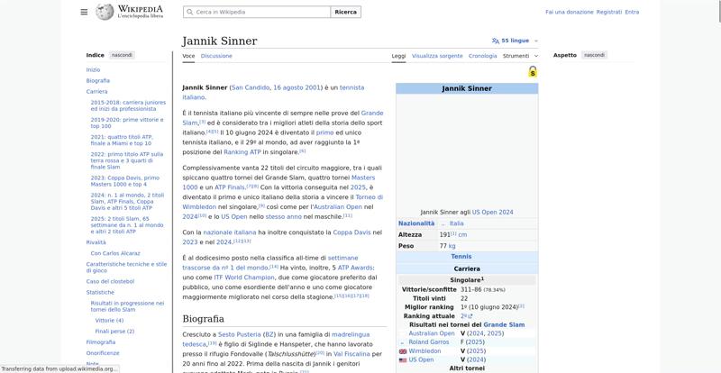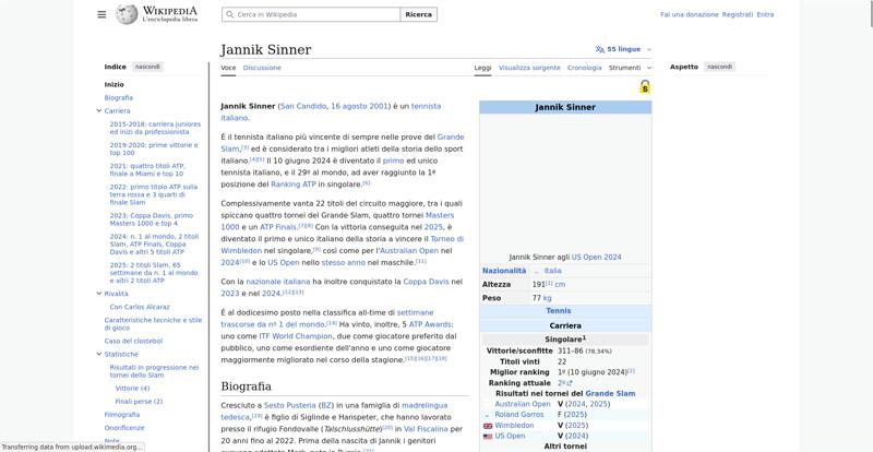 | Offenders: https://upload.wikimedia.org/wikipedia/commons/thumb/a/a5/Semi-protection-shackl...le-itwiki.svg.png https://upload.wikimedia.org/wikipedia/commons/thumb/9/97/Jannik_Sinner_%282024_...%28cropped%29.jpg https://upload.wikimedia.org/wikipedia/commons/thumb/0/03/Flag_of_Italy.svg/20px..._of_Italy.svg.png https://upload.wikimedia.org/wikipedia/commons/thumb/8/85/Tennis_pictogram.svg/4...pictogram.svg.png https://upload.wikimedia.org/wikipedia/commons/thumb/b/b9/Flag_of_Australia.svg/...Australia.svg.png https://upload.wikimedia.org/wikipedia/commons/thumb/c/c3/Flag_of_France.svg/20p...of_France.svg.png https://upload.wikimedia.org/wikipedia/commons/thumb/8/83/Flag_of_the_United_Kin...%283-5%29.svg.png https://upload.wikimedia.org/wikipedia/commons/thumb/a/a4/Flag_of_the_United_Sta...ed_States.svg.png https://upload.wikimedia.org/wikipedia/commons/thumb/3/3e/ATP_World_Tour_Finals_...London%29.svg.png https://upload.wikimedia.org/wikipedia/commons/thumb/8/8c/Transparent.png/1px-Transparent.png https://upload.wikimedia.org/wikipedia/commons/6/6a/Jannik_Sinner_logo.png https://upload.wikimedia.org/wikipedia/commons/thumb/b/be/Jannik_Sinner_after_wi...Milan%2C_2019.jpg https://upload.wikimedia.org/wikipedia/commons/thumb/f/f6/Sinner_MCM23_%288%29_%...2883593853%29.jpg https://upload.wikimedia.org/wikipedia/commons/thumb/6/66/Jannik_Sinner_%282024_...US_Open%29_01.jpg https://upload.wikimedia.org/wikipedia/commons/thumb/8/87/Magnifying_glass_icon_...icon_mgx2.svg.png https://upload.wikimedia.org/wikipedia/commons/thumb/f/f3/Flag_of_Russia.svg/20p...of_Russia.svg.png https://upload.wikimedia.org/wikipedia/commons/thumb/b/ba/Flag_of_Germany.svg/20...f_Germany.svg.png https://upload.wikimedia.org/wikipedia/commons/thumb/9/9a/Flag_of_Spain.svg/20px..._of_Spain.svg.png https://upload.wikimedia.org/wikipedia/commons/thumb/9/9c/Nastrino_Stella_Merito...tivo_2015.svg.png https://upload.wikimedia.org/wikipedia/commons/thumb/f/fa/Wikiquote-logo.svg/20p...uote-logo.svg.png https://upload.wikimedia.org/wikipedia/commons/thumb/4/4a/Commons-logo.svg/20px-Commons-logo.svg.png https://upload.wikimedia.org/wikipedia/commons/thumb/2/24/Wikinews-logo.svg/20px...news-logo.svg.png https://upload.wikimedia.org/wikipedia/commons/thumb/7/73/Blue_pencil.svg/20px-Blue_pencil.svg.png https://upload.wikimedia.org/wikipedia/commons/thumb/f/ff/Flag_of_Serbia.svg/20p...of_Serbia.svg.png https://upload.wikimedia.org/wikipedia/commons/thumb/9/9c/Flag_of_Denmark.svg/20...f_Denmark.svg.png https://upload.wikimedia.org/wikipedia/commons/thumb/0/03/Flag_of_Italy.svg/60px..._of_Italy.svg.png https://upload.wikimedia.org/wikipedia/commons/thumb/c/cb/Flag_of_Romania_%28196...931989%29.svg.png https://upload.wikimedia.org/wikipedia/commons/thumb/4/4c/Flag_of_Sweden.svg/20p...of_Sweden.svg.png https://upload.wikimedia.org/wikipedia/commons/thumb/c/cb/Flag_of_the_Czech_Repu..._Republic.svg.png https://upload.wikimedia.org/wikipedia/commons/thumb/4/41/Flag_of_Austria.svg/20...f_Austria.svg.png https://upload.wikimedia.org/wikipedia/commons/thumb/7/78/Flag_of_Chile.svg/20px..._of_Chile.svg.png https://upload.wikimedia.org/wikipedia/commons/thumb/0/05/Flag_of_Brazil.svg/20p...of_Brazil.svg.png https://upload.wikimedia.org/wikipedia/commons/thumb/f/f3/Flag_of_Switzerland.sv...itzerland.svg.png https://upload.wikimedia.org/wikipedia/commons/thumb/6/67/Crystal_Clear_app_Logi...n_Manager.svg.png https://upload.wikimedia.org/wikipedia/commons/thumb/6/61/Tennis_icon_nobkg.png/...is_icon_nobkg.png https://en.wikipedia.org/w/index.php...a.org/w/index.php https://en.wikipedia.org/w/index.php...a.org/w/index.php https://it.wikipedia.org/wiki/Special:CentralAutoLogin/start?useformat=desktop&type=script&usesul3=1 https://auth.wikimedia.org/metawiki/wiki/Special:CentralAutoLogin/checkLoggedIn...gin/checkLoggedIn |