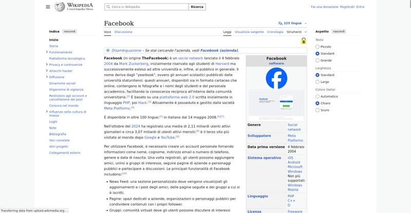 | Offenders: https://upload.wikimedia.org/wikipedia/commons/thumb/a/a5/Semi-protection-shackl...le-itwiki.svg.png https://upload.wikimedia.org/wikipedia/commons/thumb/b/bc/Nota_disambigua.svg/20...isambigua.svg.png https://upload.wikimedia.org/wikipedia/commons/thumb/b/b9/2023_Facebook_icon.svg...book_icon.svg.png https://upload.wikimedia.org/wikipedia/commons/thumb/6/69/Screen_of_Facebook_%28...ebook_%282%29.PNG https://upload.wikimedia.org/wikipedia/commons/thumb/8/87/Magnifying_glass_icon_...icon_mgx2.svg.png https://upload.wikimedia.org/wikipedia/commons/thumb/e/ef/MarkZuckerberg.jpg/250...arkZuckerberg.jpg https://upload.wikimedia.org/wikipedia/commons/thumb/4/49/Sean_Parker.jpg/250px-Sean_Parker.jpg https://upload.wikimedia.org/wikipedia/commons/thumb/f/f7/Social_networks.jpg/50...cial_networks.jpg https://upload.wikimedia.org/wikipedia/commons/thumb/c/c5/Local-important.svg/40...important.svg.png https://upload.wikimedia.org/wikipedia/commons/thumb/c/ce/Old-Facebook-Logo.jpg/...Facebook-Logo.jpg https://upload.wikimedia.org/wikipedia/commons/thumb/f/fd/Facebook-reversed.svg/...-reversed.svg.png https://upload.wikimedia.org/wikipedia/commons/thumb/8/87/Facebook_Logo_%282015%...%29_light.svg.png https://upload.wikimedia.org/wikipedia/commons/thumb/8/89/Facebook_Logo_%282019%...282019%29.svg.png https://upload.wikimedia.org/wikipedia/commons/thumb/9/93/Facebook_logo_%282023%...282023%29.svg.png https://upload.wikimedia.org/wikipedia/commons/thumb/f/fa/Wikiquote-logo.svg/20p...uote-logo.svg.png https://upload.wikimedia.org/wikipedia/commons/thumb/4/4a/Commons-logo.svg/20px-Commons-logo.svg.png https://upload.wikimedia.org/wikipedia/commons/thumb/2/24/Wikinews-logo.svg/20px...news-logo.svg.png https://upload.wikimedia.org/wikipedia/commons/thumb/7/73/Blue_pencil.svg/20px-Blue_pencil.svg.png https://upload.wikimedia.org/wikipedia/commons/thumb/7/7b/Meta_Platforms_Inc._lo...Inc._logo.svg.png https://upload.wikimedia.org/wikipedia/commons/thumb/7/70/Applications-internet....-internet.svg.png https://upload.wikimedia.org/wikipedia/commons/thumb/0/0f/People.svg/40px-People.svg.png https://en.wikipedia.org/w/index.php...a.org/w/index.php https://en.wikipedia.org/w/index.php...a.org/w/index.php https://it.wikipedia.org/wiki/Special:CentralAutoLogin/start?useformat=desktop&type=script&usesul3=1 https://auth.wikimedia.org/metawiki/wiki/Special:CentralAutoLogin/checkLoggedIn...gin/checkLoggedIn |
