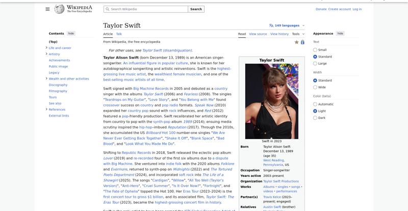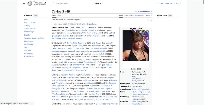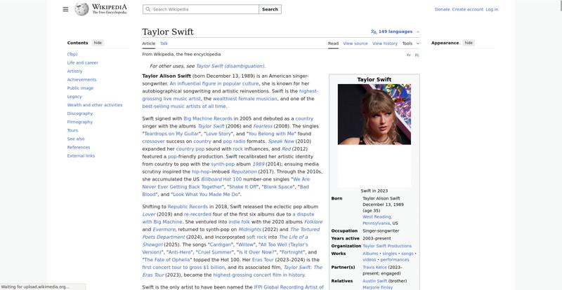 | Offenders: https://upload.wikimedia.org/wikipedia/en/thumb/e/e7/Cscr-featured.svg/20px-Cscr-featured.svg.png https://upload.wikimedia.org/wikipedia/en/thumb/8/8c/Extended-protection-shackle...n-shackle.svg.png https://upload.wikimedia.org/wikipedia/commons/thumb/b/b1/Taylor_Swift_at_the_20...wards_%283%29.png https://upload.wikimedia.org/wikipedia/en/thumb/8/8a/OOjs_UI_icon_edit-ltr-progr...ogressive.svg.png https://upload.wikimedia.org/wikipedia/commons/thumb/e/e6/Taylor_Swift_signature...signature.svg.png https://upload.wikimedia.org/wikipedia/commons/thumb/1/15/Taylor_Swift_at_Yahoo_...%28cropped%29.jpg https://upload.wikimedia.org/wikipedia/commons/thumb/e/e8/TaylorSwiftApr09.jpg/2...lorSwiftApr09.jpg https://upload.wikimedia.org/wikipedia/commons/thumb/6/6e/Taylor_Swift_2011crop....wift_2011crop.jpg https://upload.wikimedia.org/wikipedia/commons/thumb/b/b2/Taylor_Swift_Red_Tour_...our_2%2C_2013.jpg https://upload.wikimedia.org/wikipedia/commons/thumb/0/04/Taylor_Swift_045_%2817...7682880264%29.jpg https://upload.wikimedia.org/wikipedia/commons/thumb/7/7e/Taylor_Swift_Reputatio...%28cropped%29.jpg https://upload.wikimedia.org/wikipedia/commons/thumb/d/d9/191125_Taylor_Swift_at..._Music_Awards.png https://upload.wikimedia.org/wikipedia/commons/thumb/7/76/Taylor_Swift_2022_info..._2022_infobox.jpg https://upload.wikimedia.org/wikipedia/commons/thumb/5/5d/Taylor_Swift_The_Eras_...%28cropped%29.jpg https://upload.wikimedia.org/wikipedia/commons/thumb/8/87/Gnome-mime-sound-openc...enclipart.svg.png https://upload.wikimedia.org/wikipedia/commons/thumb/7/7c/Taylor_Swift_Sydney.jp..._Swift_Sydney.jpg https://upload.wikimedia.org/wikipedia/commons/thumb/1/1f/Taylor_Swift_-_Reputat...%28cropped%29.jpg https://upload.wikimedia.org/wikipedia/commons/thumb/1/1d/Taylor_Swift_2009_MTV_...%28cropped%29.jpg https://upload.wikimedia.org/wikipedia/commons/thumb/0/0a/5.3.10TaylorSwiftByDav...avidShankbone.jpg https://upload.wikimedia.org/wikipedia/commons/thumb/5/5a/Taylor_Swift_wax_figur...%28cropped%29.jpg https://upload.wikimedia.org/wikipedia/commons/thumb/c/cf/Taylor_Swift_for_Keds....wift_for_Keds.jpg https://upload.wikimedia.org/wikipedia/commons/thumb/6/6c/Audio-input-microphone...ut-microphone.png https://upload.wikimedia.org/wikipedia/en/thumb/4/4a/Commons-logo.svg/20px-Commons-logo.svg.png https://upload.wikimedia.org/wikipedia/commons/thumb/2/24/Wikinews-logo.svg/40px...news-logo.svg.png https://upload.wikimedia.org/wikipedia/commons/thumb/f/fa/Wikiquote-logo.svg/40p...uote-logo.svg.png https://upload.wikimedia.org/wikipedia/commons/thumb/f/ff/Wikidata-logo.svg/40px...data-logo.svg.png https://upload.wikimedia.org/wikipedia/en/thumb/9/96/Symbol_category_class.svg/2...ory_class.svg.png https://upload.wikimedia.org/wikipedia/commons/d/d6/Lock-gray-alt-2.svg https://upload.wikimedia.org/wikipedia/commons/a/aa/Lock-red-alt-2.svg https://upload.wikimedia.org/wikipedia/commons/4/4d/Icon_pdf_file.png https://upload.wikimedia.org/wikipedia/commons/6/65/Lock-green.svg https://en.wikipedia.org/wiki/Special:CentralAutoLogin/start?useformat=desktop&type=script&usesul3=1 https://meta.wikimedia.org/w/index.php...a.org/w/index.php https://auth.wikimedia.org/metawiki/wiki/Special:CentralAutoLogin/checkLoggedIn...gin/checkLoggedIn |