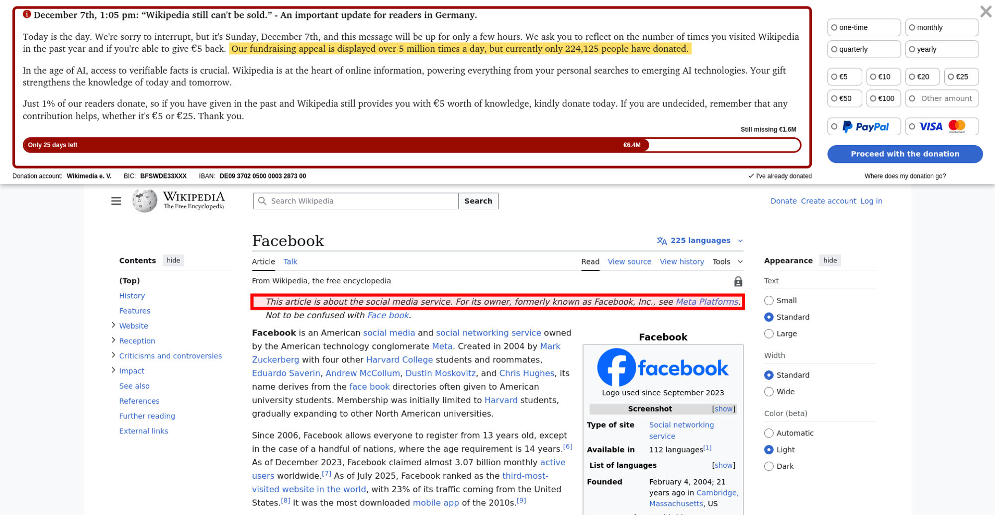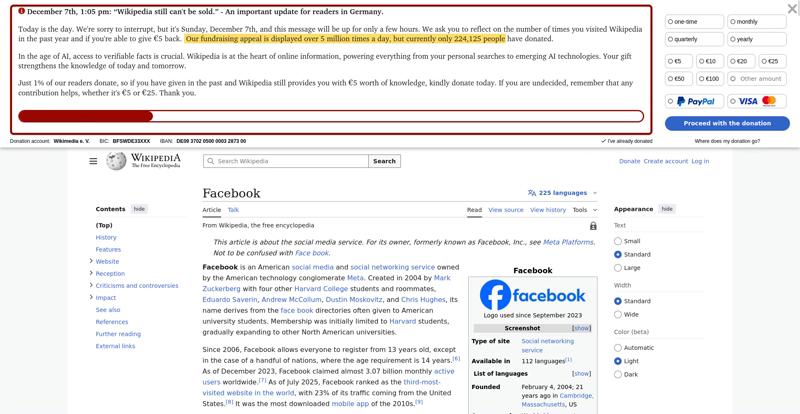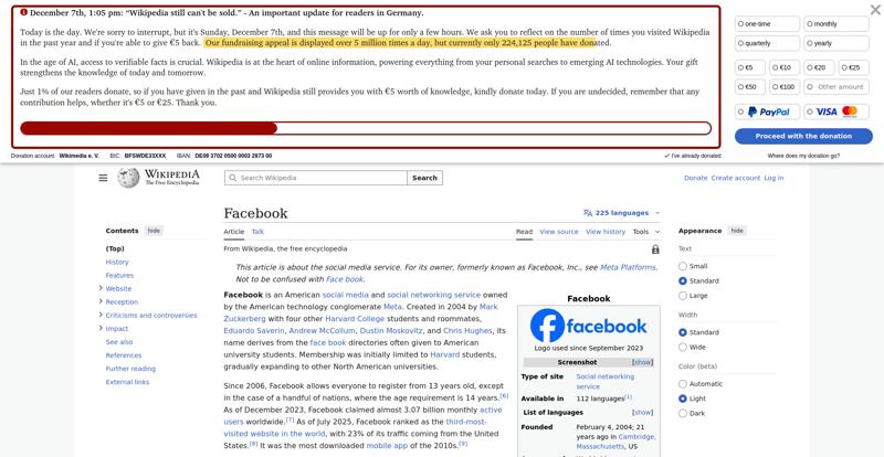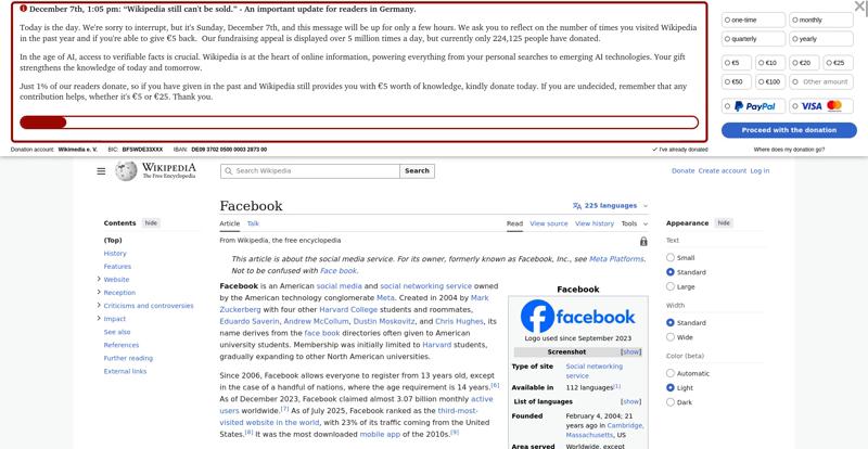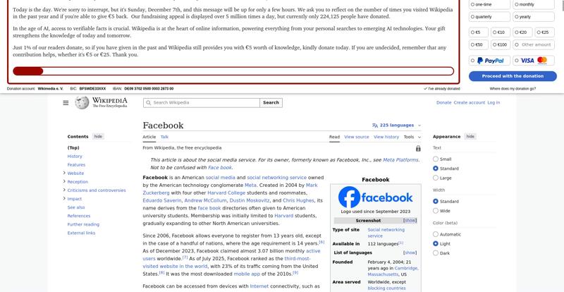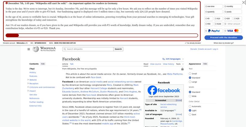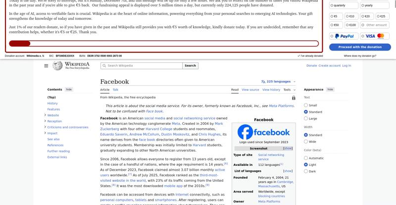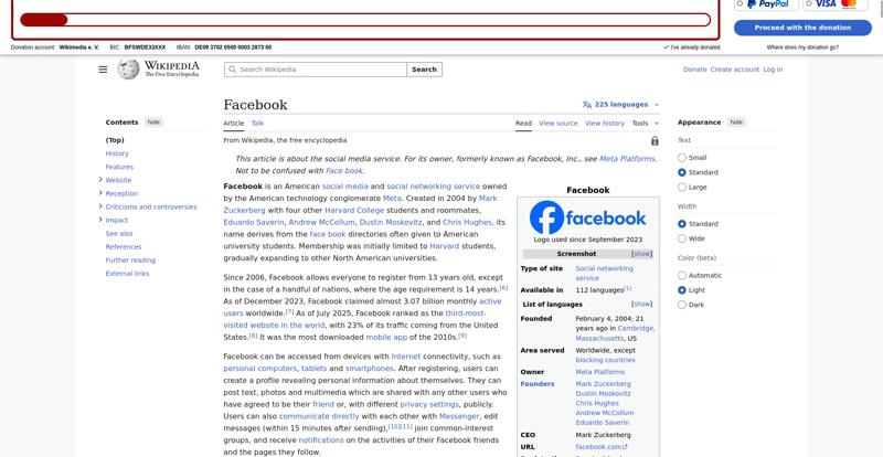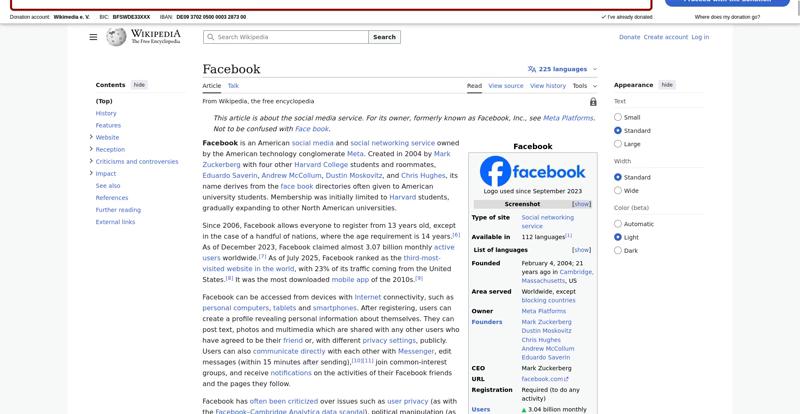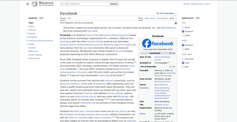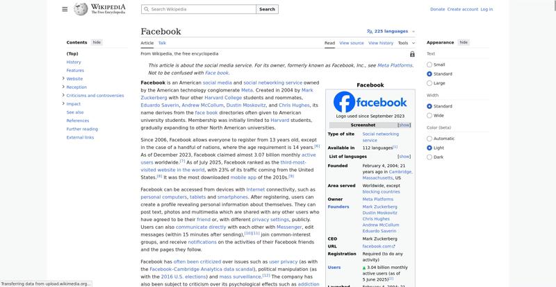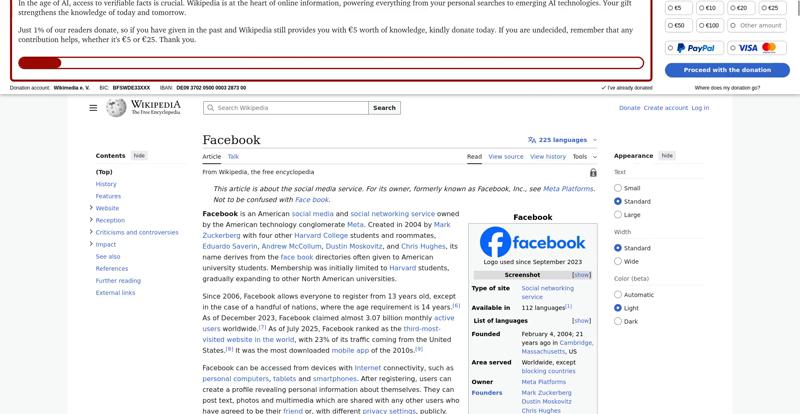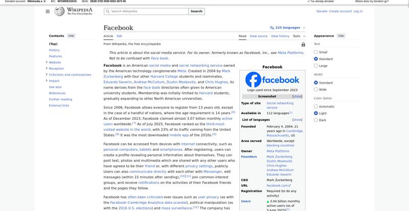 | Offenders: https://upload.wikimedia.org/wikipedia/en/thumb/1/1b/Semi-protection-shackle.svg...n-shackle.svg.png https://upload.wikimedia.org/wikipedia/commons/thumb/b/b9/2023_Facebook_icon.svg...book_icon.svg.png https://upload.wikimedia.org/wikipedia/commons/thumb/9/93/Facebook_logo_%282023%...282023%29.svg.png https://upload.wikimedia.org/wikipedia/en/6/64/Facebook_user_page.png https://upload.wikimedia.org/wikipedia/commons/thumb/b/b0/Increase2.svg/20px-Increase2.svg.png https://upload.wikimedia.org/wikipedia/commons/thumb/0/05/Meta_Platforms_Inc._lo...ropped%29.svg.png https://upload.wikimedia.org/wikipedia/commons/3/38/Facebook_Like_React.png https://upload.wikimedia.org/wikipedia/commons/thumb/f/fc/MarkZuckerberg-crop.jp...ckerberg-crop.jpg https://upload.wikimedia.org/wikipedia/en/thumb/1/12/Original-facebook.jpg/250px...inal-facebook.jpg https://upload.wikimedia.org/wikipedia/commons/thumb/0/06/Facebook.svg/250px-Facebook.svg.png https://upload.wikimedia.org/wikipedia/commons/thumb/6/69/Screen_of_Facebook_%28...ebook_%282%29.PNG https://upload.wikimedia.org/wikipedia/commons/thumb/f/f4/Facebook_t-shirt_with_...d_for_Hackers.jpg https://upload.wikimedia.org/wikipedia/commons/thumb/5/5d/Population_pyramid_of_..._users_by_age.png https://upload.wikimedia.org/wikipedia/commons/thumb/9/9c/Facebook_censorship.sv...ensorship.svg.png https://upload.wikimedia.org/wikipedia/commons/thumb/f/f3/PRISM_Collection_Detai...ction_Details.jpg https://upload.wikimedia.org/wikipedia/commons/thumb/6/62/Onavo_logo.png/250px-Onavo_logo.png https://upload.wikimedia.org/wikipedia/commons/thumb/2/26/Hands_Off%21_protest%2...5%2C_2025-053.jpg https://upload.wikimedia.org/wikipedia/commons/thumb/c/c9/Berlin_%289163009052%2...9163009052%29.jpg https://upload.wikimedia.org/wikipedia/commons/thumb/6/61/Ad-tech_London_2010_%2..._2010_%285%29.JPG https://upload.wikimedia.org/wikipedia/commons/thumb/2/27/2011_Egyptian_protests...26_jan25_card.jpg https://upload.wikimedia.org/wikipedia/commons/thumb/9/99/SF_Pride_2014_-_Stierc...4_-_Stierch_7.jpg https://upload.wikimedia.org/wikipedia/commons/thumb/2/2a/Industry5.svg/40px-Industry5.svg.png https://upload.wikimedia.org/wikipedia/commons/thumb/f/f9/Crystal_Clear_app_linn...ghborhood.svg.png https://upload.wikimedia.org/wikipedia/en/thumb/0/06/Wiktionary-logo-v2.svg/40px...y-logo-v2.svg.png https://upload.wikimedia.org/wikipedia/en/thumb/4/4a/Commons-logo.svg/20px-Commons-logo.svg.png https://upload.wikimedia.org/wikipedia/commons/thumb/2/24/Wikinews-logo.svg/40px...news-logo.svg.png https://upload.wikimedia.org/wikipedia/commons/thumb/f/fa/Wikiquote-logo.svg/40p...uote-logo.svg.png https://upload.wikimedia.org/wikipedia/commons/thumb/3/32/Scholia_logo.svg/40px-Scholia_logo.svg.png https://upload.wikimedia.org/wikipedia/en/thumb/8/8a/OOjs_UI_icon_edit-ltr-progr...ogressive.svg.png https://upload.wikimedia.org/wikipedia/commons/a/aa/Lock-red-alt-2.svg https://upload.wikimedia.org/wikipedia/commons/4/4d/Icon_pdf_file.png https://upload.wikimedia.org/wikipedia/commons/6/65/Lock-green.svg https://upload.wikimedia.org/wikipedia/commons/d/d6/Lock-gray-alt-2.svg https://en.wikipedia.org/wiki/Special:CentralAutoLogin/start?useformat=desktop&type=script&usesul3=1 https://meta.wikimedia.org/w/index.php...a.org/w/index.php https://auth.wikimedia.org/metawiki/wiki/Special:CentralAutoLogin/checkLoggedIn...gin/checkLoggedIn |