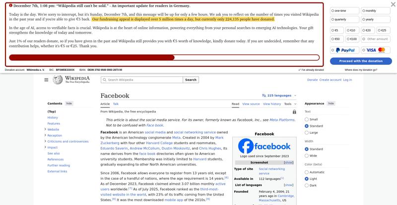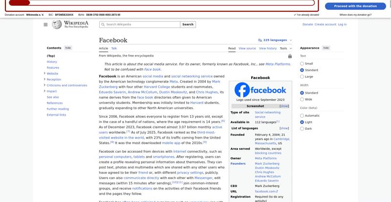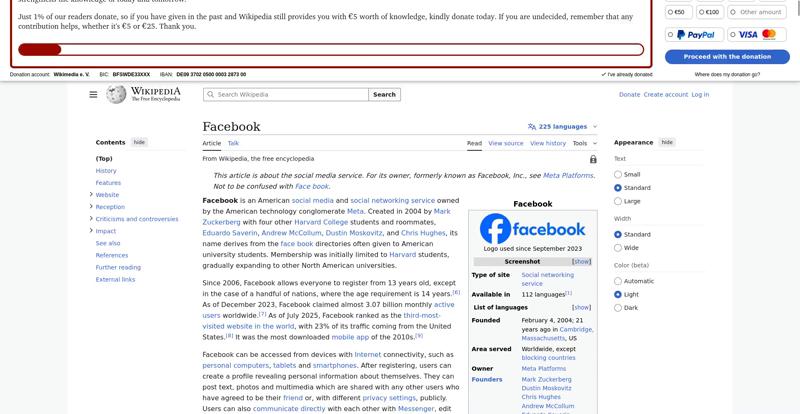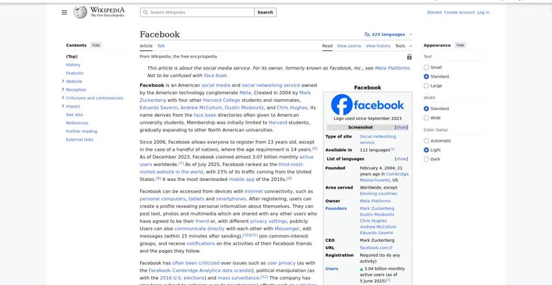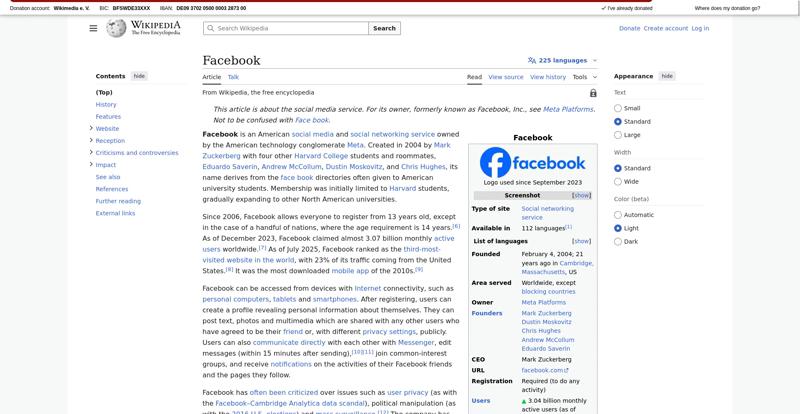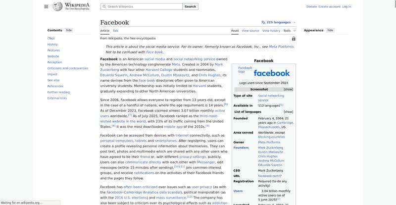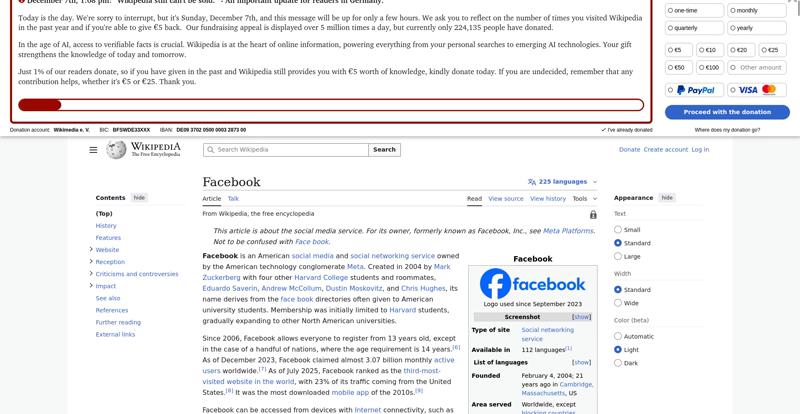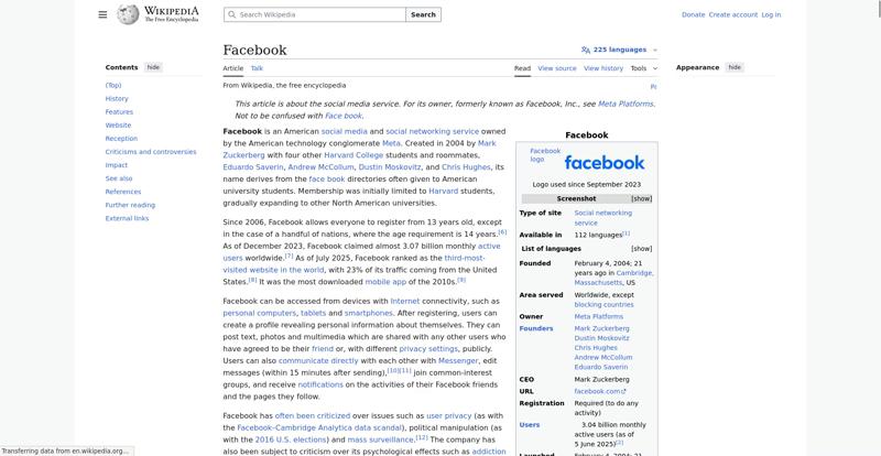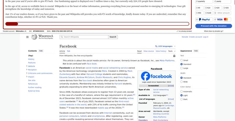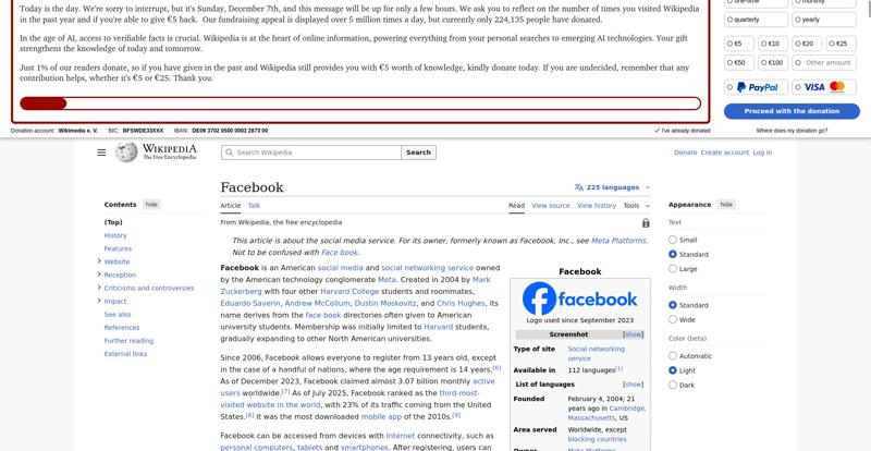 | Offenders: https://upload.wikimedia.org/wikipedia/en/thumb/1/1b/Semi-protection-shackle.svg...n-shackle.svg.png https://upload.wikimedia.org/wikipedia/commons/thumb/b/b9/2023_Facebook_icon.svg...book_icon.svg.png https://upload.wikimedia.org/wikipedia/commons/thumb/9/93/Facebook_logo_%282023%...282023%29.svg.png https://upload.wikimedia.org/wikipedia/en/6/64/Facebook_user_page.png https://upload.wikimedia.org/wikipedia/commons/thumb/b/b0/Increase2.svg/20px-Increase2.svg.png https://upload.wikimedia.org/wikipedia/commons/thumb/0/05/Meta_Platforms_Inc._lo...ropped%29.svg.png https://upload.wikimedia.org/wikipedia/commons/3/38/Facebook_Like_React.png https://upload.wikimedia.org/wikipedia/commons/thumb/f/fc/MarkZuckerberg-crop.jp...ckerberg-crop.jpg https://upload.wikimedia.org/wikipedia/en/thumb/1/12/Original-facebook.jpg/250px...inal-facebook.jpg https://upload.wikimedia.org/wikipedia/commons/thumb/0/06/Facebook.svg/250px-Facebook.svg.png https://upload.wikimedia.org/wikipedia/commons/thumb/6/69/Screen_of_Facebook_%28...ebook_%282%29.PNG https://upload.wikimedia.org/wikipedia/commons/thumb/f/f4/Facebook_t-shirt_with_...d_for_Hackers.jpg https://upload.wikimedia.org/wikipedia/commons/thumb/5/5d/Population_pyramid_of_..._users_by_age.png https://upload.wikimedia.org/wikipedia/commons/thumb/9/9c/Facebook_censorship.sv...ensorship.svg.png https://upload.wikimedia.org/wikipedia/commons/thumb/f/f3/PRISM_Collection_Detai...ction_Details.jpg https://upload.wikimedia.org/wikipedia/commons/thumb/6/62/Onavo_logo.png/250px-Onavo_logo.png https://upload.wikimedia.org/wikipedia/commons/thumb/2/26/Hands_Off%21_protest%2...5%2C_2025-053.jpg https://upload.wikimedia.org/wikipedia/commons/thumb/c/c9/Berlin_%289163009052%2...9163009052%29.jpg https://upload.wikimedia.org/wikipedia/commons/thumb/6/61/Ad-tech_London_2010_%2..._2010_%285%29.JPG https://upload.wikimedia.org/wikipedia/commons/thumb/2/27/2011_Egyptian_protests...26_jan25_card.jpg https://upload.wikimedia.org/wikipedia/commons/thumb/9/99/SF_Pride_2014_-_Stierc...4_-_Stierch_7.jpg https://upload.wikimedia.org/wikipedia/commons/thumb/2/2a/Industry5.svg/40px-Industry5.svg.png https://upload.wikimedia.org/wikipedia/commons/thumb/f/f9/Crystal_Clear_app_linn...ghborhood.svg.png https://upload.wikimedia.org/wikipedia/en/thumb/0/06/Wiktionary-logo-v2.svg/40px...y-logo-v2.svg.png https://upload.wikimedia.org/wikipedia/en/thumb/4/4a/Commons-logo.svg/20px-Commons-logo.svg.png https://upload.wikimedia.org/wikipedia/commons/thumb/2/24/Wikinews-logo.svg/40px...news-logo.svg.png https://upload.wikimedia.org/wikipedia/commons/thumb/f/fa/Wikiquote-logo.svg/40p...uote-logo.svg.png https://upload.wikimedia.org/wikipedia/commons/thumb/3/32/Scholia_logo.svg/40px-Scholia_logo.svg.png https://upload.wikimedia.org/wikipedia/en/thumb/8/8a/OOjs_UI_icon_edit-ltr-progr...ogressive.svg.png https://upload.wikimedia.org/wikipedia/commons/a/aa/Lock-red-alt-2.svg https://upload.wikimedia.org/wikipedia/commons/4/4d/Icon_pdf_file.png https://upload.wikimedia.org/wikipedia/commons/6/65/Lock-green.svg https://upload.wikimedia.org/wikipedia/commons/d/d6/Lock-gray-alt-2.svg https://en.wikipedia.org/wiki/Special:CentralAutoLogin/start?useformat=desktop&type=script&usesul3=1 https://meta.wikimedia.org/w/index.php...a.org/w/index.php https://auth.wikimedia.org/metawiki/wiki/Special:CentralAutoLogin/checkLoggedIn...gin/checkLoggedIn |