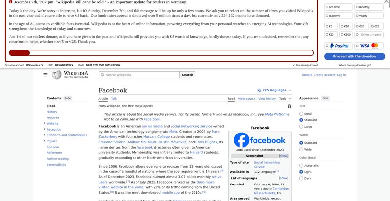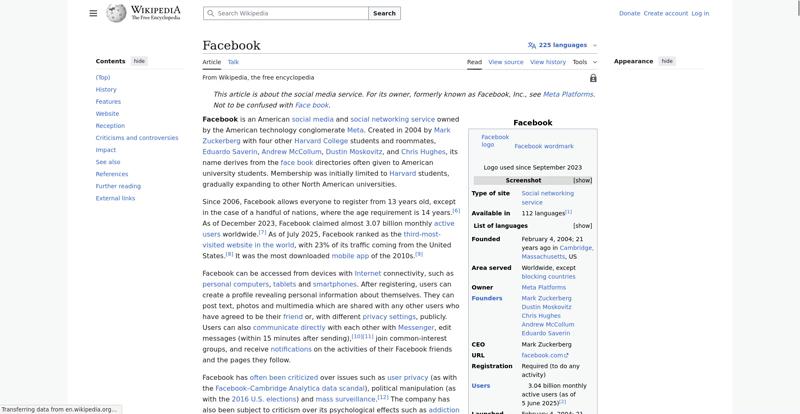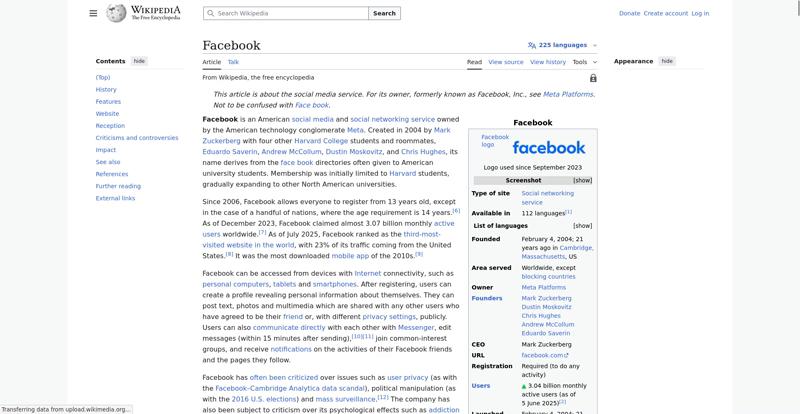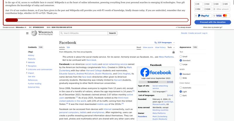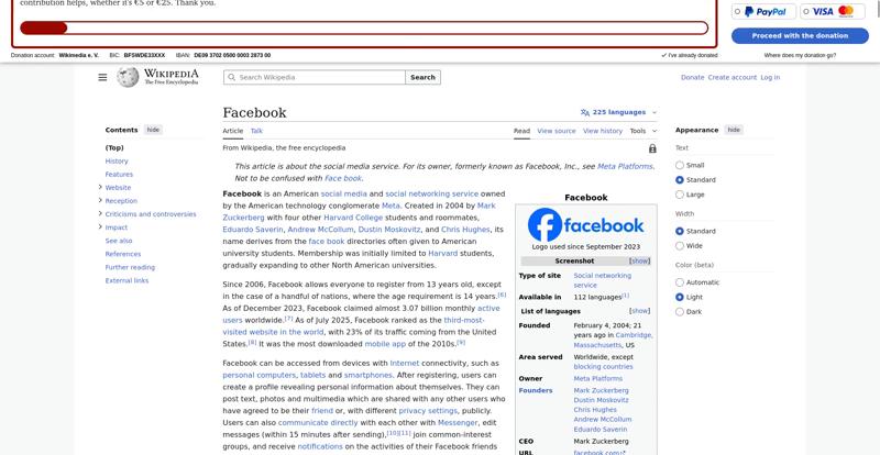 | Offenders: https://upload.wikimedia.org/wikipedia/en/thumb/1/1b/Semi-protection-shackle.svg...n-shackle.svg.png https://upload.wikimedia.org/wikipedia/commons/thumb/b/b9/2023_Facebook_icon.svg...book_icon.svg.png https://upload.wikimedia.org/wikipedia/commons/thumb/9/93/Facebook_logo_%282023%...282023%29.svg.png https://upload.wikimedia.org/wikipedia/en/6/64/Facebook_user_page.png https://upload.wikimedia.org/wikipedia/commons/thumb/b/b0/Increase2.svg/20px-Increase2.svg.png https://upload.wikimedia.org/wikipedia/commons/thumb/0/05/Meta_Platforms_Inc._lo...ropped%29.svg.png https://upload.wikimedia.org/wikipedia/commons/3/38/Facebook_Like_React.png https://upload.wikimedia.org/wikipedia/commons/thumb/f/fc/MarkZuckerberg-crop.jp...ckerberg-crop.jpg https://upload.wikimedia.org/wikipedia/en/thumb/1/12/Original-facebook.jpg/250px...inal-facebook.jpg https://upload.wikimedia.org/wikipedia/commons/thumb/0/06/Facebook.svg/250px-Facebook.svg.png https://upload.wikimedia.org/wikipedia/commons/thumb/6/69/Screen_of_Facebook_%28...ebook_%282%29.PNG https://upload.wikimedia.org/wikipedia/commons/thumb/f/f4/Facebook_t-shirt_with_...d_for_Hackers.jpg https://upload.wikimedia.org/wikipedia/commons/thumb/5/5d/Population_pyramid_of_..._users_by_age.png https://upload.wikimedia.org/wikipedia/commons/thumb/9/9c/Facebook_censorship.sv...ensorship.svg.png https://upload.wikimedia.org/wikipedia/commons/thumb/f/f3/PRISM_Collection_Detai...ction_Details.jpg https://upload.wikimedia.org/wikipedia/commons/thumb/6/62/Onavo_logo.png/250px-Onavo_logo.png https://upload.wikimedia.org/wikipedia/commons/thumb/2/26/Hands_Off%21_protest%2...5%2C_2025-053.jpg https://upload.wikimedia.org/wikipedia/commons/thumb/c/c9/Berlin_%289163009052%2...9163009052%29.jpg https://upload.wikimedia.org/wikipedia/commons/thumb/6/61/Ad-tech_London_2010_%2..._2010_%285%29.JPG https://upload.wikimedia.org/wikipedia/commons/thumb/2/27/2011_Egyptian_protests...26_jan25_card.jpg https://upload.wikimedia.org/wikipedia/commons/thumb/9/99/SF_Pride_2014_-_Stierc...4_-_Stierch_7.jpg https://upload.wikimedia.org/wikipedia/commons/thumb/2/2a/Industry5.svg/40px-Industry5.svg.png https://upload.wikimedia.org/wikipedia/commons/thumb/f/f9/Crystal_Clear_app_linn...ghborhood.svg.png https://upload.wikimedia.org/wikipedia/en/thumb/0/06/Wiktionary-logo-v2.svg/40px...y-logo-v2.svg.png https://upload.wikimedia.org/wikipedia/en/thumb/4/4a/Commons-logo.svg/20px-Commons-logo.svg.png https://upload.wikimedia.org/wikipedia/commons/thumb/2/24/Wikinews-logo.svg/40px...news-logo.svg.png https://upload.wikimedia.org/wikipedia/commons/thumb/f/fa/Wikiquote-logo.svg/40p...uote-logo.svg.png https://upload.wikimedia.org/wikipedia/commons/thumb/3/32/Scholia_logo.svg/40px-Scholia_logo.svg.png https://upload.wikimedia.org/wikipedia/en/thumb/8/8a/OOjs_UI_icon_edit-ltr-progr...ogressive.svg.png https://upload.wikimedia.org/wikipedia/commons/a/aa/Lock-red-alt-2.svg https://upload.wikimedia.org/wikipedia/commons/4/4d/Icon_pdf_file.png https://upload.wikimedia.org/wikipedia/commons/6/65/Lock-green.svg https://upload.wikimedia.org/wikipedia/commons/d/d6/Lock-gray-alt-2.svg https://en.wikipedia.org/wiki/Special:CentralAutoLogin/start?useformat=desktop&type=script&usesul3=1 https://meta.wikimedia.org/w/index.php...a.org/w/index.php https://auth.wikimedia.org/metawiki/wiki/Special:CentralAutoLogin/checkLoggedIn...gin/checkLoggedIn |
