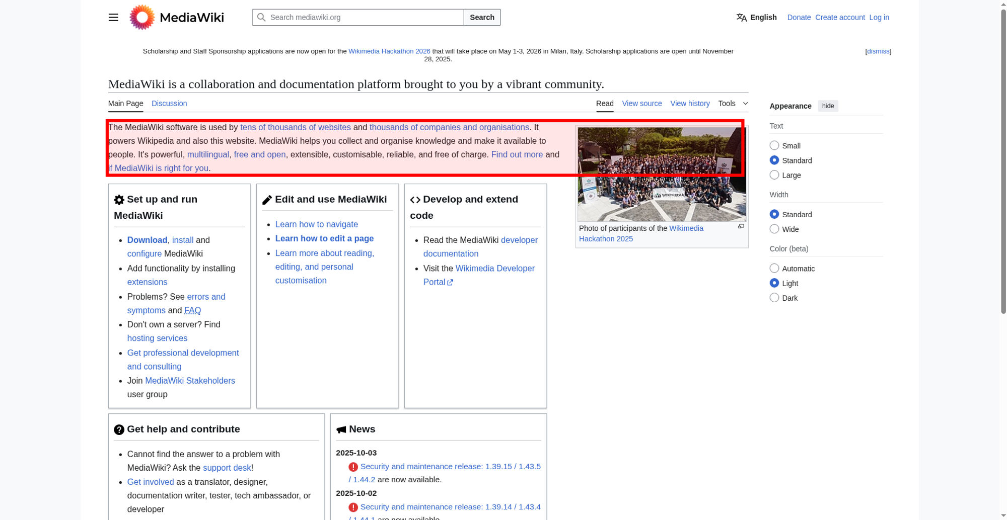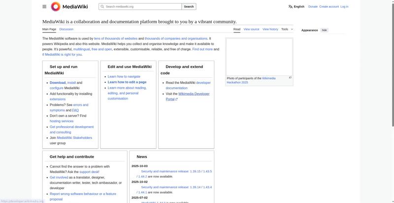 | <img src="//upload.wikimedia.org/wikipedia/commons/thumb/e/e4/Wikimedia_Hackathon_2025_Group_photo_from_drone.jpg/330px-Wikimedia_Hackathon_2025_Group_photo_from_drone.jpg" decoding="async" width="320" height="180" class="mw-file-element" srcset="//upload.wikimedia.org/wikipedia/commons/thumb/e/e4/Wikimedia_Hackathon_2025_Group_photo_from_drone.jpg/500px-Wikimedia_Hackathon_2025_Group_photo_from_drone.jpg 1.5x, //upload.wikimedia.org/wikipedia/commons/thumb/e/e4/Wikimedia_Hackathon_2025_Group_photo_from_drone.jpg/960px-Wikimedia_Hackathon_2025_Group_photo_from_drone.jpg 2x" data-file-width="3775" data-file-height="2119"> | |||||