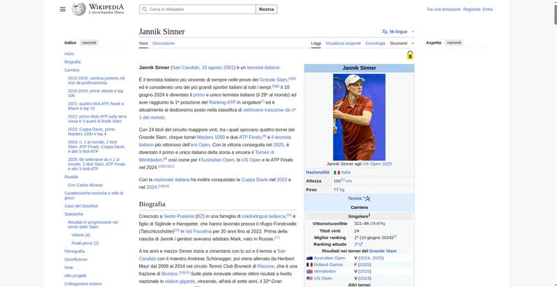 | <img src="//upload.wikimedia.org/wikipedia/commons/thumb/4/48/Jannik_Sinner_US_Open_2025_%28cropped%29.jpg/250px-Jannik_Sinner_US_Open_2025_%28cropped%29.jpg" decoding="async" width="180" height="300" class="mw-file-element" srcset="//upload.wikimedia.org/wikipedia/commons/thumb/4/48/Jannik_Sinner_US_Open_2025_%28cropped%29.jpg/330px-Jannik_Sinner_US_Open_2025_%28cropped%29.jpg 1.5x, //upload.wikimedia.org/wikipedia/commons/thumb/4/48/Jannik_Sinner_US_Open_2025_%28cropped%29.jpg/500px-Jannik_Sinner_US_Open_2025_%28cropped%29.jpg 2x" data-file-width="1204" data-file-height="2000"> | |||||