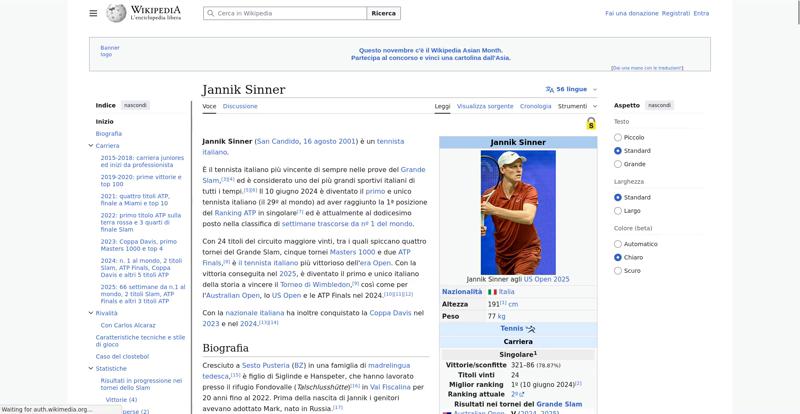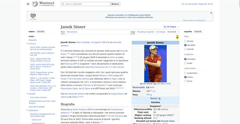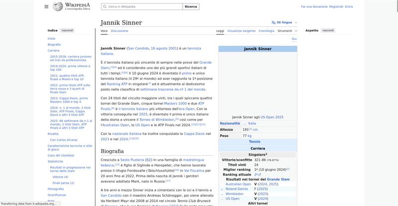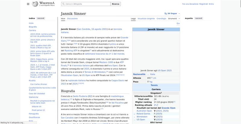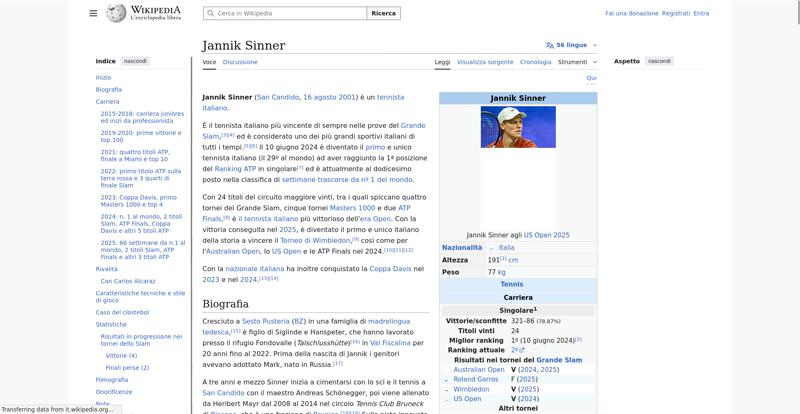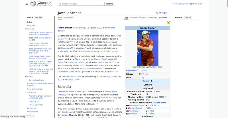 | Offenders: https://upload.wikimedia.org/wikipedia/commons/thumb/a/a5/Semi-protection-shackl...le-itwiki.svg.png https://upload.wikimedia.org/wikipedia/commons/thumb/4/48/Jannik_Sinner_US_Open_...%28cropped%29.jpg https://upload.wikimedia.org/wikipedia/commons/thumb/0/03/Flag_of_Italy.svg/20px..._of_Italy.svg.png https://upload.wikimedia.org/wikipedia/commons/thumb/8/85/Tennis_pictogram.svg/4...pictogram.svg.png https://upload.wikimedia.org/wikipedia/commons/thumb/b/b9/Flag_of_Australia.svg/...Australia.svg.png https://upload.wikimedia.org/wikipedia/commons/thumb/c/c3/Flag_of_France.svg/20p...of_France.svg.png https://upload.wikimedia.org/wikipedia/commons/thumb/8/83/Flag_of_the_United_Kin...%283-5%29.svg.png https://upload.wikimedia.org/wikipedia/commons/thumb/a/a4/Flag_of_the_United_Sta...ed_States.svg.png https://upload.wikimedia.org/wikipedia/commons/thumb/3/3e/ATP_World_Tour_Finals_...London%29.svg.png https://upload.wikimedia.org/wikipedia/commons/thumb/8/8c/Transparent.png/16px-Transparent.png https://upload.wikimedia.org/wikipedia/commons/6/6a/Jannik_Sinner_logo.png https://upload.wikimedia.org/wikipedia/commons/thumb/b/be/Jannik_Sinner_after_wi...Milan%2C_2019.jpg https://upload.wikimedia.org/wikipedia/commons/thumb/f/f6/Sinner_MCM23_%288%29_%...2883593853%29.jpg https://upload.wikimedia.org/wikipedia/commons/thumb/6/66/Jannik_Sinner_%282024_...US_Open%29_01.jpg https://upload.wikimedia.org/wikipedia/commons/thumb/8/87/Magnifying_glass_icon_...icon_mgx2.svg.png https://upload.wikimedia.org/wikipedia/commons/thumb/f/f3/Flag_of_Russia.svg/20p...of_Russia.svg.png https://upload.wikimedia.org/wikipedia/commons/thumb/b/ba/Flag_of_Germany.svg/20...f_Germany.svg.png https://upload.wikimedia.org/wikipedia/commons/thumb/9/9a/Flag_of_Spain.svg/20px..._of_Spain.svg.png https://upload.wikimedia.org/wikipedia/commons/thumb/9/9c/Nastrino_Stella_Merito...tivo_2015.svg.png https://upload.wikimedia.org/wikipedia/commons/thumb/f/fa/Wikiquote-logo.svg/20p...uote-logo.svg.png https://upload.wikimedia.org/wikipedia/commons/thumb/4/4a/Commons-logo.svg/20px-Commons-logo.svg.png https://upload.wikimedia.org/wikipedia/commons/thumb/2/24/Wikinews-logo.svg/20px...news-logo.svg.png https://upload.wikimedia.org/wikipedia/commons/thumb/7/73/Blue_pencil.svg/20px-Blue_pencil.svg.png https://upload.wikimedia.org/wikipedia/commons/thumb/f/ff/Flag_of_Serbia.svg/20p...of_Serbia.svg.png https://upload.wikimedia.org/wikipedia/commons/thumb/c/cf/Flag_of_Canada.svg/20p...of_Canada.svg.png https://upload.wikimedia.org/wikipedia/commons/thumb/0/03/Flag_of_Italy.svg/60px..._of_Italy.svg.png https://upload.wikimedia.org/wikipedia/commons/thumb/c/cb/Flag_of_Romania_%28196...931989%29.svg.png https://upload.wikimedia.org/wikipedia/commons/thumb/4/4c/Flag_of_Sweden.svg/20p...of_Sweden.svg.png https://upload.wikimedia.org/wikipedia/commons/thumb/c/cb/Flag_of_the_Czech_Repu..._Republic.svg.png https://upload.wikimedia.org/wikipedia/commons/thumb/4/41/Flag_of_Austria.svg/20...f_Austria.svg.png https://upload.wikimedia.org/wikipedia/commons/thumb/7/78/Flag_of_Chile.svg/20px..._of_Chile.svg.png https://upload.wikimedia.org/wikipedia/commons/thumb/0/05/Flag_of_Brazil.svg/20p...of_Brazil.svg.png https://upload.wikimedia.org/wikipedia/commons/thumb/f/f3/Flag_of_Switzerland.sv...itzerland.svg.png https://upload.wikimedia.org/wikipedia/commons/thumb/6/67/Crystal_Clear_app_Logi...n_Manager.svg.png https://upload.wikimedia.org/wikipedia/commons/thumb/6/61/Tennis_icon_nobkg.png/...is_icon_nobkg.png https://en.wikipedia.org/w/index.php...a.org/w/index.php https://en.wikipedia.org/w/index.php...a.org/w/index.php https://it.wikipedia.org/wiki/Special:CentralAutoLogin/start?useformat=desktop&type=script&usesul3=1 https://meta.wikimedia.org/w/index.php...a.org/w/index.php https://auth.wikimedia.org/metawiki/wiki/Special:CentralAutoLogin/checkLoggedIn...gin/checkLoggedIn https://upload.wikimedia.org/wikipedia/commons/7/71/Wikipedia_Asian_Month_Logo.svg https://upload.wikimedia.org/wikipedia/donate/a/ac/Close_oojs.png |