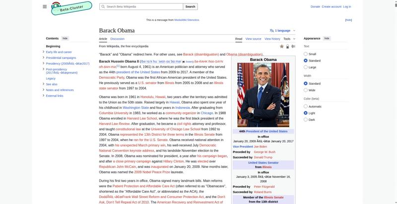 | Offenders: https://en.wikipedia.beta.wmcloud.org/static/images/project-logos/wikimedia-cloud-services.svg https://upload.wikimedia.org/wikipedia/commons/thumb/1/11/Barack_Obama_signature...signature.svg.png https://upload.wikimedia.org/wikipedia/commons/thumb/5/50/2004_Illinois_Senate_r...e_results.svg.png https://upload.wikimedia.org/wikipedia/commons/thumb/2/2b/58th_Presidential_Inau...-D-BP749-1327.jpg https://upload.wikimedia.org/wikipedia/commons/thumb/9/9f/Job_Growth_by_U.S._Pre...resident_-_v1.png |