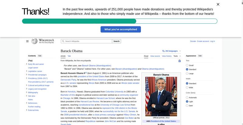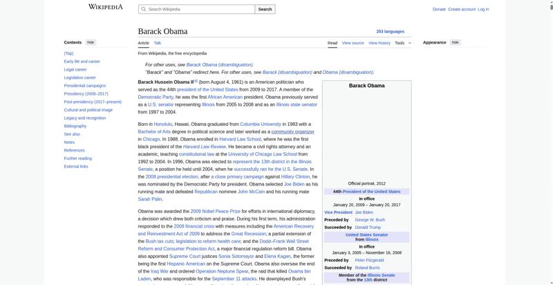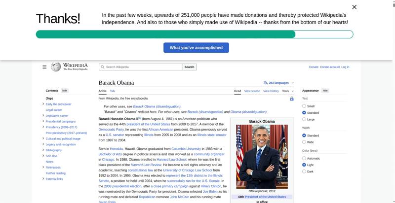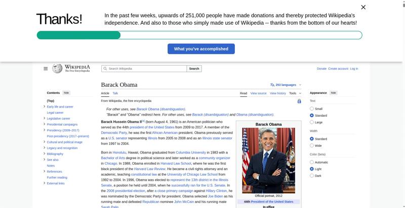 | Offenders: https://upload.wikimedia.org/wikipedia/en/thumb/8/8c/Extended-protection-shackle...n-shackle.svg.png https://upload.wikimedia.org/wikipedia/commons/thumb/8/8d/President_Barack_Obama..._Barack_Obama.jpg https://upload.wikimedia.org/wikipedia/commons/thumb/1/11/Barack_Obama_signature...signature.svg.png https://upload.wikimedia.org/wikipedia/commons/thumb/e/e7/Obama_2008_portrait_cr...se_cropped%29.jpg https://upload.wikimedia.org/wikipedia/commons/thumb/3/36/Seal_of_the_President_...ed_States.svg.png https://upload.wikimedia.org/wikipedia/en/thumb/3/33/Ann_Dunham_with_father_and_..._and_children.jpg https://upload.wikimedia.org/wikipedia/commons/thumb/9/99/Barry_Soetoro_school_r...school_record.jpg https://upload.wikimedia.org/wikipedia/commons/thumb/1/1b/Nuvola_apps_kaboodle.s..._kaboodle.svg.png https://upload.wikimedia.org/wikipedia/commons/thumb/2/26/Obama_family_portrait_...he_Green_Room.jpg https://upload.wikimedia.org/wikipedia/commons/thumb/3/3d/Obamas_at_church_on_In...tion_Day_2013.jpg https://upload.wikimedia.org/wikipedia/commons/thumb/b/b6/Obamamiltondavis1.jpg/...amiltondavis1.jpg https://upload.wikimedia.org/wikipedia/commons/thumb/a/a4/Chicago%2C_November_2%...5471954323%29.jpg https://upload.wikimedia.org/wikipedia/commons/thumb/f/f1/BarackObamaportrait.jp...Obamaportrait.jpg https://upload.wikimedia.org/wikipedia/commons/thumb/2/24/ElectoralCollege2008.s...llege2008.svg.png https://upload.wikimedia.org/wikipedia/commons/thumb/3/33/Barack_obama_by_bill_c...y_bill_cramer.jpg https://upload.wikimedia.org/wikipedia/commons/thumb/4/44/ElectoralCollege2012.s...llege2012.svg.png https://upload.wikimedia.org/wikipedia/commons/thumb/a/a4/Modern_Liberalism_Flag...American_Flag.png https://upload.wikimedia.org/wikipedia/commons/thumb/1/1b/Yellow_flag_waving.svg...ag_waving.svg.png https://upload.wikimedia.org/wikipedia/en/thumb/a/a4/Flag_of_the_United_States.s...ed_States.svg.png https://upload.wikimedia.org/wikipedia/commons/thumb/d/d7/US_President_Barack_Ob...e_-_2009Jan20.jpg https://upload.wikimedia.org/wikipedia/commons/thumb/e/e9/Official_portrait_of_B..._Barack_Obama.jpg https://upload.wikimedia.org/wikipedia/commons/thumb/3/32/Barack_Obama_addresses...ss_2009-02-24.jpg https://upload.wikimedia.org/wikipedia/commons/thumb/4/4b/Barack_Obama_visiting_...rora_shooting.jpg https://upload.wikimedia.org/wikipedia/commons/thumb/f/fc/U.S._Total_Deficits_vs...ses_2001-2010.png https://upload.wikimedia.org/wikipedia/commons/thumb/2/25/US_Employment_Statisti...tatistics.svg.png https://upload.wikimedia.org/wikipedia/commons/thumb/9/9f/Job_Growth_by_U.S._Pre...resident_-_v1.png https://upload.wikimedia.org/wikipedia/commons/thumb/6/63/Obama-venice-la.jpg/25...ama-venice-la.jpg https://upload.wikimedia.org/wikipedia/commons/thumb/7/79/PPACA_Premium_Chart.jp...Premium_Chart.jpg https://upload.wikimedia.org/wikipedia/commons/thumb/8/84/Percentage_of_Individu...%2C_1963-2015.png https://upload.wikimedia.org/wikipedia/commons/thumb/9/99/P06409PS-0571_%2835946...3594694537%29.jpg https://upload.wikimedia.org/wikipedia/commons/thumb/6/6f/Barack_Obama%27s_trip_..._2016_%289%29.jpg https://upload.wikimedia.org/wikipedia/commons/thumb/7/70/Barack_Obama_with_Afgh...and_Joe_Biden.jpg https://upload.wikimedia.org/wikipedia/commons/thumb/a/ac/Obama_and_Biden_await_..._on_bin_Laden.jpg https://upload.wikimedia.org/wikipedia/commons/thumb/f/f6/Handshake_between_the_...C3%BAl_Castro.jpg https://upload.wikimedia.org/wikipedia/commons/thumb/1/1b/Barack_Obama_welcomes_...e_Oval_Office.jpg https://upload.wikimedia.org/wikipedia/commons/thumb/1/17/Barack_Obama_talks_wit...8637772147%29.jpg https://upload.wikimedia.org/wikipedia/commons/thumb/e/eb/Vladimir_Putin_and_Bar...5-09-29%29_01.jpg https://upload.wikimedia.org/wikipedia/commons/thumb/9/96/Obama_Macri_October_20..._October_2017.jpg https://upload.wikimedia.org/wikipedia/commons/thumb/1/15/P20220405AS-1082_%2852...2067439422%29.jpg https://upload.wikimedia.org/wikipedia/commons/thumb/2/28/Former_President_Barac...%28cropped%29.jpg https://upload.wikimedia.org/wikipedia/commons/thumb/b/b3/NewDemCoalition-logo.j...oalition-logo.jpg https://upload.wikimedia.org/wikipedia/en/thumb/0/01/A_coloured_voting_box.svg/2...oting_box.svg.png https://upload.wikimedia.org/wikipedia/commons/thumb/c/c0/Gallup_Poll-Approval_R...ack_Obama.svg.png https://upload.wikimedia.org/wikipedia/en/thumb/6/69/P_vip.svg/40px-P_vip.svg.png https://upload.wikimedia.org/wikipedia/en/thumb/a/a4/Flag_of_the_United_States.s...ed_States.svg.png https://upload.wikimedia.org/wikipedia/commons/thumb/e/ef/Flag_of_Hawaii.svg/40p...of_Hawaii.svg.png https://upload.wikimedia.org/wikipedia/commons/thumb/9/9b/Flag_of_Chicago%2C_Ill..._Illinois.svg.png https://upload.wikimedia.org/wikipedia/commons/thumb/0/01/Flag_of_Illinois.svg/4..._Illinois.svg.png https://upload.wikimedia.org/wikipedia/commons/thumb/1/17/Balance%2C_by_David.sv..._by_David.svg.png https://upload.wikimedia.org/wikipedia/en/thumb/0/01/A_coloured_voting_box.svg/4...oting_box.svg.png https://upload.wikimedia.org/wikipedia/commons/thumb/c/c1/Blue_iPod_Nano.jpg/20px-Blue_iPod_Nano.jpg https://upload.wikimedia.org/wikipedia/commons/thumb/9/9d/IPhone5white.png/20px-IPhone5white.png https://upload.wikimedia.org/wikipedia/en/thumb/4/4a/Commons-logo.svg/20px-Commons-logo.svg.png https://upload.wikimedia.org/wikipedia/commons/thumb/2/24/Wikinews-logo.svg/40px...news-logo.svg.png https://upload.wikimedia.org/wikipedia/commons/thumb/f/fa/Wikiquote-logo.svg/40p...uote-logo.svg.png https://upload.wikimedia.org/wikipedia/commons/thumb/4/4c/Wikisource-logo.svg/40...urce-logo.svg.png https://upload.wikimedia.org/wikipedia/commons/thumb/f/ff/Wikidata-logo.svg/40px...data-logo.svg.png https://upload.wikimedia.org/wikipedia/en/thumb/8/8a/OOjs_UI_icon_edit-ltr-progr...ogressive.svg.png https://upload.wikimedia.org/wikipedia/commons/thumb/2/21/Speaker_Icon.svg/20px-Speaker_Icon.svg.png https://upload.wikimedia.org/wikipedia/en/thumb/9/96/Sym