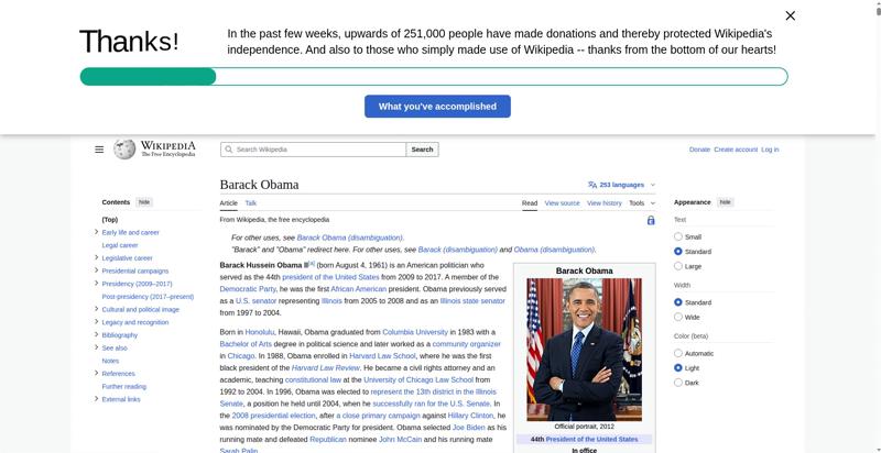 | Offenders: https://upload.wikimedia.org/wikipedia/en/thumb/8/8c/Extended-protection-shackle...n-shackle.svg.png https://upload.wikimedia.org/wikipedia/commons/thumb/8/8d/President_Barack_Obama..._Barack_Obama.jpg https://upload.wikimedia.org/wikipedia/commons/thumb/1/11/Barack_Obama_signature...signature.svg.png https://upload.wikimedia.org/wikipedia/commons/thumb/e/e7/Obama_2008_portrait_cr...se_cropped%29.jpg https://upload.wikimedia.org/wikipedia/commons/thumb/3/36/Seal_of_the_President_...ed_States.svg.png https://upload.wikimedia.org/wikipedia/en/thumb/3/33/Ann_Dunham_with_father_and_..._and_children.jpg https://upload.wikimedia.org/wikipedia/commons/thumb/9/99/Barry_Soetoro_school_r...school_record.jpg https://upload.wikimedia.org/wikipedia/commons/thumb/1/1b/Nuvola_apps_kaboodle.s..._kaboodle.svg.png https://upload.wikimedia.org/wikipedia/commons/thumb/2/26/Obama_family_portrait_...he_Green_Room.jpg https://upload.wikimedia.org/wikipedia/commons/thumb/3/3d/Obamas_at_church_on_In...tion_Day_2013.jpg https://upload.wikimedia.org/wikipedia/commons/thumb/b/b6/Obamamiltondavis1.jpg/...amiltondavis1.jpg https://upload.wikimedia.org/wikipedia/commons/thumb/a/a4/Chicago%2C_November_2%...5471954323%29.jpg https://upload.wikimedia.org/wikipedia/commons/thumb/f/f1/BarackObamaportrait.jp...Obamaportrait.jpg https://upload.wikimedia.org/wikipedia/commons/thumb/2/24/ElectoralCollege2008.s...llege2008.svg.png https://upload.wikimedia.org/wikipedia/commons/thumb/3/33/Barack_obama_by_bill_c...y_bill_cramer.jpg https://upload.wikimedia.org/wikipedia/commons/thumb/4/44/ElectoralCollege2012.s...llege2012.svg.png https://upload.wikimedia.org/wikipedia/commons/thumb/a/a4/Modern_Liberalism_Flag...American_Flag.png https://upload.wikimedia.org/wikipedia/commons/thumb/1/1b/Yellow_flag_waving.svg...ag_waving.svg.png https://upload.wikimedia.org/wikipedia/en/thumb/a/a4/Flag_of_the_United_States.s...ed_States.svg.png https://upload.wikimedia.org/wikipedia/commons/thumb/d/d7/US_President_Barack_Ob...e_-_2009Jan20.jpg https://upload.wikimedia.org/wikipedia/commons/thumb/e/e9/Official_portrait_of_B..._Barack_Obama.jpg https://upload.wikimedia.org/wikipedia/commons/thumb/3/32/Barack_Obama_addresses...ss_2009-02-24.jpg https://upload.wikimedia.org/wikipedia/commons/thumb/4/4b/Barack_Obama_visiting_...rora_shooting.jpg https://upload.wikimedia.org/wikipedia/commons/thumb/f/fc/U.S._Total_Deficits_vs...ses_2001-2010.png https://upload.wikimedia.org/wikipedia/commons/thumb/2/25/US_Employment_Statisti...tatistics.svg.png https://upload.wikimedia.org/wikipedia/commons/thumb/9/9f/Job_Growth_by_U.S._Pre...resident_-_v1.png https://upload.wikimedia.org/wikipedia/commons/thumb/6/63/Obama-venice-la.jpg/25...ama-venice-la.jpg https://upload.wikimedia.org/wikipedia/commons/thumb/7/79/PPACA_Premium_Chart.jp...Premium_Chart.jpg https://upload.wikimedia.org/wikipedia/commons/thumb/8/84/Percentage_of_Individu...%2C_1963-2015.png https://upload.wikimedia.org/wikipedia/commons/thumb/9/99/P06409PS-0571_%2835946...3594694537%29.jpg https://upload.wikimedia.org/wikipedia/commons/thumb/6/6f/Barack_Obama%27s_trip_..._2016_%289%29.jpg https://upload.wikimedia.org/wikipedia/commons/thumb/7/70/Barack_Obama_with_Afgh...and_Joe_Biden.jpg https://upload.wikimedia.org/wikipedia/commons/thumb/a/ac/Obama_and_Biden_await_..._on_bin_Laden.jpg https://upload.wikimedia.org/wikipedia/commons/thumb/f/f6/Handshake_between_the_...C3%BAl_Castro.jpg https://upload.wikimedia.org/wikipedia/commons/thumb/1/1b/Barack_Obama_welcomes_...e_Oval_Office.jpg https://upload.wikimedia.org/wikipedia/commons/thumb/1/17/Barack_Obama_talks_wit...8637772147%29.jpg https://upload.wikimedia.org/wikipedia/commons/thumb/e/eb/Vladimir_Putin_and_Bar...5-09-29%29_01.jpg https://upload.wikimedia.org/wikipedia/commons/thumb/9/96/Obama_Macri_October_20..._October_2017.jpg https://upload.wikimedia.org/wikipedia/commons/thumb/1/15/P20220405AS-1082_%2852...2067439422%29.jpg https://upload.wikimedia.org/wikipedia/commons/thumb/2/28/Former_President_Barac...%28cropped%29.jpg https://upload.wikimedia.org/wikipedia/commons/thumb/b/b3/NewDemCoalition-logo.j...oalition-logo.jpg https://upload.wikimedia.org/wikipedia/en/thumb/0/01/A_coloured_voting_box.svg/2...oting_box.svg.png https://upload.wikimedia.org/wikipedia/commons/thumb/c/c0/Gallup_Poll-Approval_R...ack_Obama.svg.png https://upload.wikimedia.org/wikipedia/en/thumb/6/69/P_vip.svg/40px-P_vip.svg.png https://upload.wikimedia.org/wikipedia/en/thumb/a/a4/Flag_of_the_United_States.s...ed_States.svg.png https://upload.wikimedia.org/wikipedia/commons/thumb/e/ef/Flag_of_Hawaii.svg/40p...of_Hawaii.svg.png https://upload.wikimedia.org/wikipedia/commons/thumb/9/9b/Flag_of_Chicago%2C_Ill..._Illinois.svg.png https://upload.wikimedia.org/wikipedia/commons/thumb/0/01/Flag_of_Illinois.svg/4..._Illinois.svg.png https://upload.wikimedia.org/wikipedia/commons/thumb/1/17/Balance%2C_by_David.sv..._by_David.svg.png https://upload.wikimedia.org/wikipedia/en/thumb/0/01/A_coloured_voting_box.svg/4...oting_box.svg.png https://upload.wikimedia.org/wikipedia/commons/thumb/c/c1/Blue_iPod_Nano.jpg/20px-Blue_iPod_Nano.jpg https://upload.wikimedia.org/wikipedia/commons/thumb/9/9d/IPhone5white.png/20px-IPhone5white.png https://upload.wikimedia.org/wikipedia/en/thumb/4/4a/Commons-logo.svg/20px-Commons-logo.svg.png https://upload.wikimedia.org/wikipedia/commons/thumb/2/24/Wikinews-logo.svg/40px...news-logo.svg.png https://upload.wikimedia.org/wikipedia/commons/thumb/f/fa/Wikiquote-logo.svg/40p...uote-logo.svg.png https://upload.wikimedia.org/wikipedia/commons/thumb/4/4c/Wikisource-logo.svg/40...urce-logo.svg.png https://upload.wikimedia.org/wikipedia/commons/thumb/f/ff/Wikidata-logo.svg/40px...data-logo.svg.png https://upload.wikimedia.org/wikipedia/en/thumb/8/8a/OOjs_UI_icon_edit-ltr-progr...ogressive.svg.png https://upload.wikimedia.org/wikipedia/commons/thumb/2/21/Speaker_Icon.svg/20px-Speaker_Icon.svg.png https://upload.wikimedia.org/wikipedia/en/thumb/9/96/Sym