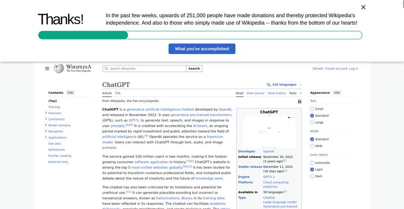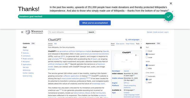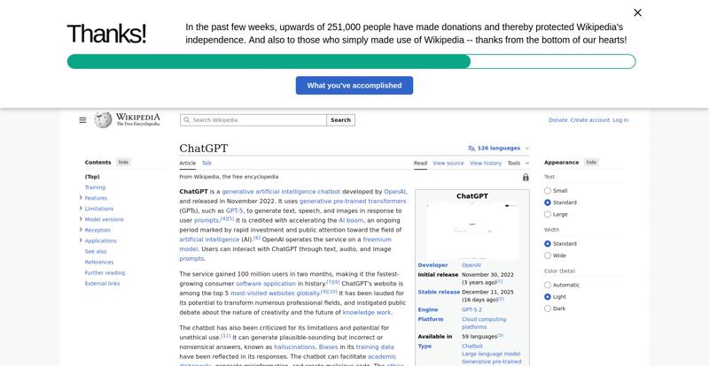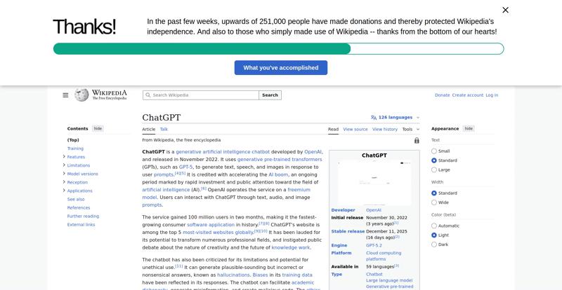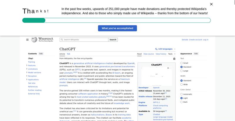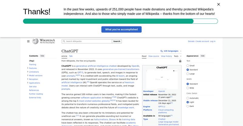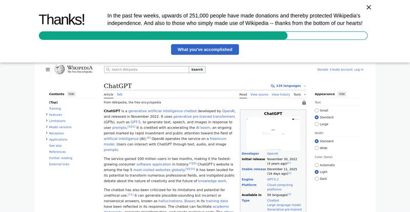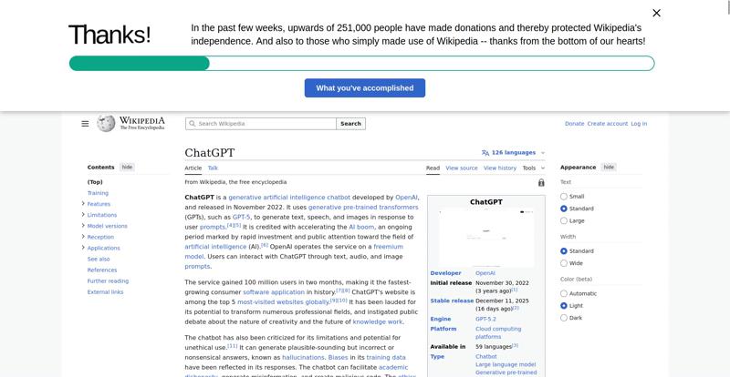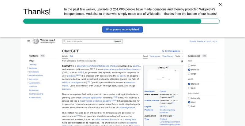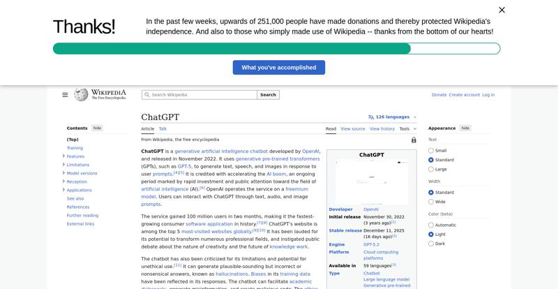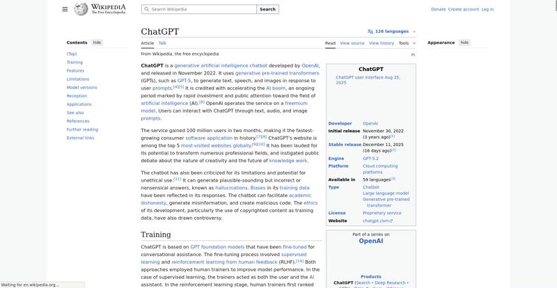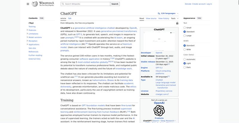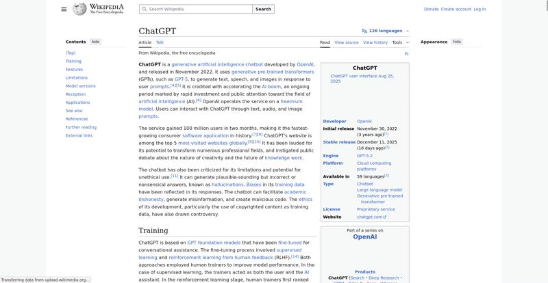 <img alt="ChatGPT user interface Aug 25, 2025" src="//upload.wikimedia.org/wikipedia/commons/thumb/a/a9/ChatGPT_screenshot_-_Aug_25%2C_2025.png/250px-ChatGPT_screenshot_-_Aug_25%2C_2025.png" decoding="async" width="250" height="156" class="mw-file-element" srcset="//upload.wikimedia.org/wikipedia/commons/thumb/a/a9/ChatGPT_screenshot_-_Aug_25%2C_2025.png/500px-ChatGPT_screenshot_-_Aug_25%2C_2025.png 1.5x" data-file-width="3584" data-file-height="2240">