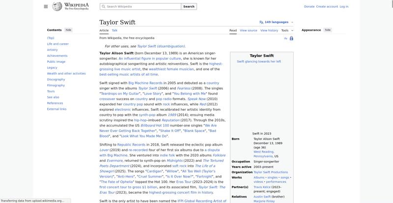 | Offenders: https://upload.wikimedia.org/wikipedia/en/thumb/e/e7/Cscr-featured.svg/20px-Cscr-featured.svg.png https://upload.wikimedia.org/wikipedia/en/thumb/8/8c/Extended-protection-shackle...n-shackle.svg.png https://upload.wikimedia.org/wikipedia/commons/thumb/b/b1/Taylor_Swift_at_the_20...wards_%283%29.png https://upload.wikimedia.org/wikipedia/en/thumb/8/8a/OOjs_UI_icon_edit-ltr-progr...ogressive.svg.png https://upload.wikimedia.org/wikipedia/commons/thumb/e/e6/Taylor_Swift_signature...signature.svg.png https://upload.wikimedia.org/wikipedia/commons/thumb/1/15/Taylor_Swift_at_Yahoo_...%28cropped%29.jpg https://upload.wikimedia.org/wikipedia/commons/thumb/e/e8/TaylorSwiftApr09.jpg/2...lorSwiftApr09.jpg https://upload.wikimedia.org/wikipedia/commons/thumb/6/6e/Taylor_Swift_2011crop....wift_2011crop.jpg https://upload.wikimedia.org/wikipedia/commons/thumb/b/b2/Taylor_Swift_Red_Tour_...our_2%2C_2013.jpg https://upload.wikimedia.org/wikipedia/commons/thumb/0/04/Taylor_Swift_045_%2817...7682880264%29.jpg https://upload.wikimedia.org/wikipedia/commons/thumb/7/7e/Taylor_Swift_Reputatio...%28cropped%29.jpg https://upload.wikimedia.org/wikipedia/commons/thumb/d/d9/191125_Taylor_Swift_at..._Music_Awards.png https://upload.wikimedia.org/wikipedia/commons/thumb/7/76/Taylor_Swift_2022_info..._2022_infobox.jpg https://upload.wikimedia.org/wikipedia/commons/thumb/5/5d/Taylor_Swift_The_Eras_...%28cropped%29.jpg https://upload.wikimedia.org/wikipedia/commons/thumb/8/87/Gnome-mime-sound-openc...enclipart.svg.png https://upload.wikimedia.org/wikipedia/commons/thumb/7/7c/Taylor_Swift_Sydney.jp..._Swift_Sydney.jpg https://upload.wikimedia.org/wikipedia/commons/thumb/1/1f/Taylor_Swift_-_Reputat...%28cropped%29.jpg https://upload.wikimedia.org/wikipedia/commons/thumb/1/1d/Taylor_Swift_2009_MTV_...%28cropped%29.jpg https://upload.wikimedia.org/wikipedia/commons/thumb/0/0a/5.3.10TaylorSwiftByDav...avidShankbone.jpg https://upload.wikimedia.org/wikipedia/commons/thumb/5/5a/Taylor_Swift_wax_figur...%28cropped%29.jpg https://upload.wikimedia.org/wikipedia/commons/thumb/c/cf/Taylor_Swift_for_Keds....wift_for_Keds.jpg https://upload.wikimedia.org/wikipedia/commons/thumb/6/6c/Audio-input-microphone...ut-microphone.png https://upload.wikimedia.org/wikipedia/en/thumb/4/4a/Commons-logo.svg/20px-Commons-logo.svg.png https://upload.wikimedia.org/wikipedia/commons/thumb/2/24/Wikinews-logo.svg/40px...news-logo.svg.png https://upload.wikimedia.org/wikipedia/commons/thumb/f/fa/Wikiquote-logo.svg/40p...uote-logo.svg.png https://upload.wikimedia.org/wikipedia/commons/thumb/f/ff/Wikidata-logo.svg/40px...data-logo.svg.png https://upload.wikimedia.org/wikipedia/en/thumb/9/96/Symbol_category_class.svg/2...ory_class.svg.png https://upload.wikimedia.org/wikipedia/commons/d/d6/Lock-gray-alt-2.svg https://upload.wikimedia.org/wikipedia/commons/a/aa/Lock-red-alt-2.svg https://upload.wikimedia.org/wikipedia/commons/4/4d/Icon_pdf_file.png https://upload.wikimedia.org/wikipedia/commons/6/65/Lock-green.svg https://en.wikipedia.org/wiki/Special:CentralAutoLogin/start?useformat=desktop&type=script&usesul3=1 https://meta.wikimedia.org/w/index.php...a.org/w/index.php https://auth.wikimedia.org/metawiki/wiki/Special:CentralAutoLogin/checkLoggedIn...gin/checkLoggedIn https://upload.wikimedia.org/wikipedia/commons/b/be/Franziska_Heine.png |