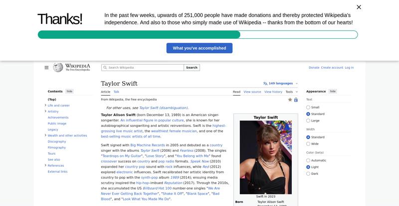 | Offenders: https://en.wikipedia.org/wiki/Taylor_Swift https://meta.wikimedia.org/w/index.php...a.org/w/index.php |