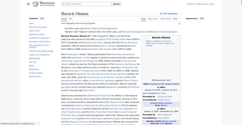 | Offenders: https://upload.wikimedia.org/wikipedia/en/thumb/8/8c/Extended-protection-shackle...n-shackle.svg.png https://upload.wikimedia.org/wikipedia/commons/thumb/8/8d/President_Barack_Obama..._Barack_Obama.jpg https://upload.wikimedia.org/wikipedia/commons/thumb/1/11/Barack_Obama_signature...signature.svg.png https://upload.wikimedia.org/wikipedia/commons/thumb/e/e7/Obama_2008_portrait_cr...se_cropped%29.jpg https://upload.wikimedia.org/wikipedia/commons/thumb/3/36/Seal_of_the_President_...ed_States.svg.png https://upload.wikimedia.org/wikipedia/en/thumb/3/33/Ann_Dunham_with_father_and_..._and_children.jpg https://upload.wikimedia.org/wikipedia/commons/thumb/9/99/Barry_Soetoro_school_r...school_record.jpg https://upload.wikimedia.org/wikipedia/commons/thumb/1/1b/Nuvola_apps_kaboodle.s..._kaboodle.svg.png https://upload.wikimedia.org/wikipedia/commons/thumb/2/26/Obama_family_portrait_...he_Green_Room.jpg https://upload.wikimedia.org/wikipedia/commons/thumb/3/3d/Obamas_at_church_on_In...tion_Day_2013.jpg https://upload.wikimedia.org/wikipedia/commons/thumb/b/b6/Obamamiltondavis1.jpg/...amiltondavis1.jpg https://upload.wikimedia.org/wikipedia/commons/thumb/a/a4/Chicago%2C_November_2%...5471954323%29.jpg https://upload.wikimedia.org/wikipedia/commons/thumb/f/f1/BarackObamaportrait.jp...Obamaportrait.jpg https://upload.wikimedia.org/wikipedia/commons/thumb/2/24/ElectoralCollege2008.s...llege2008.svg.png https://upload.wikimedia.org/wikipedia/commons/thumb/3/33/Barack_obama_by_bill_c...y_bill_cramer.jpg https://upload.wikimedia.org/wikipedia/commons/thumb/4/44/ElectoralCollege2012.s...llege2012.svg.png https://upload.wikimedia.org/wikipedia/commons/thumb/a/a4/Modern_Liberalism_Flag...American_Flag.png https://upload.wikimedia.org/wikipedia/commons/thumb/1/1b/Yellow_flag_waving.svg...ag_waving.svg.png https://upload.wikimedia.org/wikipedia/en/thumb/a/a4/Flag_of_the_United_States.s...ed_States.svg.png https://upload.wikimedia.org/wikipedia/commons/thumb/d/d7/US_President_Barack_Ob...e_-_2009Jan20.jpg https://upload.wikimedia.org/wikipedia/commons/thumb/e/e9/Official_portrait_of_B..._Barack_Obama.jpg https://upload.wikimedia.org/wikipedia/commons/thumb/3/32/Barack_Obama_addresses...ss_2009-02-24.jpg https://upload.wikimedia.org/wikipedia/commons/thumb/4/4b/Barack_Obama_visiting_...rora_shooting.jpg https://upload.wikimedia.org/wikipedia/commons/thumb/f/fc/U.S._Total_Deficits_vs...ses_2001-2010.png https://upload.wikimedia.org/wikipedia/commons/thumb/2/25/US_Employment_Statisti...tatistics.svg.png https://upload.wikimedia.org/wikipedia/commons/thumb/9/9f/Job_Growth_by_U.S._Pre...resident_-_v1.png https://upload.wikimedia.org/wikipedia/commons/thumb/6/63/Obama-venice-la.jpg/25...ama-venice-la.jpg https://upload.wikimedia.org/wikipedia/commons/thumb/7/79/PPACA_Premium_Chart.jp...Premium_Chart.jpg https://upload.wikimedia.org/wikipedia/commons/thumb/8/84/Percentage_of_Individu...%2C_1963-2015.png https://upload.wikimedia.org/wikipedia/commons/thumb/9/99/P06409PS-0571_%2835946...3594694537%29.jpg https://upload.wikimedia.org/wikipedia/commons/thumb/6/6f/Barack_Obama%27s_trip_..._2016_%289%29.jpg https://upload.wikimedia.org/wikipedia/commons/thumb/7/70/Barack_Obama_with_Afgh...and_Joe_Biden.jpg https://upload.wikimedia.org/wikipedia/commons/thumb/a/ac/Obama_and_Biden_await_..._on_bin_Laden.jpg https://upload.wikimedia.org/wikipedia/commons/thumb/f/f6/Handshake_between_the_...C3%BAl_Castro.jpg https://upload.wikimedia.org/wikipedia/commons/thumb/1/1b/Barack_Obama_welcomes_...e_Oval_Office.jpg https://upload.wikimedia.org/wikipedia/commons/thumb/1/17/Barack_Obama_talks_wit...8637772147%29.jpg https://upload.wikimedia.org/wikipedia/commons/thumb/e/eb/Vladimir_Putin_and_Bar...5-09-29%29_01.jpg https://upload.wikimedia.org/wikipedia/commons/thumb/9/96/Obama_Macri_October_20..._October_2017.jpg https://upload.wikimedia.org/wikipedia/commons/thumb/1/15/P20220405AS-1082_%2852...2067439422%29.jpg https://upload.wikimedia.org/wikipedia/commons/thumb/2/28/Former_President_Barac...%28cropped%29.jpg https://upload.wikimedia.org/wikipedia/commons/thumb/b/b3/NewDemCoalition-logo.j...oalition-logo.jpg https://upload.wikimedia.org/wikipedia/en/thumb/0/01/A_coloured_voting_box.svg/2...oting_box.svg.png https://upload.wikimedia.org/wikipedia/commons/thumb/c/c0/Gallup_Poll-Approval_R...ack_Obama.svg.png https://upload.wikimedia.org/wikipedia/en/thumb/6/69/P_vip.svg/40px-P_vip.svg.png https://upload.wikimedia.org/wikipedia/en/thumb/a/a4/Flag_of_the_United_States.s...ed_States.svg.png https://upload.wikimedia.org/wikipedia/commons/thumb/e/ef/Flag_of_Hawaii.svg/40p...of_Hawaii.svg.png https://upload.wikimedia.org/wikipedia/commons/thumb/9/9b/Flag_of_Chicago%2C_Ill..._Illinois.svg.png https://upload.wikimedia.org/wikipedia/commons/thumb/0/01/Flag_of_Illinois.svg/4..._Illinois.svg.png https://upload.wikimedia.org/wikipedia/commons/thumb/1/17/Balance%2C_by_David.sv..._by_David.svg.png https://upload.wikimedia.org/wikipedia/en/thumb/0/01/A_coloured_voting_box.svg/4...oting_box.svg.png https://upload.wikimedia.org/wikipedia/commons/thumb/c/c1/Blue_iPod_Nano.jpg/20px-Blue_iPod_Nano.jpg https://upload.wikimedia.org/wikipedia/commons/thumb/9/9d/IPhone5white.png/20px-IPhone5white.png https://upload.wikimedia.org/wikipedia/en/thumb/4/4a/Commons-logo.svg/20px-Commons-logo.svg.png https://upload.wikimedia.org/wikipedia/commons/thumb/2/24/Wikinews-logo.svg/40px...news-logo.svg.png https://upload.wikimedia.org/wikipedia/commons/thumb/f/fa/Wikiquote-logo.svg/40p...uote-logo.svg.png https://upload.wikimedia.org/wikipedia/commons/thumb/4/4c/Wikisource-logo.svg/40...urce-logo.svg.png https://upload.wikimedia.org/wikipedia/commons/thumb/f/ff/Wikidata-logo.svg/40px...data-logo.svg.png https://upload.wikimedia.org/wikipedia/en/thumb/8/8a/OOjs_UI_icon_edit-ltr-progr...ogressive.svg.png https://upload.wikimedia.org/wikipedia/commons/thumb/2/21/Speaker_Icon.svg/20px-Speaker_Icon.svg.png https://upload.wikimedia.org/wikipedia/en/thumb/9/96/Sym
