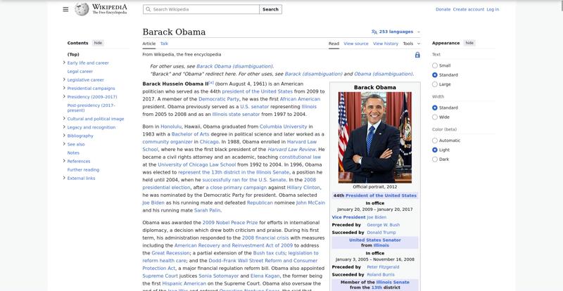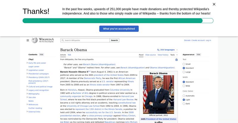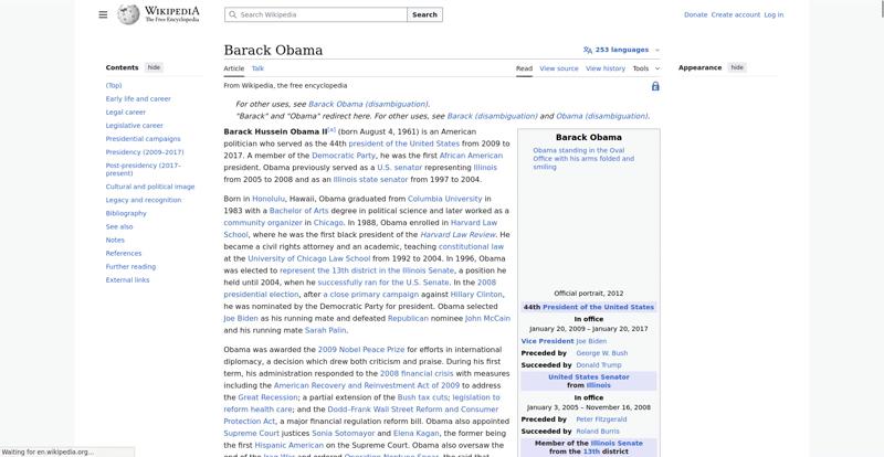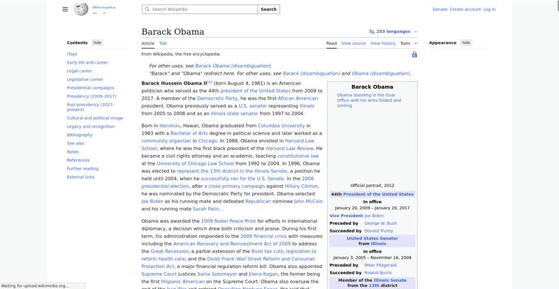 | Offenders: https://upload.wikimedia.org/wikipedia/en/thumb/8/8c/Extended-protection-shackle...n-shackle.svg.png https://upload.wikimedia.org/wikipedia/commons/thumb/8/8d/President_Barack_Obama..._Barack_Obama.jpg https://upload.wikimedia.org/wikipedia/commons/thumb/1/11/Barack_Obama_signature...signature.svg.png https://upload.wikimedia.org/wikipedia/commons/thumb/e/e7/Obama_2008_portrait_cr...se_cropped%29.jpg https://upload.wikimedia.org/wikipedia/commons/thumb/3/36/Seal_of_the_President_...ed_States.svg.png https://upload.wikimedia.org/wikipedia/en/thumb/3/33/Ann_Dunham_with_father_and_..._and_children.jpg https://upload.wikimedia.org/wikipedia/commons/thumb/9/99/Barry_Soetoro_school_r...school_record.jpg https://upload.wikimedia.org/wikipedia/commons/thumb/1/1b/Nuvola_apps_kaboodle.s..._kaboodle.svg.png https://upload.wikimedia.org/wikipedia/commons/thumb/2/26/Obama_family_portrait_...he_Green_Room.jpg https://upload.wikimedia.org/wikipedia/commons/thumb/3/3d/Obamas_at_church_on_In...tion_Day_2013.jpg https://upload.wikimedia.org/wikipedia/commons/thumb/b/b6/Obamamiltondavis1.jpg/...amiltondavis1.jpg https://upload.wikimedia.org/wikipedia/commons/thumb/a/a4/Chicago%2C_November_2%...5471954323%29.jpg https://upload.wikimedia.org/wikipedia/commons/thumb/f/f1/BarackObamaportrait.jp...Obamaportrait.jpg https://upload.wikimedia.org/wikipedia/commons/thumb/2/24/ElectoralCollege2008.s...llege2008.svg.png https://upload.wikimedia.org/wikipedia/commons/thumb/3/33/Barack_obama_by_bill_c...y_bill_cramer.jpg https://upload.wikimedia.org/wikipedia/commons/thumb/4/44/ElectoralCollege2012.s...llege2012.svg.png https://upload.wikimedia.org/wikipedia/commons/thumb/a/a4/Modern_Liberalism_Flag...American_Flag.png https://upload.wikimedia.org/wikipedia/commons/thumb/1/1b/Yellow_flag_waving.svg...ag_waving.svg.png https://upload.wikimedia.org/wikipedia/en/thumb/a/a4/Flag_of_the_United_States.s...ed_States.svg.png https://upload.wikimedia.org/wikipedia/commons/thumb/d/d7/US_President_Barack_Ob...e_-_2009Jan20.jpg https://upload.wikimedia.org/wikipedia/commons/thumb/e/e9/Official_portrait_of_B..._Barack_Obama.jpg https://upload.wikimedia.org/wikipedia/commons/thumb/3/32/Barack_Obama_addresses...ss_2009-02-24.jpg https://upload.wikimedia.org/wikipedia/commons/thumb/4/4b/Barack_Obama_visiting_...rora_shooting.jpg https://upload.wikimedia.org/wikipedia/commons/thumb/f/fc/U.S._Total_Deficits_vs...ses_2001-2010.png https://upload.wikimedia.org/wikipedia/commons/thumb/2/25/US_Employment_Statisti...tatistics.svg.png https://upload.wikimedia.org/wikipedia/commons/thumb/9/9f/Job_Growth_by_U.S._Pre...resident_-_v1.png https://upload.wikimedia.org/wikipedia/commons/thumb/6/63/Obama-venice-la.jpg/25...ama-venice-la.jpg https://upload.wikimedia.org/wikipedia/commons/thumb/7/79/PPACA_Premium_Chart.jp...Premium_Chart.jpg https://upload.wikimedia.org/wikipedia/commons/thumb/8/84/Percentage_of_Individu...%2C_1963-2015.png https://upload.wikimedia.org/wikipedia/commons/thumb/9/99/P06409PS-0571_%2835946...3594694537%29.jpg https://upload.wikimedia.org/wikipedia/commons/thumb/6/6f/Barack_Obama%27s_trip_..._2016_%289%29.jpg https://upload.wikimedia.org/wikipedia/commons/thumb/7/70/Barack_Obama_with_Afgh...and_Joe_Biden.jpg https://upload.wikimedia.org/wikipedia/commons/thumb/a/ac/Obama_and_Biden_await_..._on_bin_Laden.jpg https://upload.wikimedia.org/wikipedia/commons/thumb/f/f6/Handshake_between_the_...C3%BAl_Castro.jpg https://upload.wikimedia.org/wikipedia/commons/thumb/1/1b/Barack_Obama_welcomes_...e_Oval_Office.jpg https://upload.wikimedia.org/wikipedia/commons/thumb/1/17/Barack_Obama_talks_wit...8637772147%29.jpg https://upload.wikimedia.org/wikipedia/commons/thumb/e/eb/Vladimir_Putin_and_Bar...5-09-29%29_01.jpg https://upload.wikimedia.org/wikipedia/commons/thumb/9/96/Obama_Macri_October_20..._October_2017.jpg https://upload.wikimedia.org/wikipedia/commons/thumb/1/15/P20220405AS-1082_%2852...2067439422%29.jpg https://upload.wikimedia.org/wikipedia/commons/thumb/2/28/Former_President_Barac...%28cropped%29.jpg https://upload.wikimedia.org/wikipedia/commons/thumb/b/b3/NewDemCoalition-logo.j...oalition-logo.jpg https://upload.wikimedia.org/wikipedia/en/thumb/0/01/A_coloured_voting_box.svg/2...oting_box.svg.png https://upload.wikimedia.org/wikipedia/commons/thumb/c/c0/Gallup_Poll-Approval_R...ack_Obama.svg.png https://upload.wikimedia.org/wikipedia/en/thumb/6/69/P_vip.svg/40px-P_vip.svg.png https://upload.wikimedia.org/wikipedia/en/thumb/a/a4/Flag_of_the_United_States.s...ed_States.svg.png https://upload.wikimedia.org/wikipedia/commons/thumb/e/ef/Flag_of_Hawaii.svg/40p...of_Hawaii.svg.png https://upload.wikimedia.org/wikipedia/commons/thumb/9/9b/Flag_of_Chicago%2C_Ill..._Illinois.svg.png https://upload.wikimedia.org/wikipedia/commons/thumb/0/01/Flag_of_Illinois.svg/4..._Illinois.svg.png https://upload.wikimedia.org/wikipedia/commons/thumb/1/17/Balance%2C_by_David.sv..._by_David.svg.png https://upload.wikimedia.org/wikipedia/en/thumb/0/01/A_coloured_voting_box.svg/4...oting_box.svg.png https://upload.wikimedia.org/wikipedia/commons/thumb/c/c1/Blue_iPod_Nano.jpg/20px-Blue_iPod_Nano.jpg https://upload.wikimedia.org/wikipedia/commons/thumb/9/9d/IPhone5white.png/20px-IPhone5white.png https://upload.wikimedia.org/wikipedia/en/thumb/4/4a/Commons-logo.svg/20px-Commons-logo.svg.png https://upload.wikimedia.org/wikipedia/commons/thumb/2/24/Wikinews-logo.svg/40px...news-logo.svg.png https://upload.wikimedia.org/wikipedia/commons/thumb/f/fa/Wikiquote-logo.svg/40p...uote-logo.svg.png https://upload.wikimedia.org/wikipedia/commons/thumb/4/4c/Wikisource-logo.svg/40...urce-logo.svg.png https://upload.wikimedia.org/wikipedia/commons/thumb/f/ff/Wikidata-logo.svg/40px...data-logo.svg.png https://upload.wikimedia.org/wikipedia/en/thumb/8/8a/OOjs_UI_icon_edit-ltr-progr...ogressive.svg.png https://upload.wikimedia.org/wikipedia/commons/thumb/2/21/Speaker_Icon.svg/20px-Speaker_Icon.svg.png https://upload.wikimedia.org/wikipedia/en/thumb/9/96/Sym