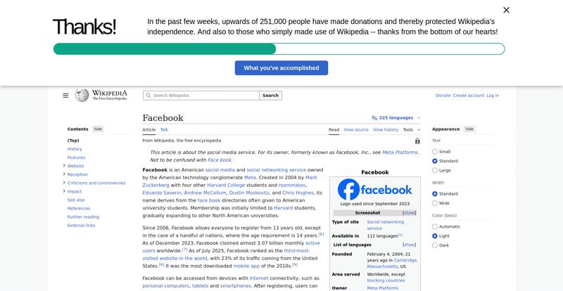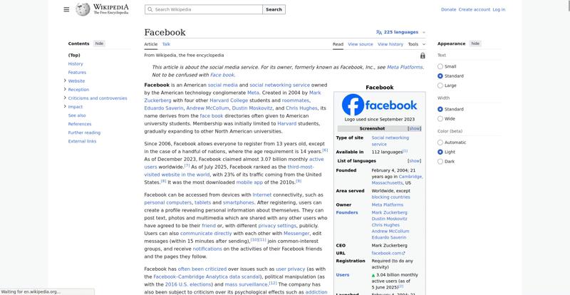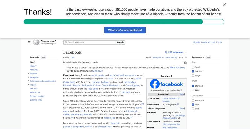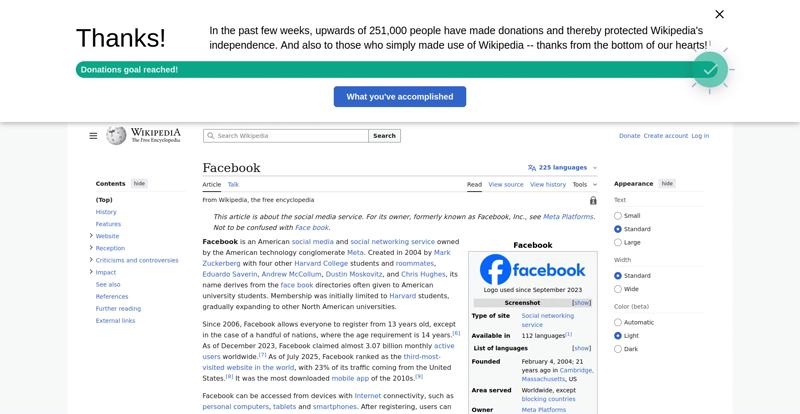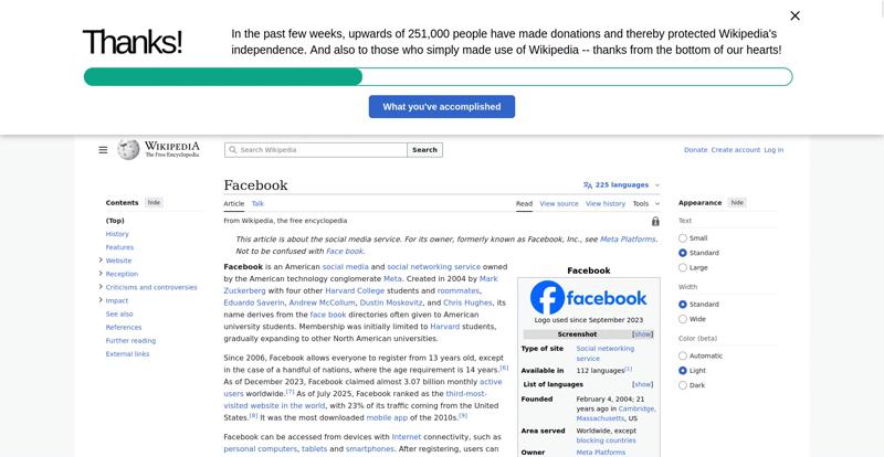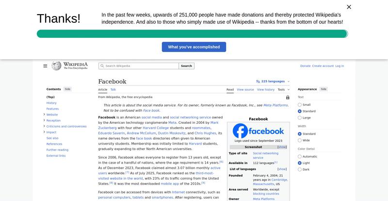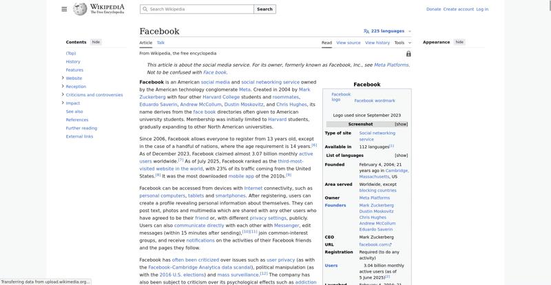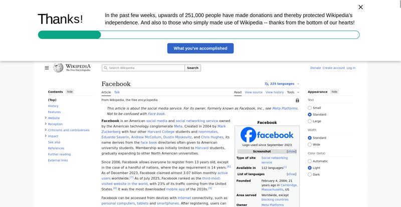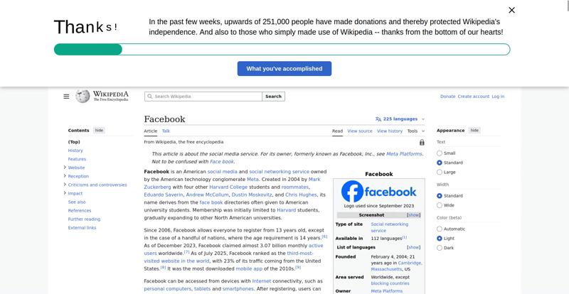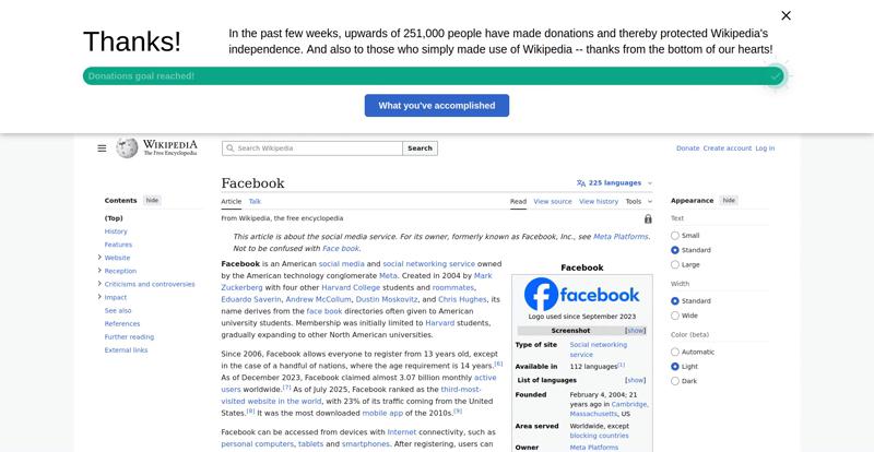| Offenders: https://upload.wikimedia.org/wikipedia/en/thumb/1/1b/Semi-protection-shackle.svg...n-shackle.svg.png https://upload.wikimedia.org/wikipedia/commons/thumb/b/b9/2023_Facebook_icon.svg...book_icon.svg.png https://upload.wikimedia.org/wikipedia/commons/thumb/9/93/Facebook_logo_%282023%...282023%29.svg.png https://upload.wikimedia.org/wikipedia/en/6/64/Facebook_user_page.png https://upload.wikimedia.org/wikipedia/commons/thumb/b/b0/Increase2.svg/20px-Increase2.svg.png https://upload.wikimedia.org/wikipedia/commons/thumb/0/05/Meta_Platforms_Inc._lo...ropped%29.svg.png https://upload.wikimedia.org/wikipedia/commons/3/38/Facebook_Like_React.png https://upload.wikimedia.org/wikipedia/commons/thumb/f/fc/MarkZuckerberg-crop.jp...ckerberg-crop.jpg https://upload.wikimedia.org/wikipedia/en/thumb/1/12/Original-facebook.jpg/250px...inal-facebook.jpg https://upload.wikimedia.org/wikipedia/commons/thumb/0/06/Facebook.svg/250px-Facebook.svg.png https://upload.wikimedia.org/wikipedia/commons/thumb/6/69/Screen_of_Facebook_%28...ebook_%282%29.PNG https://upload.wikimedia.org/wikipedia/commons/thumb/f/f4/Facebook_t-shirt_with_...d_for_Hackers.jpg https://upload.wikimedia.org/wikipedia/commons/thumb/5/5d/Population_pyramid_of_..._users_by_age.png https://upload.wikimedia.org/wikipedia/commons/thumb/9/9c/Facebook_censorship.sv...ensorship.svg.png https://upload.wikimedia.org/wikipedia/commons/thumb/f/f3/PRISM_Collection_Detai...ction_Details.jpg https://upload.wikimedia.org/wikipedia/commons/thumb/6/62/Onavo_logo.png/250px-Onavo_logo.png https://upload.wikimedia.org/wikipedia/commons/thumb/2/26/Hands_Off%21_protest%2...5%2C_2025-053.jpg https://upload.wikimedia.org/wikipedia/commons/thumb/c/c9/Berlin_%289163009052%2...9163009052%29.jpg https://upload.wikimedia.org/wikipedia/commons/thumb/6/61/Ad-tech_London_2010_%2..._2010_%285%29.JPG https://upload.wikimedia.org/wikipedia/commons/thumb/2/27/2011_Egyptian_protests...26_jan25_card.jpg https://upload.wikimedia.org/wikipedia/commons/thumb/9/99/SF_Pride_2014_-_Stierc...4_-_Stierch_7.jpg https://upload.wikimedia.org/wikipedia/commons/thumb/2/2a/Industry5.svg/40px-Industry5.svg.png https://upload.wikimedia.org/wikipedia/commons/thumb/f/f9/Crystal_Clear_app_linn...ghborhood.svg.png https://upload.wikimedia.org/wikipedia/en/thumb/0/06/Wiktionary-logo-v2.svg/40px...y-logo-v2.svg.png https://upload.wikimedia.org/wikipedia/en/thumb/4/4a/Commons-logo.svg/20px-Commons-logo.svg.png https://upload.wikimedia.org/wikipedia/commons/thumb/2/24/Wikinews-logo.svg/40px...news-logo.svg.png https://upload.wikimedia.org/wikipedia/commons/thumb/f/fa/Wikiquote-logo.svg/40p...uote-logo.svg.png https://upload.wikimedia.org/wikipedia/commons/thumb/3/32/Scholia_logo.svg/40px-Scholia_logo.svg.png https://upload.wikimedia.org/wikipedia/en/thumb/8/8a/OOjs_UI_icon_edit-ltr-progr...ogressive.svg.png https://upload.wikimedia.org/wikipedia/commons/a/aa/Lock-red-alt-2.svg https://upload.wikimedia.org/wikipedia/commons/4/4d/Icon_pdf_file.png https://upload.wikimedia.org/wikipedia/commons/6/65/Lock-green.svg https://upload.wikimedia.org/wikipedia/commons/d/d6/Lock-gray-alt-2.svg https://en.wikipedia.org/wiki/Special:CentralAutoLogin/start?useformat=desktop&type=script&usesul3=1 https://meta.wikimedia.org/w/index.php...a.org/w/index.php https://auth.wikimedia.org/metawiki/wiki/Special:CentralAutoLogin/checkLoggedIn...gin/checkLoggedIn https://upload.wikimedia.org/wikipedia/commons/b/be/Franziska_Heine.png |