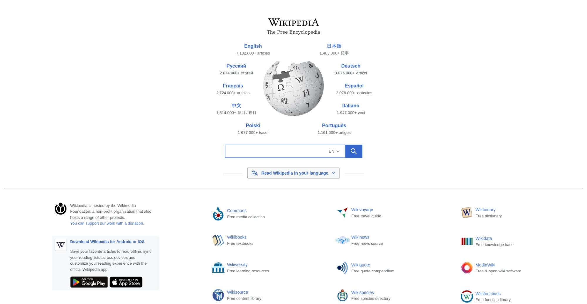 | <img class="central-featured-logo" src="portal/wikipedia.org/assets/img/Wikipedia-logo-v2.png" srcset="portal/wikipedia.org/assets/img/Wikipedia-logo-v2@1.5x.png 1.5x, portal/wikipedia.org/assets/img/Wikipedia-logo-v2@2x.png 2x" width="200" height="183" alt=""> | |||||