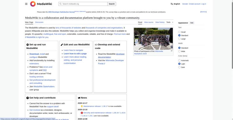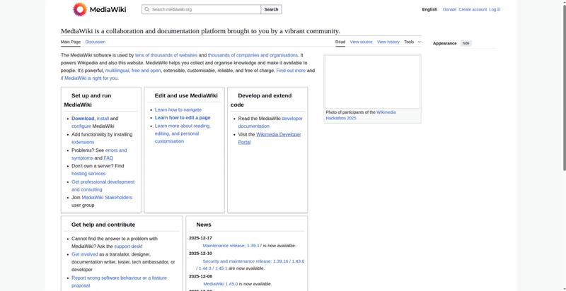 | <img src="//upload.wikimedia.org/wikipedia/commons/thumb/e/e4/Wikimedia_Hackathon_2025_Group_photo_from_drone.jpg/330px-Wikimedia_Hackathon_2025_Group_photo_from_drone.jpg" decoding="async" width="320" height="180" class="mw-file-element" srcset="//upload.wikimedia.org/wikipedia/commons/thumb/e/e4/Wikimedia_Hackathon_2025_Group_photo_from_drone.jpg/500px-Wikimedia_Hackathon_2025_Group_photo_from_drone.jpg 1.5x, //upload.wikimedia.org/wikipedia/commons/thumb/e/e4/Wikimedia_Hackathon_2025_Group_photo_from_drone.jpg/960px-Wikimedia_Hackathon_2025_Group_photo_from_drone.jpg 2x" data-file-width="3775" data-file-height="2119"> | |||||