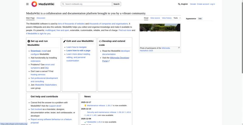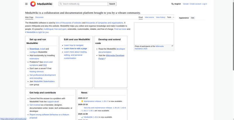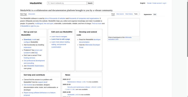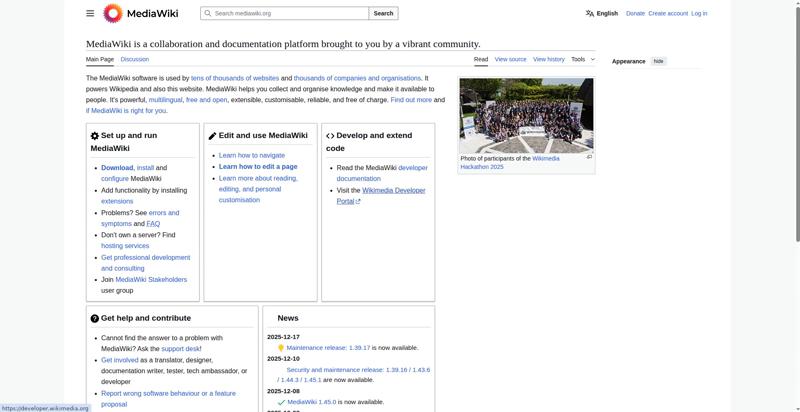 | <img src="//upload.wikimedia.org/wikipedia/commons/thumb/e/e4/Wikimedia_Hackathon_2025_Group_photo_from_drone.jpg/330px-Wikimedia_Hackathon_2025_Group_photo_from_drone.jpg" decoding="async" width="320" height="180" class="mw-file-element" srcset="//upload.wikimedia.org/wikipedia/commons/thumb/e/e4/Wikimedia_Hackathon_2025_Group_photo_from_drone.jpg/500px-Wikimedia_Hackathon_2025_Group_photo_from_drone.jpg 1.5x, //upload.wikimedia.org/wikipedia/commons/thumb/e/e4/Wikimedia_Hackathon_2025_Group_photo_from_drone.jpg/960px-Wikimedia_Hackathon_2025_Group_photo_from_drone.jpg 2x" data-file-width="3775" data-file-height="2119"> | |||||