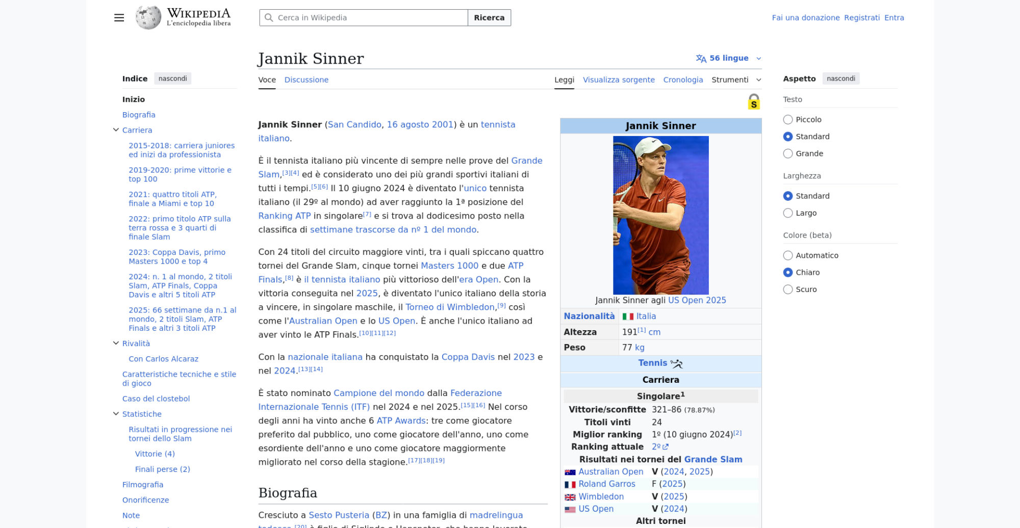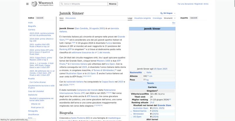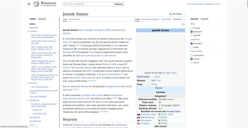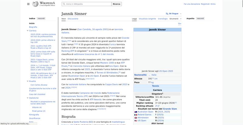 | Offenders: https://upload.wikimedia.org/wikipedia/commons/thumb/a/a5/Semi-protection-shackl...le-itwiki.svg.png https://upload.wikimedia.org/wikipedia/commons/thumb/8/8c/Transparent.png/16px-Transparent.png https://upload.wikimedia.org/wikipedia/commons/6/6a/Jannik_Sinner_logo.png https://upload.wikimedia.org/wikipedia/commons/thumb/4/48/Jannik_Sinner_US_Open_...%28cropped%29.jpg https://upload.wikimedia.org/wikipedia/commons/thumb/0/03/Flag_of_Italy.svg/20px..._of_Italy.svg.png https://upload.wikimedia.org/wikipedia/commons/thumb/8/85/Tennis_pictogram.svg/4...pictogram.svg.png https://upload.wikimedia.org/wikipedia/commons/thumb/b/b9/Flag_of_Australia.svg/...Australia.svg.png https://upload.wikimedia.org/wikipedia/commons/thumb/c/c3/Flag_of_France.svg/20p...of_France.svg.png https://upload.wikimedia.org/wikipedia/commons/thumb/8/83/Flag_of_the_United_Kin...%283-5%29.svg.png https://upload.wikimedia.org/wikipedia/commons/thumb/a/a4/Flag_of_the_United_Sta...ed_States.svg.png https://upload.wikimedia.org/wikipedia/commons/thumb/3/3e/ATP_World_Tour_Finals_...London%29.svg.png https://upload.wikimedia.org/wikipedia/commons/thumb/8/87/Magnifying_glass_icon_...icon_mgx2.svg.png https://upload.wikimedia.org/wikipedia/commons/thumb/f/f3/Flag_of_Russia.svg/20p...of_Russia.svg.png https://upload.wikimedia.org/wikipedia/commons/thumb/b/ba/Flag_of_Germany.svg/20...f_Germany.svg.png https://upload.wikimedia.org/wikipedia/commons/thumb/9/9a/Flag_of_Spain.svg/20px..._of_Spain.svg.png https://upload.wikimedia.org/wikipedia/commons/thumb/9/9c/Nastrino_Stella_Merito...tivo_2015.svg.png https://upload.wikimedia.org/wikipedia/commons/thumb/2/24/Wikinews-logo.svg/20px...news-logo.svg.png https://upload.wikimedia.org/wikipedia/commons/thumb/7/73/Blue_pencil.svg/20px-Blue_pencil.svg.png https://upload.wikimedia.org/wikipedia/commons/thumb/f/ff/Flag_of_Serbia.svg/20p...of_Serbia.svg.png https://upload.wikimedia.org/wikipedia/commons/thumb/4/4c/Flag_of_Sweden.svg/20p...of_Sweden.svg.png https://upload.wikimedia.org/wikipedia/commons/thumb/b/be/Jannik_Sinner_after_wi...Milan%2C_2019.jpg https://upload.wikimedia.org/wikipedia/commons/thumb/f/f6/Sinner_MCM23_%288%29_%...2883593853%29.jpg https://upload.wikimedia.org/wikipedia/commons/thumb/6/66/Jannik_Sinner_%282024_...US_Open%29_01.jpg https://upload.wikimedia.org/wikipedia/commons/thumb/f/fa/Wikiquote-logo.svg/20p...uote-logo.svg.png https://upload.wikimedia.org/wikipedia/commons/thumb/4/4a/Commons-logo.svg/20px-Commons-logo.svg.png https://upload.wikimedia.org/wikipedia/commons/thumb/c/cf/Flag_of_Canada.svg/20p...of_Canada.svg.png https://upload.wikimedia.org/wikipedia/commons/thumb/0/03/Flag_of_Italy.svg/60px..._of_Italy.svg.png https://upload.wikimedia.org/wikipedia/commons/thumb/c/cb/Flag_of_Romania_%28196...931989%29.svg.png https://upload.wikimedia.org/wikipedia/commons/thumb/c/cb/Flag_of_the_Czech_Repu..._Republic.svg.png https://upload.wikimedia.org/wikipedia/commons/thumb/4/41/Flag_of_Austria.svg/20...f_Austria.svg.png https://upload.wikimedia.org/wikipedia/commons/thumb/7/78/Flag_of_Chile.svg/20px..._of_Chile.svg.png https://upload.wikimedia.org/wikipedia/commons/thumb/0/05/Flag_of_Brazil.svg/20p...of_Brazil.svg.png https://upload.wikimedia.org/wikipedia/commons/thumb/f/f3/Flag_of_Switzerland.sv...itzerland.svg.png https://upload.wikimedia.org/wikipedia/commons/thumb/6/67/Crystal_Clear_app_Logi...n_Manager.svg.png https://upload.wikimedia.org/wikipedia/commons/thumb/6/61/Tennis_icon_nobkg.png/...is_icon_nobkg.png https://en.wikipedia.org/w/index.php...a.org/w/index.php https://en.wikipedia.org/w/index.php...a.org/w/index.php https://it.wikipedia.org/wiki/Special:CentralAutoLogin/start?useformat=desktop&type=script&usesul3=1 https://auth.wikimedia.org/metawiki/wiki/Special:CentralAutoLogin/checkLoggedIn...gin/checkLoggedIn |