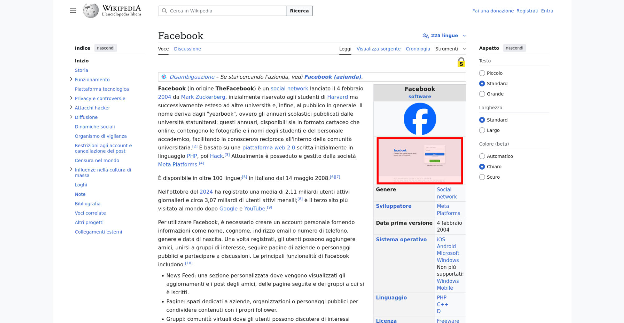| Offenders: https://upload.wikimedia.org/wikipedia/commons/thumb/a/a5/Semi-protection-shackl...le-itwiki.svg.png https://upload.wikimedia.org/wikipedia/commons/thumb/8/87/Magnifying_glass_icon_...icon_mgx2.svg.png https://upload.wikimedia.org/wikipedia/commons/thumb/b/bc/Nota_disambigua.svg/20...isambigua.svg.png https://upload.wikimedia.org/wikipedia/commons/thumb/b/b9/2023_Facebook_icon.svg...book_icon.svg.png https://upload.wikimedia.org/wikipedia/commons/thumb/6/69/Screen_of_Facebook_%28...ebook_%282%29.PNG https://upload.wikimedia.org/wikipedia/commons/thumb/e/ef/MarkZuckerberg.jpg/250...arkZuckerberg.jpg https://upload.wikimedia.org/wikipedia/commons/thumb/4/49/Sean_Parker.jpg/250px-Sean_Parker.jpg https://upload.wikimedia.org/wikipedia/commons/thumb/f/f7/Social_networks.jpg/50...cial_networks.jpg https://upload.wikimedia.org/wikipedia/commons/thumb/c/c5/Local-important.svg/40...important.svg.png https://upload.wikimedia.org/wikipedia/commons/thumb/c/ce/Old-Facebook-Logo.jpg/...Facebook-Logo.jpg https://upload.wikimedia.org/wikipedia/commons/thumb/f/fd/Facebook-reversed.svg/...-reversed.svg.png https://upload.wikimedia.org/wikipedia/commons/thumb/8/87/Facebook_Logo_%282015%...%29_light.svg.png https://upload.wikimedia.org/wikipedia/commons/thumb/8/89/Facebook_Logo_%282019%...282019%29.svg.png https://upload.wikimedia.org/wikipedia/commons/thumb/9/93/Facebook_logo_%282023%...282023%29.svg.png https://upload.wikimedia.org/wikipedia/commons/thumb/f/fa/Wikiquote-logo.svg/20p...uote-logo.svg.png https://upload.wikimedia.org/wikipedia/commons/thumb/4/4a/Commons-logo.svg/20px-Commons-logo.svg.png https://upload.wikimedia.org/wikipedia/commons/thumb/2/24/Wikinews-logo.svg/20px...news-logo.svg.png https://upload.wikimedia.org/wikipedia/commons/thumb/7/73/Blue_pencil.svg/20px-Blue_pencil.svg.png https://upload.wikimedia.org/wikipedia/commons/thumb/7/7b/Meta_Platforms_Inc._lo...Inc._logo.svg.png https://upload.wikimedia.org/wikipedia/commons/thumb/7/70/Applications-internet....-internet.svg.png https://upload.wikimedia.org/wikipedia/commons/thumb/0/0f/People.svg/40px-People.svg.png https://en.wikipedia.org/w/index.php...a.org/w/index.php https://en.wikipedia.org/w/index.php...a.org/w/index.php https://it.wikipedia.org/wiki/Special:CentralAutoLogin/start?useformat=desktop&type=script&usesul3=1 https://auth.wikimedia.org/metawiki/wiki/Special:CentralAutoLogin/checkLoggedIn...gin/checkLoggedIn |