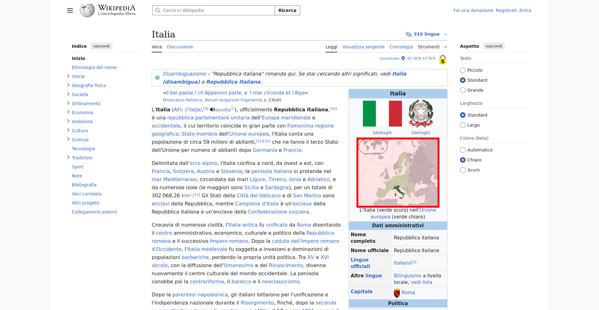 | Element/tag | <img alt="Italia - Localizzazione" resource="//it.wikipedia.org/wiki/File:EU-Italy.svg" src="//upload.wikimedia.org/wikipedia/commons/thumb/b/ba/EU-Italy.svg/330px-EU-Italy.svg.png" decoding="async" data-file-width="2045" data-file-height="1720" data-file-type="drawing" height="219" width="260" srcset="//upload.wikimedia.org/wikipedia/commons/thumb/b/ba/EU-Italy.svg/500px-EU-Italy.svg.png 1.5x, //upload.wikimedia.org/wikipedia/commons/thumb/b/ba/EU-Italy.svg/960px-EU-Italy.svg.png 2x" class="mw-file-element"> |
