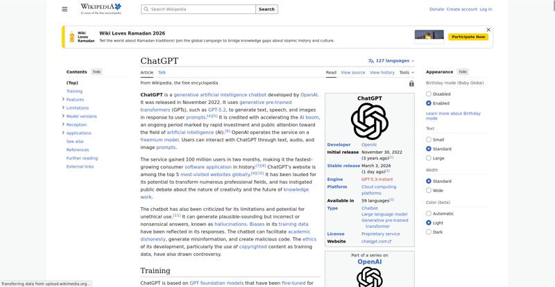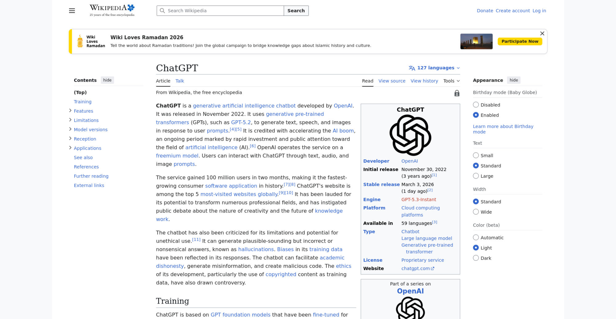 | Offenders: https://upload.wikimedia.org/wikipedia/en/thumb/1/1b/Semi-protection-shackle.svg...n-shackle.svg.png https://upload.wikimedia.org/wikipedia/commons/thumb/6/66/OpenAI_logo_2025_%28sy...symbol%29.svg.png https://upload.wikimedia.org/wikipedia/commons/thumb/6/66/OpenAI_logo_2025_%28sy...symbol%29.svg.png https://upload.wikimedia.org/wikipedia/commons/thumb/b/b5/Three-stage_large_lang..._workflow.svg.png https://upload.wikimedia.org/wikipedia/commons/thumb/4/47/A_pictorial_interpreta...ed_by_ChatGPT.jpg https://upload.wikimedia.org/wikipedia/commons/thumb/3/3a/ChatGPT_hallucination....hallucination.png https://upload.wikimedia.org/wikipedia/commons/thumb/8/8d/Sam_Altman_CropEdit_Ja...t_James_Tamim.jpg https://upload.wikimedia.org/wikipedia/commons/thumb/b/b6/The_AI_Arms_Race_Is_Ch...erything.webp.png https://upload.wikimedia.org/wikipedia/commons/thumb/9/97/Chatgpt_usage.svg/250p...gpt_usage.svg.png https://upload.wikimedia.org/wikipedia/commons/thumb/e/eb/Countries_where_ChatGP...available.svg.png https://upload.wikimedia.org/wikipedia/commons/thumb/8/84/ChatGPT_essay_draft.pn...T_essay_draft.png https://upload.wikimedia.org/wikipedia/commons/thumb/2/2e/Books_about_ChatGPT_in...aka_bookstore.jpg https://upload.wikimedia.org/wikipedia/commons/thumb/d/de/Globe_of_letters.svg/2...f_letters.svg.png https://upload.wikimedia.org/wikipedia/commons/thumb/a/a9/Noun-technology.svg/20...echnology.svg.png https://upload.wikimedia.org/wikipedia/en/thumb/4/4a/Commons-logo.svg/40px-Commons-logo.svg.png https://upload.wikimedia.org/wikipedia/en/thumb/8/8a/OOjs_UI_icon_edit-ltr-progr...ogressive.svg.png https://upload.wikimedia.org/wikipedia/commons/thumb/a/af/OpenAI_logo_2025_%28wo...rdmark%29.svg.png https://upload.wikimedia.org/wikipedia/en/thumb/9/96/Symbol_category_class.svg/2...ory_class.svg.png https://upload.wikimedia.org/wikipedia/commons/6/65/Lock-green.svg https://upload.wikimedia.org/wikipedia/commons/4/4d/Icon_pdf_file.png https://upload.wikimedia.org/wikipedia/commons/a/aa/Lock-red-alt-2.svg https://upload.wikimedia.org/wikipedia/commons/d/d6/Lock-gray-alt-2.svg https://en.wikipedia.org/wiki/Special:CentralAutoLogin/start?useformat=desktop&type=script&usesul3=1 https://meta.wikimedia.org/w/index.php...a.org/w/index.php https://auth.wikimedia.org/metawiki/wiki/Special:CentralAutoLogin/checkLoggedIn...gin/checkLoggedIn https://upload.wikimedia.org/wikipedia/commons/c/c1/Wiki_Loves_Ramadan_Logo_Black_banner.svg https://upload.wikimedia.org/wikipedia/commons/1/1f/%D8%B5%D9%88%D9%85%D8%B9%D8%...8%D8%A7%D8%B7.jpg |