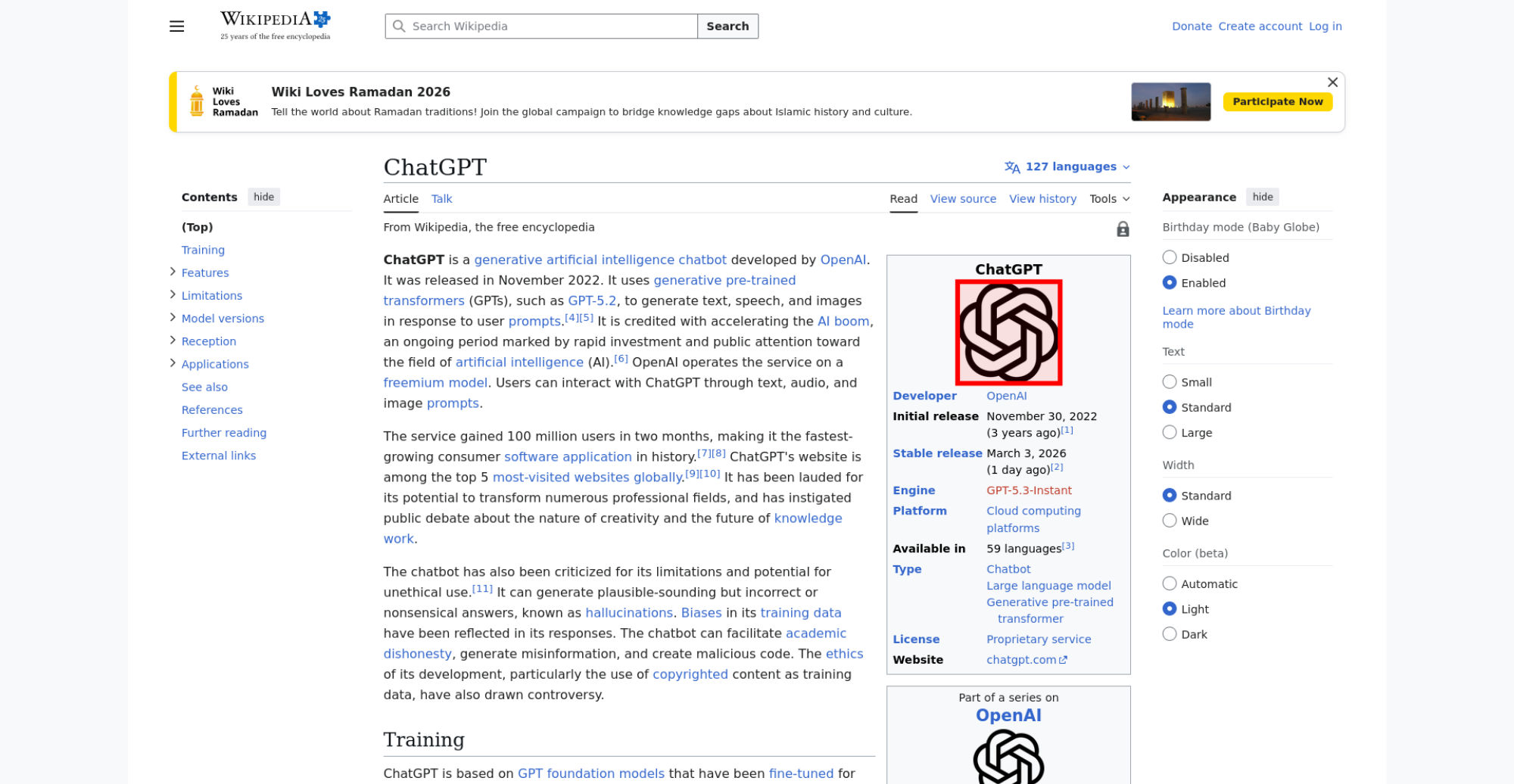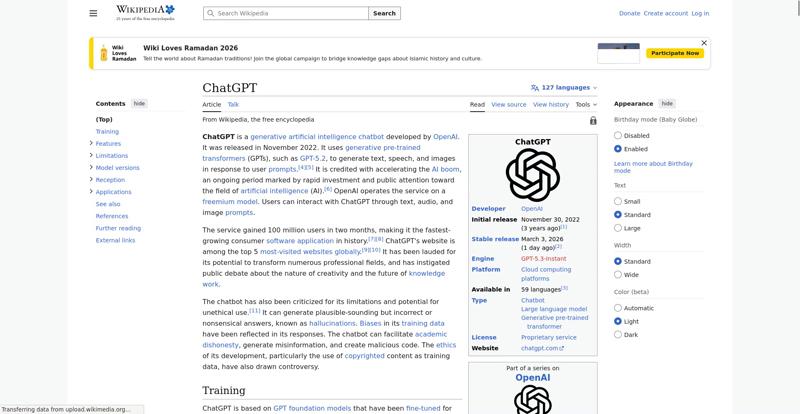 | Offenders: https://upload.wikimedia.org/wikipedia/en/thumb/1/1b/Semi-protection-shackle.svg...n-shackle.svg.png https://upload.wikimedia.org/wikipedia/commons/thumb/6/66/OpenAI_logo_2025_%28sy...symbol%29.svg.png https://upload.wikimedia.org/wikipedia/commons/thumb/6/66/OpenAI_logo_2025_%28sy...symbol%29.svg.png https://upload.wikimedia.org/wikipedia/commons/thumb/b/b5/Three-stage_large_lang..._workflow.svg.png https://upload.wikimedia.org/wikipedia/commons/thumb/4/47/A_pictorial_interpreta...ed_by_ChatGPT.jpg https://upload.wikimedia.org/wikipedia/commons/thumb/3/3a/ChatGPT_hallucination....hallucination.png https://upload.wikimedia.org/wikipedia/commons/thumb/8/8d/Sam_Altman_CropEdit_Ja...t_James_Tamim.jpg https://upload.wikimedia.org/wikipedia/commons/thumb/b/b6/The_AI_Arms_Race_Is_Ch...erything.webp.png https://upload.wikimedia.org/wikipedia/commons/thumb/9/97/Chatgpt_usage.svg/250p...gpt_usage.svg.png https://upload.wikimedia.org/wikipedia/commons/thumb/e/eb/Countries_where_ChatGP...available.svg.png https://upload.wikimedia.org/wikipedia/commons/thumb/8/84/ChatGPT_essay_draft.pn...T_essay_draft.png https://upload.wikimedia.org/wikipedia/commons/thumb/2/2e/Books_about_ChatGPT_in...aka_bookstore.jpg https://upload.wikimedia.org/wikipedia/commons/thumb/d/de/Globe_of_letters.svg/2...f_letters.svg.png https://upload.wikimedia.org/wikipedia/commons/thumb/a/a9/Noun-technology.svg/20...echnology.svg.png https://upload.wikimedia.org/wikipedia/en/thumb/4/4a/Commons-logo.svg/40px-Commons-logo.svg.png https://upload.wikimedia.org/wikipedia/en/thumb/8/8a/OOjs_UI_icon_edit-ltr-progr...ogressive.svg.png https://upload.wikimedia.org/wikipedia/commons/thumb/a/af/OpenAI_logo_2025_%28wo...rdmark%29.svg.png https://upload.wikimedia.org/wikipedia/en/thumb/9/96/Symbol_category_class.svg/2...ory_class.svg.png https://upload.wikimedia.org/wikipedia/commons/6/65/Lock-green.svg https://upload.wikimedia.org/wikipedia/commons/4/4d/Icon_pdf_file.png https://upload.wikimedia.org/wikipedia/commons/a/aa/Lock-red-alt-2.svg https://upload.wikimedia.org/wikipedia/commons/d/d6/Lock-gray-alt-2.svg https://en.wikipedia.org/wiki/Special:CentralAutoLogin/start?useformat=desktop&type=script&usesul3=1 https://meta.wikimedia.org/w/index.php...a.org/w/index.php https://auth.wikimedia.org/metawiki/wiki/Special:CentralAutoLogin/checkLoggedIn...gin/checkLoggedIn https://upload.wikimedia.org/wikipedia/commons/c/c1/Wiki_Loves_Ramadan_Logo_Black_banner.svg https://upload.wikimedia.org/wikipedia/commons/1/1f/%D8%B5%D9%88%D9%85%D8%B9%D8%...8%D8%A7%D8%B7.jpg |