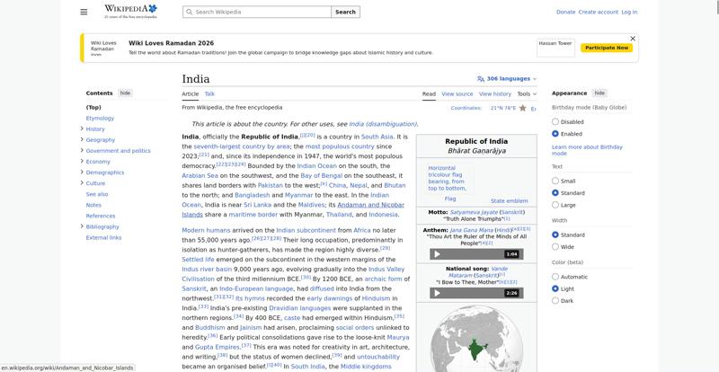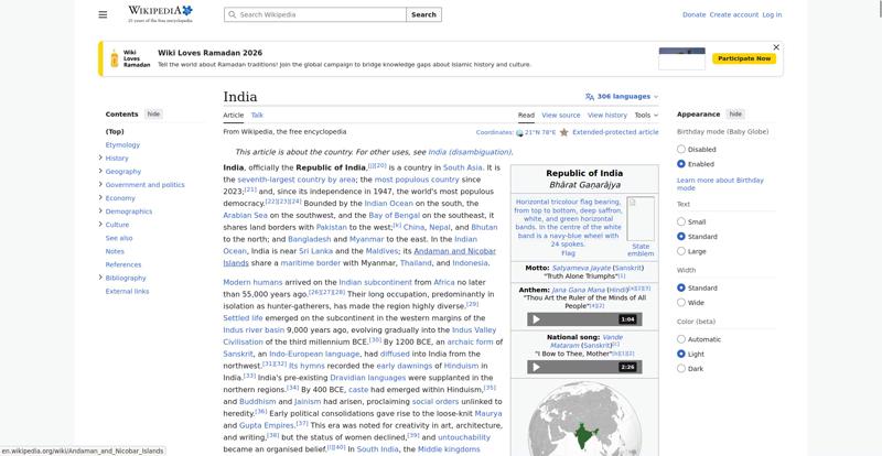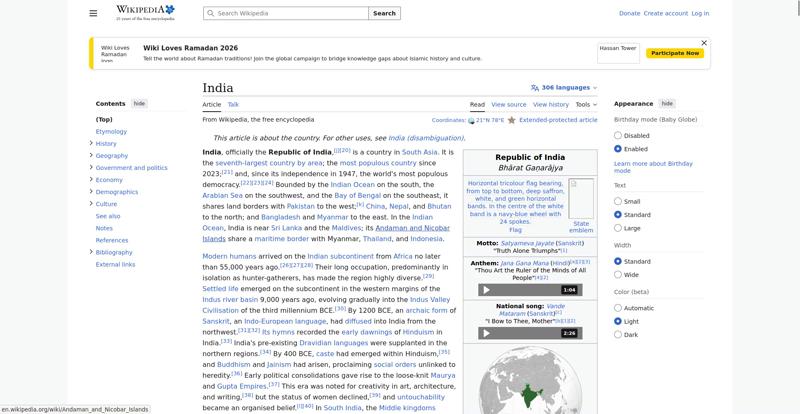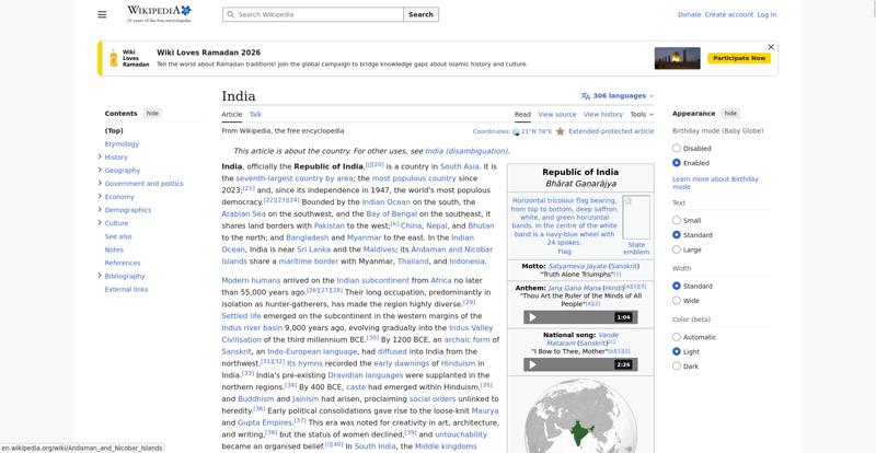 | Offenders: https://upload.wikimedia.org/wikipedia/en/thumb/e/e7/Cscr-featured.svg/20px-Cscr-featured.svg.png https://upload.wikimedia.org/wikipedia/commons/thumb/b/b0/Increase2.svg/20px-Increase2.svg.png https://upload.wikimedia.org/wikipedia/commons/thumb/b/bb/India_%28orthographic_...ection%29.svg.png https://upload.wikimedia.org/wikipedia/commons/thumb/9/92/Decrease_Positive.svg/..._Positive.svg.png https://upload.wikimedia.org/wikipedia/commons/thumb/a/a7/Battle_at_Lanka%2C_Ram...ur%2C_1649-53.jpg https://upload.wikimedia.org/wikipedia/commons/thumb/1/17/Popular_print%2C_album...022%2C0.18%29.jpg https://upload.wikimedia.org/wikipedia/commons/thumb/a/a4/Cave_26%2C_Ajanta.jpg/..._26%2C_Ajanta.jpg https://upload.wikimedia.org/wikipedia/commons/thumb/d/dd/Brihadisvara_Temple_du...11_%28edit%29.jpg https://upload.wikimedia.org/wikipedia/commons/thumb/7/78/Qutb_Minar_with_Neem_T...ith_Neem_Tree.jpg https://upload.wikimedia.org/wikipedia/commons/thumb/2/25/Hampi_-_King%27s_Palac...-_Relief_-_15.jpg https://upload.wikimedia.org/wikipedia/commons/thumb/7/75/India_1835_2_Mohurs.jp...1835_2_Mohurs.jpg https://upload.wikimedia.org/wikipedia/commons/thumb/f/f4/Mahatma_Gandhi_leaves_...l_in_Calcutta.jpg https://upload.wikimedia.org/wikipedia/commons/thumb/1/1a/Palace_of_Assembly_Cha...andigarh_2006.jpg https://upload.wikimedia.org/wikipedia/commons/thumb/4/4d/Panorama_of_Himalayas_...hand%2C_India.jpg https://upload.wikimedia.org/wikipedia/commons/thumb/f/f8/Ganges_Delta_ESA222742..._ESA22274217.jpeg https://upload.wikimedia.org/wikipedia/commons/thumb/1/19/Tungabhadra_River_and_...Coracle_Boats.JPG https://upload.wikimedia.org/wikipedia/commons/thumb/5/51/Havelock_Island%2C_Man...daman_Islands.jpg https://upload.wikimedia.org/wikipedia/commons/thumb/0/02/Coral_Tree_Monsoon_Mal...24_A7CR_01575.jpg https://upload.wikimedia.org/wikipedia/commons/thumb/9/90/Dromedary_in_Thar_dese...n_Thar_desert.jpg https://upload.wikimedia.org/wikipedia/commons/thumb/a/ad/Baspa_Valley_at_Sangla...desh%2C_India.jpg https://upload.wikimedia.org/wikipedia/commons/thumb/6/6a/Attacus_taprobanis-Kad...018-07-07-001.jpg https://upload.wikimedia.org/wikipedia/commons/thumb/8/84/Bengal_tiger_in_Sanjay..._Mukherjee_11.jpg https://upload.wikimedia.org/wikipedia/commons/thumb/5/5f/003_Purple_sunbird_in_...Giles_Laurent.jpg https://upload.wikimedia.org/wikipedia/commons/thumb/8/83/Crested_hawk-eagle_%28...garden_lizard.jpg https://upload.wikimedia.org/wikipedia/commons/thumb/4/42/Saltwater_crocodile_in..._Mukherjee_03.jpg https://upload.wikimedia.org/wikipedia/commons/thumb/a/a1/Indira_Gandhi_official...cial_portrait.png https://upload.wikimedia.org/wikipedia/commons/thumb/e/ed/The_Prime_Minister%2C_...0px-thumbnail.jpg https://upload.wikimedia.org/wikipedia/commons/thumb/4/4d/Constitution_of_India....tion_of_India.jpg https://upload.wikimedia.org/wikipedia/commons/thumb/f/f4/Rashtrapati_Bhavan-Del...lhi-India4445.JPG https://upload.wikimedia.org/wikipedia/commons/thumb/b/b8/Political_map_of_India..._India_EN.svg.png https://upload.wikimedia.org/wikipedia/commons/thumb/0/0a/Jawaharlal_Nehru%2C_Na...d_in_Belgrade.jpg https://upload.wikimedia.org/wikipedia/commons/thumb/1/15/The_Prime_Minister%2C_...0px-thumbnail.jpg https://upload.wikimedia.org/wikipedia/commons/thumb/8/8f/Female_health_workers_...4332433890%29.jpg https://upload.wikimedia.org/wikipedia/commons/thumb/5/55/WMA_button2b.png/20px-WMA_button2b.png https://upload.wikimedia.org/wikipedia/commons/b/b5/Button_resize.png https://upload.wikimedia.org/wikipedia/commons/d/d4/Button_hide.png https://en.wikipedia.org/wiki/Special:CentralAutoLogin/start?useformat=desktop&type=script&usesul3=1 https://meta.wikimedia.org/w/index.php...a.org/w/index.php https://auth.wikimedia.org/metawiki/wiki/Special:CentralAutoLogin/checkLoggedIn...gin/checkLoggedIn https://upload.wikimedia.org/wikipedia/commons/c/c1/Wiki_Loves_Ramadan_Logo_Black_banner.svg https://upload.wikimedia.org/wikipedia/commons/1/1f/%D8%B5%D9%88%D9%85%D8%B9%D8%...8%D8%A7%D8%B7.jpg |