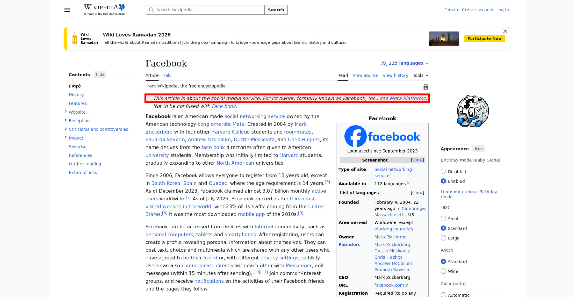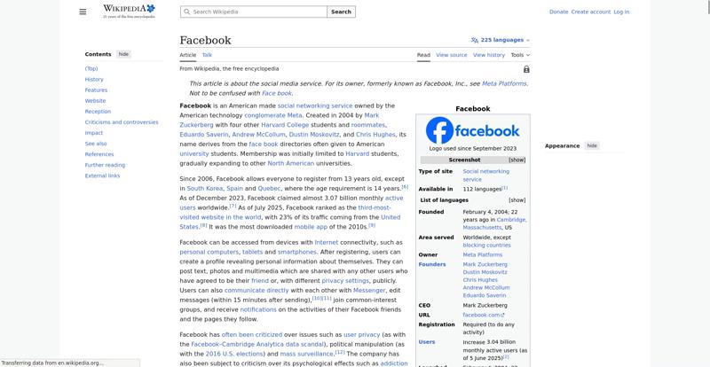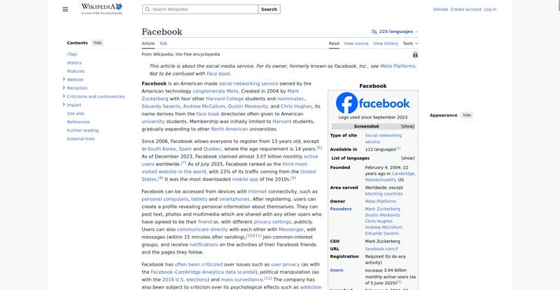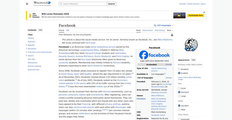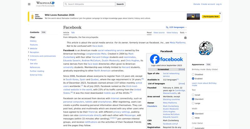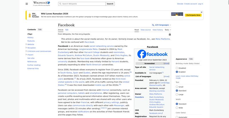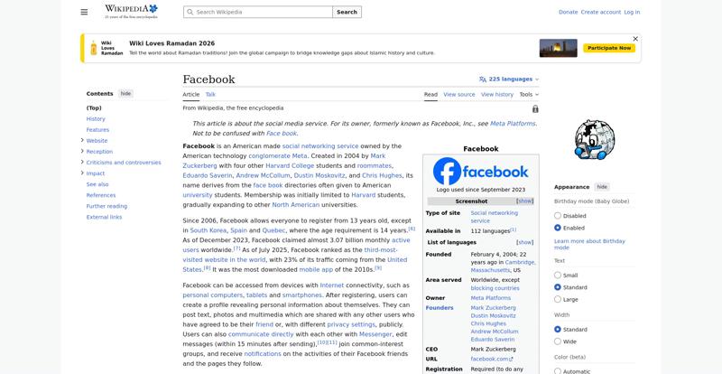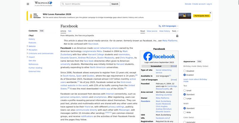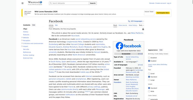 | Offenders: https://upload.wikimedia.org/wikipedia/en/thumb/1/1b/Semi-protection-shackle.svg...n-shackle.svg.png https://upload.wikimedia.org/wikipedia/commons/thumb/b/b9/2023_Facebook_icon.svg...book_icon.svg.png https://upload.wikimedia.org/wikipedia/commons/thumb/9/93/Facebook_logo_%282023%...282023%29.svg.png https://upload.wikimedia.org/wikipedia/commons/3/38/Facebook_Like_React.png https://upload.wikimedia.org/wikipedia/commons/thumb/f/fc/MarkZuckerberg-crop.jp...ckerberg-crop.jpg https://upload.wikimedia.org/wikipedia/en/thumb/1/12/Original-facebook.jpg/250px...inal-facebook.jpg https://upload.wikimedia.org/wikipedia/commons/thumb/0/06/Facebook.svg/250px-Facebook.svg.png https://upload.wikimedia.org/wikipedia/commons/thumb/6/69/Screen_of_Facebook_%28...ebook_%282%29.PNG https://upload.wikimedia.org/wikipedia/commons/thumb/f/f4/Facebook_t-shirt_with_...d_for_Hackers.jpg https://upload.wikimedia.org/wikipedia/commons/thumb/5/5d/Population_pyramid_of_..._users_by_age.png https://upload.wikimedia.org/wikipedia/commons/thumb/9/9c/Facebook_censorship.sv...ensorship.svg.png https://upload.wikimedia.org/wikipedia/commons/thumb/f/f3/PRISM_Collection_Detai...ction_Details.jpg https://upload.wikimedia.org/wikipedia/commons/thumb/6/62/Onavo_logo.png/250px-Onavo_logo.png https://upload.wikimedia.org/wikipedia/commons/thumb/2/26/Hands_Off%21_protest%2...5%2C_2025-053.jpg https://upload.wikimedia.org/wikipedia/commons/thumb/c/c9/Berlin_%289163009052%2...9163009052%29.jpg https://upload.wikimedia.org/wikipedia/commons/thumb/6/61/Ad-tech_London_2010_%2..._2010_%285%29.JPG https://upload.wikimedia.org/wikipedia/commons/thumb/2/27/2011_Egyptian_protests...26_jan25_card.jpg https://upload.wikimedia.org/wikipedia/commons/thumb/9/99/SF_Pride_2014_-_Stierc...4_-_Stierch_7.jpg https://upload.wikimedia.org/wikipedia/commons/thumb/2/2a/Industry5.svg/40px-Industry5.svg.png https://upload.wikimedia.org/wikipedia/commons/thumb/f/f9/Crystal_Clear_app_linn...ghborhood.svg.png https://upload.wikimedia.org/wikipedia/en/thumb/0/06/Wiktionary-logo-v2.svg/40px...y-logo-v2.svg.png https://upload.wikimedia.org/wikipedia/en/thumb/4/4a/Commons-logo.svg/20px-Commons-logo.svg.png https://upload.wikimedia.org/wikipedia/commons/thumb/2/24/Wikinews-logo.svg/40px...news-logo.svg.png https://upload.wikimedia.org/wikipedia/commons/thumb/f/fa/Wikiquote-logo.svg/40p...uote-logo.svg.png https://upload.wikimedia.org/wikipedia/commons/thumb/3/32/Scholia_logo.svg/40px-Scholia_logo.svg.png https://upload.wikimedia.org/wikipedia/en/thumb/8/8a/OOjs_UI_icon_edit-ltr-progr...ogressive.svg.png https://en.wikipedia.org/wiki/Special:CentralAutoLogin/start?useformat=desktop&type=script&usesul3=1 https://meta.wikimedia.org/w/index.php...a.org/w/index.php https://auth.wikimedia.org/metawiki/wiki/Special:CentralAutoLogin/checkLoggedIn...gin/checkLoggedIn https://upload.wikimedia.org/wikipedia/commons/c/c1/Wiki_Loves_Ramadan_Logo_Black_banner.svg https://upload.wikimedia.org/wikipedia/commons/1/1f/%D8%B5%D9%88%D9%85%D8%B9%D8%...8%D8%A7%D8%B7.jpg |