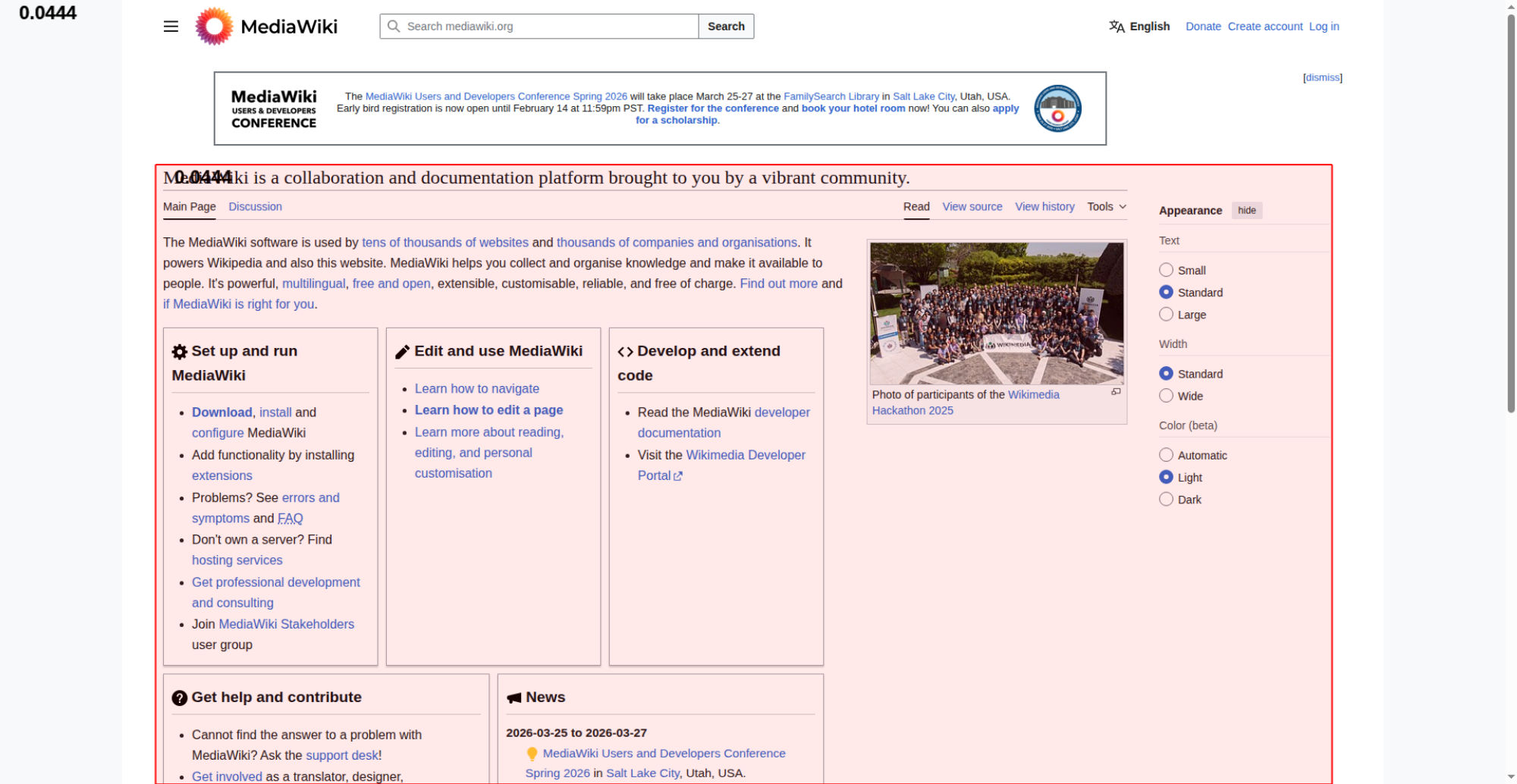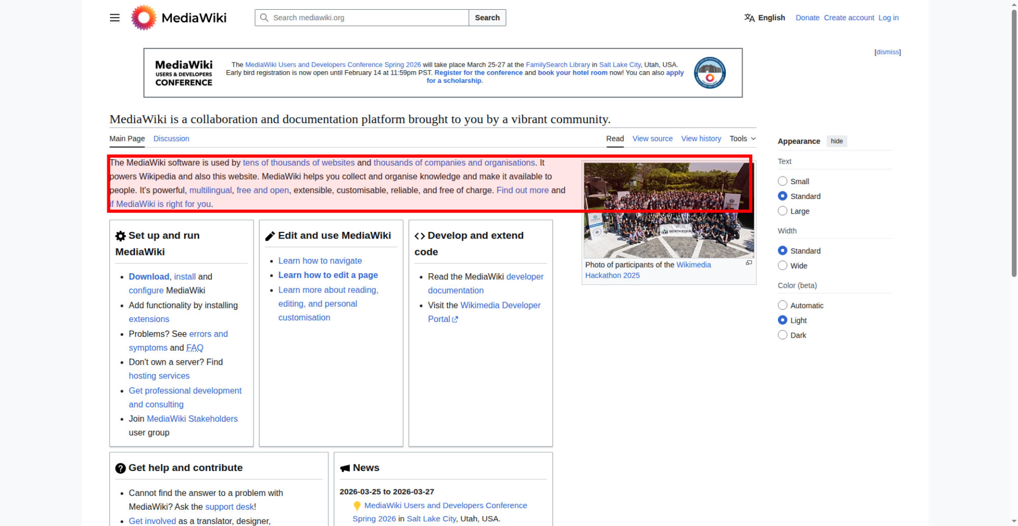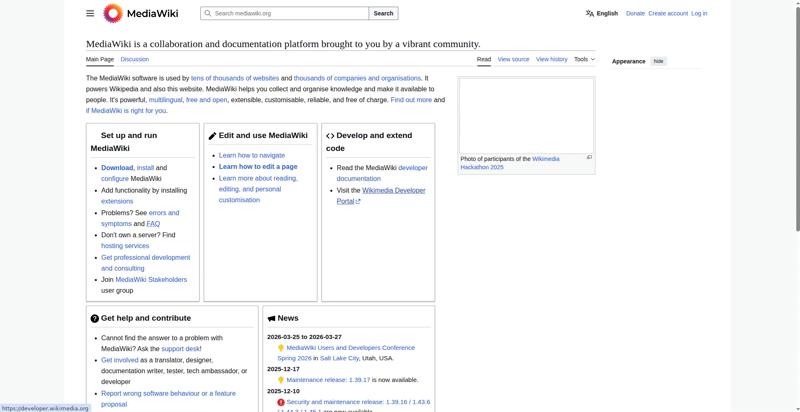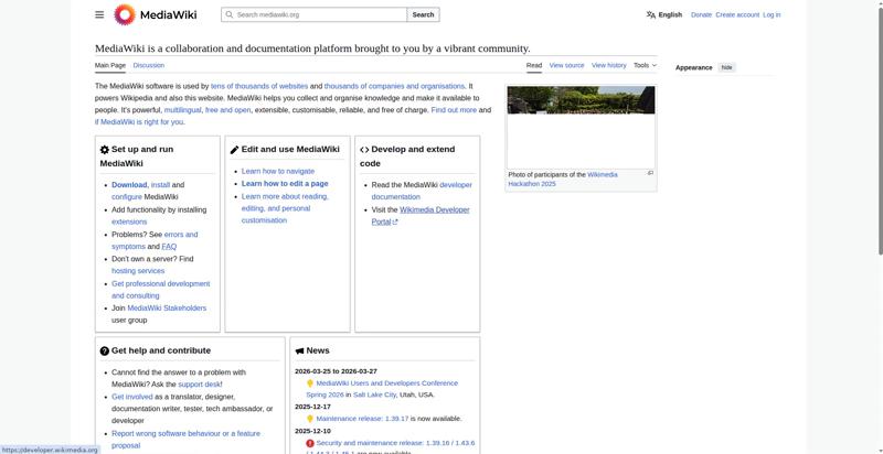 | <img src="//upload.wikimedia.org/wikipedia/commons/thumb/e/e4/Wikimedia_Hackathon_2025_Group_photo_from_drone.jpg/330px-Wikimedia_Hackathon_2025_Group_photo_from_drone.jpg" decoding="async" width="320" height="180" class="mw-file-element" srcset="//upload.wikimedia.org/wikipedia/commons/thumb/e/e4/Wikimedia_Hackathon_2025_Group_photo_from_drone.jpg/500px-Wikimedia_Hackathon_2025_Group_photo_from_drone.jpg 1.5x, //upload.wikimedia.org/wikipedia/commons/thumb/e/e4/Wikimedia_Hackathon_2025_Group_photo_from_drone.jpg/960px-Wikimedia_Hackathon_2025_Group_photo_from_drone.jpg 2x" data-file-width="3775" data-file-height="2119"> | |||||