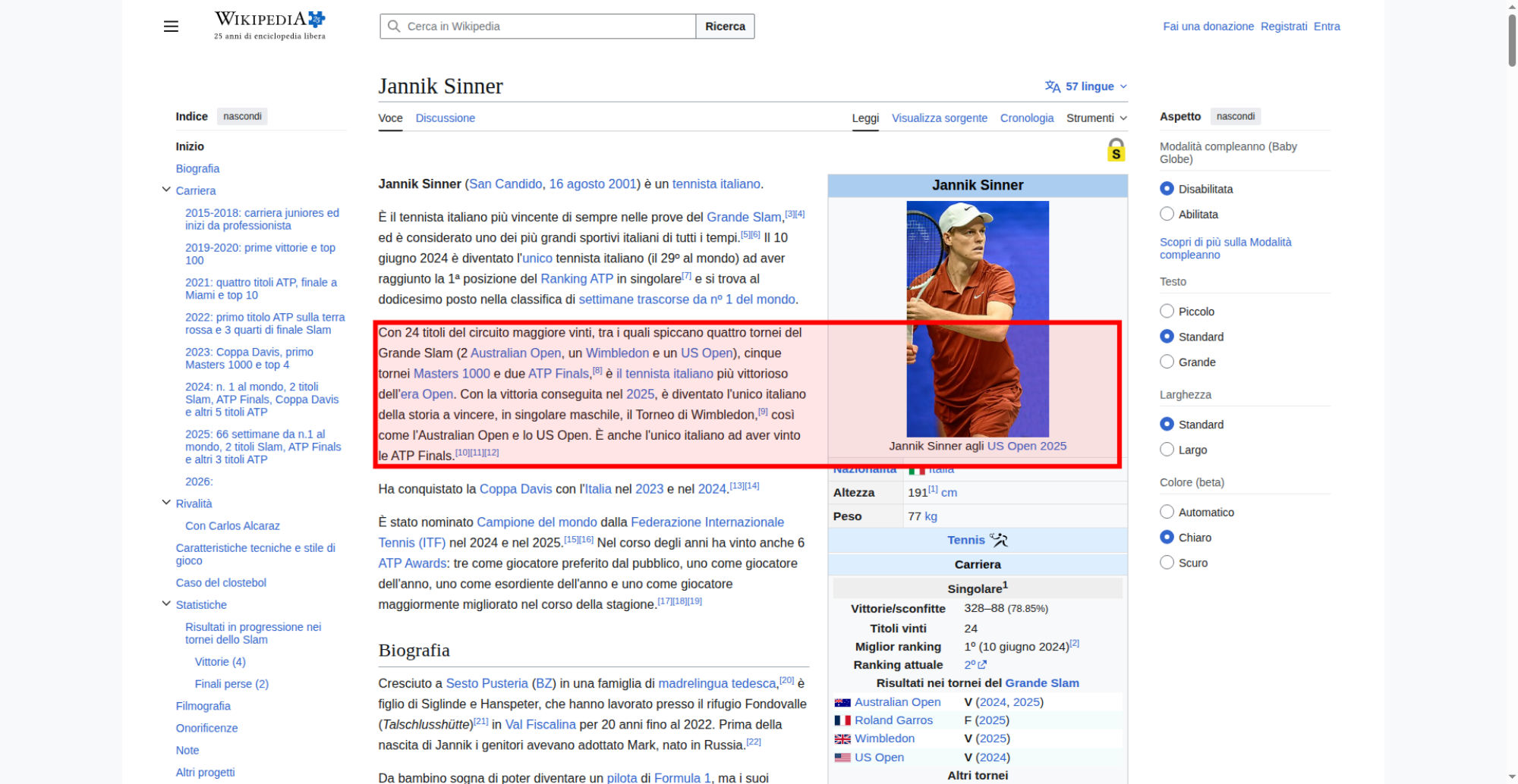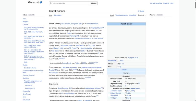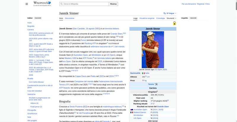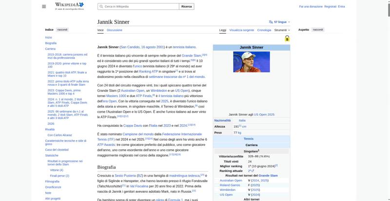 | <img resource="//it.wikipedia.org/wiki/File:Jannik_Sinner_US_Open_2025_(cropped).jpg" src="//upload.wikimedia.org/wikipedia/commons/thumb/4/48/Jannik_Sinner_US_Open_2025_%28cropped%29.jpg/250px-Jannik_Sinner_US_Open_2025_%28cropped%29.jpg" decoding="async" data-file-width="1204" data-file-height="2000" data-file-type="bitmap" height="300" width="180" srcset="//upload.wikimedia.org/wikipedia/commons/thumb/4/48/Jannik_Sinner_US_Open_2025_%28cropped%29.jpg/330px-Jannik_Sinner_US_Open_2025_%28cropped%29.jpg 1.5x, //upload.wikimedia.org/wikipedia/commons/thumb/4/48/Jannik_Sinner_US_Open_2025_%28cropped%29.jpg/500px-Jannik_Sinner_US_Open_2025_%28cropped%29.jpg 2x" class="mw-file-element"> | |||||