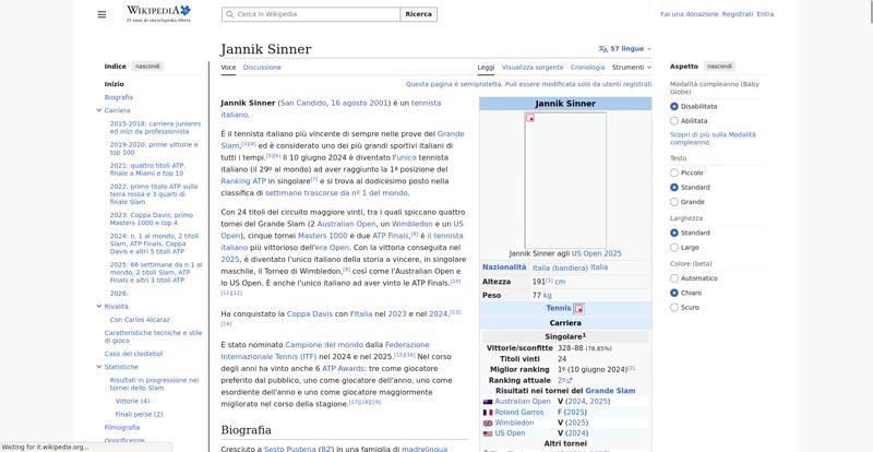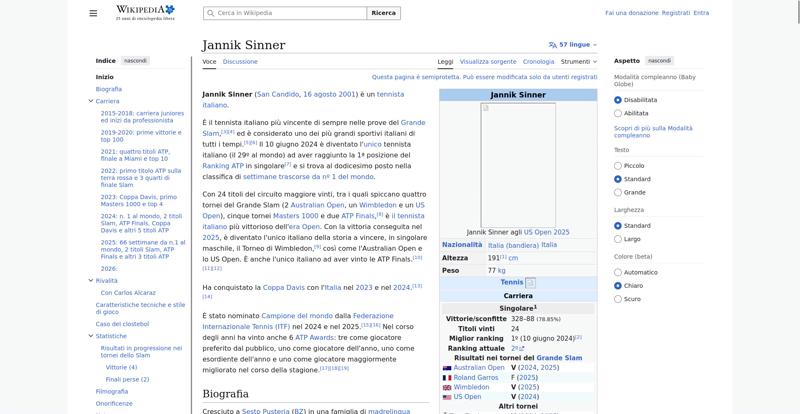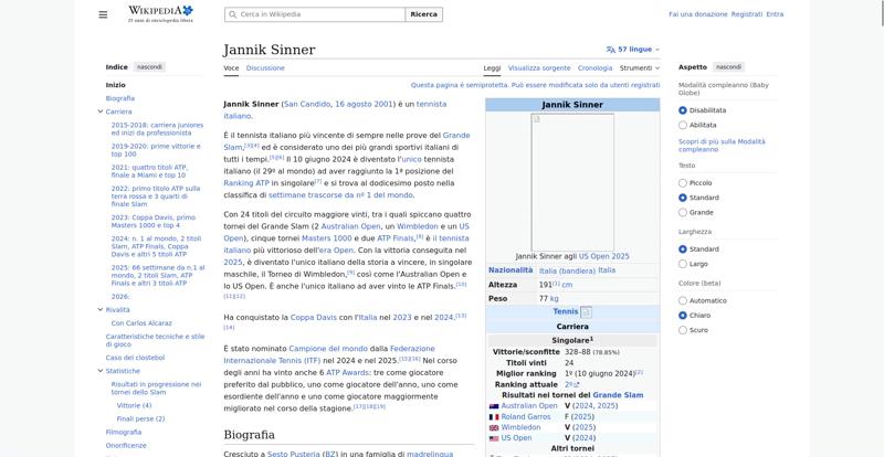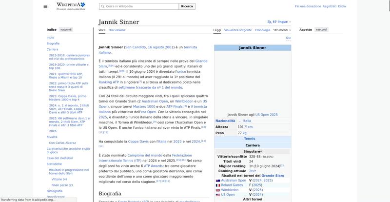 <img resource="//it.wikipedia.org/wiki/File:Jannik_Sinner_US_Open_2025_(cropped).jpg" src="//upload.wikimedia.org/wikipedia/commons/thumb/4/48/Jannik_Sinner_US_Open_2025_%28cropped%29.jpg/250px-Jannik_Sinner_US_Open_2025_%28cropped%29.jpg" decoding="async" data-file-width="1204" data-file-height="2000" data-file-type="bitmap" height="300" width="180" srcset="//upload.wikimedia.org/wikipedia/commons/thumb/4/48/Jannik_Sinner_US_Open_2025_%28cropped%29.jpg/330px-Jannik_Sinner_US_Open_2025_%28cropped%29.jpg 1.5x, //upload.wikimedia.org/wikipedia/commons/thumb/4/48/Jannik_Sinner_US_Open_2025_%28cropped%29.jpg/500px-Jannik_Sinner_US_Open_2025_%28cropped%29.jpg 2x" class="mw-file-element">