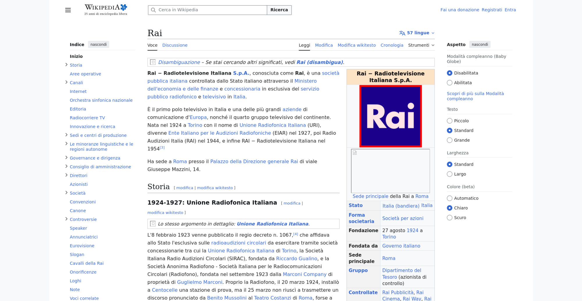 | Offenders: https://upload.wikimedia.org/wikipedia/commons/thumb/8/88/Logo_of_RAI_%282016%29...282016%29.svg.png https://upload.wikimedia.org/wikipedia/commons/thumb/c/cc/Paolo_Monti_-_Servizio..._BEIC_6364368.jpg https://upload.wikimedia.org/wikipedia/commons/thumb/6/6c/Rai_Roma_via_Teulada.J...a_via_Teulada.JPG https://upload.wikimedia.org/wikipedia/it/thumb/a/a5/DSE_RAI_-_Corso_BASIC_-_198...BASIC_-_1986.jpeg https://upload.wikimedia.org/wikipedia/it/thumb/7/7a/Sanremo_1985_-_Antonella_Ru...lla_Ruggiero.jpeg https://upload.wikimedia.org/wikipedia/commons/thumb/f/f8/Saxa_rubra.jpg/250px-Saxa_rubra.jpg https://upload.wikimedia.org/wikipedia/commons/thumb/4/4e/RAI_sede_Salaria.jpeg/...sede_Salaria.jpeg https://upload.wikimedia.org/wikipedia/commons/thumb/f/fa/Rai_1_-_Logo_2016.svg/...Logo_2016.svg.png https://upload.wikimedia.org/wikipedia/commons/thumb/f/fb/Yes_check.svg/20px-Yes_check.svg.png https://upload.wikimedia.org/wikipedia/commons/thumb/a/a2/X_mark.svg/20px-X_mark.svg.png https://upload.wikimedia.org/wikipedia/commons/thumb/9/99/Rai_2_-_Logo_2016.svg/...Logo_2016.svg.png https://upload.wikimedia.org/wikipedia/commons/thumb/4/47/Rai_3_-_Logo_2016.svg/...Logo_2016.svg.png https://upload.wikimedia.org/wikipedia/commons/thumb/4/4d/Rai_4_-_Logo_2016.svg/...Logo_2016.svg.png https://upload.wikimedia.org/wikipedia/commons/thumb/f/f8/Rai_5_-_Logo_2017.svg/...Logo_2017.svg.png https://upload.wikimedia.org/wikipedia/commons/thumb/6/61/Rai_Movie_-_Logo_2017....Logo_2017.svg.png https://upload.wikimedia.org/wikipedia/commons/thumb/a/ad/Rai_Premium_-_Logo_201...Logo_2017.svg.png https://upload.wikimedia.org/wikipedia/commons/thumb/c/c1/Rai_Gulp_-_Logo_2017.s...Logo_2017.svg.png https://upload.wikimedia.org/wikipedia/commons/thumb/0/01/Rai_Yoyo_-_Logo_2017.s...Logo_2017.svg.png https://upload.wikimedia.org/wikipedia/commons/thumb/a/a1/Rai_News_24_logo_%2820...282022%29.svg.png https://upload.wikimedia.org/wikipedia/commons/thumb/f/f8/Rai_Storia_-_Logo_2017...Logo_2017.svg.png https://upload.wikimedia.org/wikipedia/commons/thumb/b/b3/Rai_Sport_-_Logo_2022....Logo_2022.svg.png https://upload.wikimedia.org/wikipedia/commons/thumb/1/11/Rai_Scuola_-_Logo_2017...Logo_2017.svg.png https://upload.wikimedia.org/wikipedia/commons/thumb/f/fd/Rai_Radio_2_-_Logo_201...Logo_2017.svg.png https://upload.wikimedia.org/wikipedia/commons/thumb/b/bc/Rai_4K_-_Logo_2017.svg...Logo_2017.svg.png https://upload.wikimedia.org/wikipedia/commons/thumb/8/8a/Rai_Italia_-_Logo_2017...Logo_2017.svg.png https://upload.wikimedia.org/wikipedia/commons/thumb/c/cf/Rai_World_Premium_-_Lo...Logo_2017.svg.png https://upload.wikimedia.org/wikipedia/commons/thumb/3/3a/Rai_3_Abruzzo_-_Logo_2...o_-_Logo_2016.png https://upload.wikimedia.org/wikipedia/commons/thumb/6/6e/Rai_3_Alto_Adige_-_Log...e_-_Logo_2016.png https://upload.wikimedia.org/wikipedia/commons/thumb/a/ab/Rai_Alto_Adige_-_Logo_...Logo_2018.svg.png https://upload.wikimedia.org/wikipedia/commons/thumb/6/64/Rai_3_Basilicata_-_Log...a_-_Logo_2016.png https://upload.wikimedia.org/wikipedia/commons/thumb/3/31/Rai_3_Calabria_-_Logo_...a_-_Logo_2016.png https://upload.wikimedia.org/wikipedia/commons/thumb/f/fc/Rai_3_Campania_-_Logo_...a_-_Logo_2016.png https://upload.wikimedia.org/wikipedia/commons/thumb/4/47/Rai_3_Emilia_Romagna_-...a_-_Logo_2016.png https://upload.wikimedia.org/wikipedia/commons/thumb/5/51/Rai_3_Friuli_Venezia_G...a_-_Logo_2016.png https://upload.wikimedia.org/wikipedia/commons/thumb/c/c4/Rai_3_Bis_FJK_Logo_201...Logo_2016.svg.png https://upload.wikimedia.org/wikipedia/commons/thumb/7/7a/Rai_3_Lazio_-_Logo_201...o_-_Logo_2016.png https://upload.wikimedia.org/wikipedia/commons/thumb/f/f2/Rai_3_Liguria_-_Logo_2...a_-_Logo_2016.png https://upload.wikimedia.org/wikipedia/commons/thumb/c/c0/Rai_3_Lombardia_-_Logo...a_-_Logo_2016.png https://en.wikipedia.org/w/index.php...a.org/w/index.php https://en.wikipedia.org/w/index.php...a.org/w/index.php https://it.wikipedia.org/wiki/Special:CentralAutoLogin/start?useformat=desktop&type=script&usesul3=1 https://auth.wikimedia.org/metawiki/wiki/Special:CentralAutoLogin/checkLoggedIn...gin/checkLoggedIn |