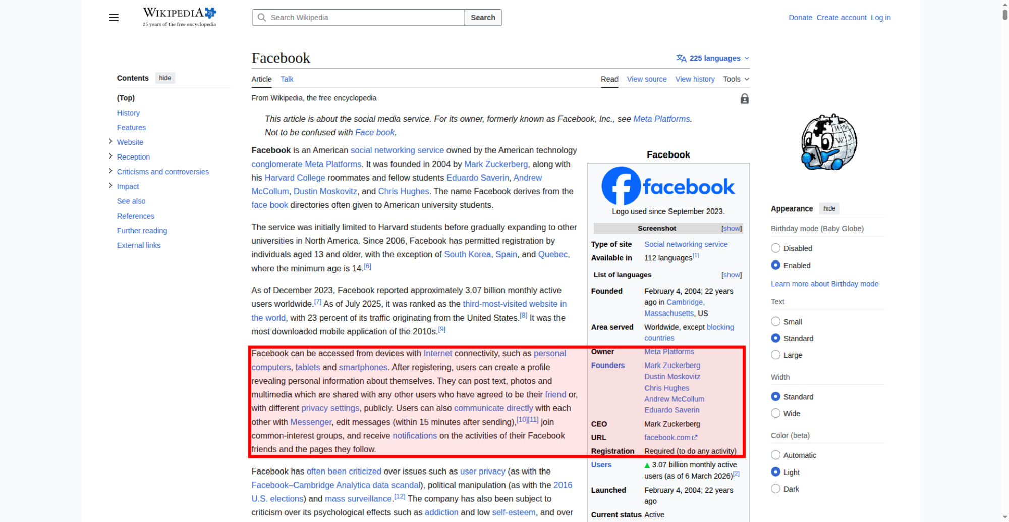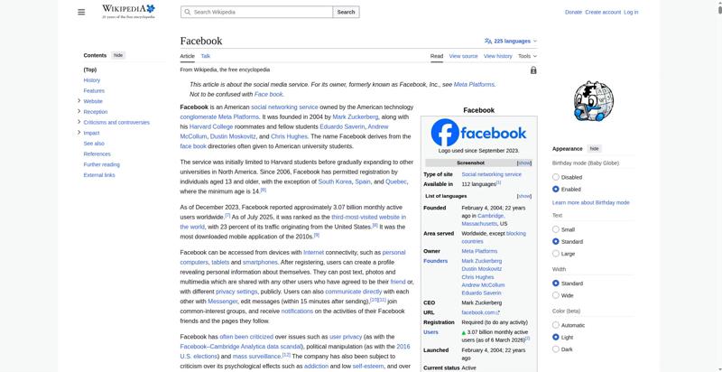 | Offenders: https://upload.wikimedia.org/wikipedia/en/thumb/1/1b/Semi-protection-shackle.svg...n-shackle.svg.png https://upload.wikimedia.org/wikipedia/commons/thumb/b/b9/2023_Facebook_icon.svg...book_icon.svg.png https://upload.wikimedia.org/wikipedia/commons/thumb/9/93/Facebook_logo_%282023%...282023%29.svg.png https://upload.wikimedia.org/wikipedia/en/6/64/Facebook_user_page.png https://upload.wikimedia.org/wikipedia/commons/thumb/b/b0/Increase2.svg/20px-Increase2.svg.png https://upload.wikimedia.org/wikipedia/commons/thumb/0/05/Meta_Platforms_Inc._lo...ropped%29.svg.png https://upload.wikimedia.org/wikipedia/commons/thumb/9/99/Wiktionary-logo-en-v2....ogo-en-v2.svg.png https://upload.wikimedia.org/wikipedia/en/thumb/4/4a/Commons-logo.svg/20px-Commons-logo.svg.png https://upload.wikimedia.org/wikipedia/commons/thumb/2/24/Wikinews-logo.svg/40px...news-logo.svg.png https://upload.wikimedia.org/wikipedia/commons/thumb/f/fa/Wikiquote-logo.svg/40p...uote-logo.svg.png https://upload.wikimedia.org/wikipedia/commons/thumb/3/32/Scholia_logo.svg/40px-Scholia_logo.svg.png https://upload.wikimedia.org/wikipedia/en/thumb/8/8a/OOjs_UI_icon_edit-ltr-progr...ogressive.svg.png https://upload.wikimedia.org/wikipedia/commons/thumb/f/fc/MarkZuckerberg-crop.jp...ckerberg-crop.jpg https://upload.wikimedia.org/wikipedia/en/thumb/1/12/Original-facebook.jpg/250px...inal-facebook.jpg https://upload.wikimedia.org/wikipedia/commons/thumb/0/06/Facebook.svg/250px-Facebook.svg.png https://upload.wikimedia.org/wikipedia/commons/thumb/6/69/Screen_of_Facebook_%28...ebook_%282%29.PNG https://upload.wikimedia.org/wikipedia/commons/3/38/Facebook_Like_React.png https://upload.wikimedia.org/wikipedia/commons/thumb/f/f4/Facebook_t-shirt_with_...d_for_Hackers.jpg https://upload.wikimedia.org/wikipedia/commons/thumb/5/5d/Population_pyramid_of_..._users_by_age.png https://upload.wikimedia.org/wikipedia/commons/thumb/9/9c/Facebook_censorship.sv...ensorship.svg.png https://upload.wikimedia.org/wikipedia/commons/thumb/f/f3/PRISM_Collection_Detai...ction_Details.jpg https://upload.wikimedia.org/wikipedia/commons/thumb/6/62/Onavo_logo.png/250px-Onavo_logo.png https://upload.wikimedia.org/wikipedia/commons/thumb/2/26/Hands_Off%21_protest%2...5%2C_2025-053.jpg https://upload.wikimedia.org/wikipedia/commons/thumb/c/c9/Berlin_%289163009052%2...9163009052%29.jpg https://upload.wikimedia.org/wikipedia/commons/thumb/6/61/Ad-tech_London_2010_%2..._2010_%285%29.JPG https://upload.wikimedia.org/wikipedia/commons/thumb/2/27/2011_Egyptian_protests...26_jan25_card.jpg https://upload.wikimedia.org/wikipedia/commons/thumb/9/99/SF_Pride_2014_-_Stierc...4_-_Stierch_7.jpg https://upload.wikimedia.org/wikipedia/commons/thumb/2/2a/Industry5.svg/40px-Industry5.svg.png https://upload.wikimedia.org/wikipedia/commons/thumb/f/f9/Crystal_Clear_app_linn...ghborhood.svg.png https://upload.wikimedia.org/wikipedia/commons/a/aa/Lock-red-alt-2.svg https://upload.wikimedia.org/wikipedia/commons/4/4d/Icon_pdf_file.png https://upload.wikimedia.org/wikipedia/commons/6/65/Lock-green.svg https://upload.wikimedia.org/wikipedia/commons/d/d6/Lock-gray-alt-2.svg https://en.wikipedia.org/wiki/Special:CentralAutoLogin/start?useformat=desktop&type=script&usesul3=1 https://auth.wikimedia.org/metawiki/wiki/Special:CentralAutoLogin/checkLoggedIn...gin/checkLoggedIn |