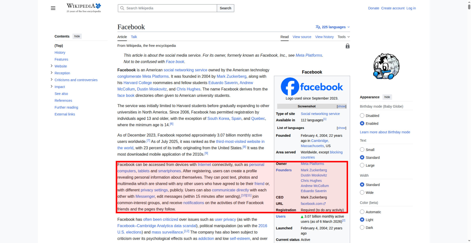 | Offenders: https://upload.wikimedia.org/wikipedia/en/thumb/1/1b/Semi-protection-shackle.svg...n-shackle.svg.png https://upload.wikimedia.org/wikipedia/commons/thumb/b/b9/2023_Facebook_icon.svg...book_icon.svg.png https://upload.wikimedia.org/wikipedia/commons/thumb/9/93/Facebook_logo_%282023%...282023%29.svg.png https://upload.wikimedia.org/wikipedia/en/6/64/Facebook_user_page.png https://upload.wikimedia.org/wikipedia/commons/thumb/b/b0/Increase2.svg/20px-Increase2.svg.png https://upload.wikimedia.org/wikipedia/commons/thumb/0/05/Meta_Platforms_Inc._lo...ropped%29.svg.png https://upload.wikimedia.org/wikipedia/commons/thumb/9/99/Wiktionary-logo-en-v2....ogo-en-v2.svg.png https://upload.wikimedia.org/wikipedia/en/thumb/4/4a/Commons-logo.svg/20px-Commons-logo.svg.png https://upload.wikimedia.org/wikipedia/commons/thumb/2/24/Wikinews-logo.svg/40px...news-logo.svg.png https://upload.wikimedia.org/wikipedia/commons/thumb/f/fa/Wikiquote-logo.svg/40p...uote-logo.svg.png https://upload.wikimedia.org/wikipedia/commons/thumb/3/32/Scholia_logo.svg/40px-Scholia_logo.svg.png https://upload.wikimedia.org/wikipedia/en/thumb/8/8a/OOjs_UI_icon_edit-ltr-progr...ogressive.svg.png https://upload.wikimedia.org/wikipedia/commons/thumb/f/fc/MarkZuckerberg-crop.jp...ckerberg-crop.jpg https://upload.wikimedia.org/wikipedia/en/thumb/1/12/Original-facebook.jpg/250px...inal-facebook.jpg https://upload.wikimedia.org/wikipedia/commons/thumb/0/06/Facebook.svg/250px-Facebook.svg.png https://upload.wikimedia.org/wikipedia/commons/thumb/6/69/Screen_of_Facebook_%28...ebook_%282%29.PNG https://upload.wikimedia.org/wikipedia/commons/3/38/Facebook_Like_React.png https://upload.wikimedia.org/wikipedia/commons/thumb/f/f4/Facebook_t-shirt_with_...d_for_Hackers.jpg https://upload.wikimedia.org/wikipedia/commons/thumb/5/5d/Population_pyramid_of_..._users_by_age.png https://upload.wikimedia.org/wikipedia/commons/thumb/9/9c/Facebook_censorship.sv...ensorship.svg.png https://upload.wikimedia.org/wikipedia/commons/thumb/f/f3/PRISM_Collection_Detai...ction_Details.jpg https://upload.wikimedia.org/wikipedia/commons/thumb/6/62/Onavo_logo.png/250px-Onavo_logo.png https://upload.wikimedia.org/wikipedia/commons/thumb/2/26/Hands_Off%21_protest%2...5%2C_2025-053.jpg https://upload.wikimedia.org/wikipedia/commons/thumb/c/c9/Berlin_%289163009052%2...9163009052%29.jpg https://upload.wikimedia.org/wikipedia/commons/thumb/6/61/Ad-tech_London_2010_%2..._2010_%285%29.JPG https://upload.wikimedia.org/wikipedia/commons/thumb/2/27/2011_Egyptian_protests...26_jan25_card.jpg https://upload.wikimedia.org/wikipedia/commons/thumb/9/99/SF_Pride_2014_-_Stierc...4_-_Stierch_7.jpg https://upload.wikimedia.org/wikipedia/commons/thumb/2/2a/Industry5.svg/40px-Industry5.svg.png https://upload.wikimedia.org/wikipedia/commons/thumb/f/f9/Crystal_Clear_app_linn...ghborhood.svg.png https://upload.wikimedia.org/wikipedia/commons/a/aa/Lock-red-alt-2.svg https://upload.wikimedia.org/wikipedia/commons/4/4d/Icon_pdf_file.png https://upload.wikimedia.org/wikipedia/commons/6/65/Lock-green.svg https://upload.wikimedia.org/wikipedia/commons/d/d6/Lock-gray-alt-2.svg https://en.wikipedia.org/wiki/Special:CentralAutoLogin/start?useformat=desktop&type=script&usesul3=1 https://auth.wikimedia.org/metawiki/wiki/Special:CentralAutoLogin/checkLoggedIn...gin/checkLoggedIn |
