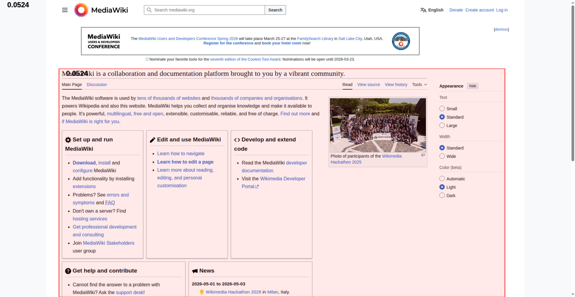 | <img src="//upload.wikimedia.org/wikipedia/commons/thumb/e/e4/Wikimedia_Hackathon_2025_Group_photo_from_drone.jpg/330px-Wikimedia_Hackathon_2025_Group_photo_from_drone.jpg" decoding="async" width="320" height="180" class="mw-file-element" srcset="//upload.wikimedia.org/wikipedia/commons/thumb/e/e4/Wikimedia_Hackathon_2025_Group_photo_from_drone.jpg/500px-Wikimedia_Hackathon_2025_Group_photo_from_drone.jpg 1.5x, //upload.wikimedia.org/wikipedia/commons/thumb/e/e4/Wikimedia_Hackathon_2025_Group_photo_from_drone.jpg/960px-Wikimedia_Hackathon_2025_Group_photo_from_drone.jpg 2x" data-file-width="3775" data-file-height="2119"> | |||||