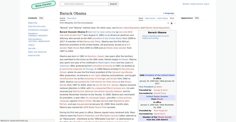 | Offenders: https://en.wikipedia.beta.wmcloud.org/static/images/project-logos/wikimedia-cloud-services.svg https://upload.wikimedia.org/wikipedia/commons/thumb/1/11/Barack_Obama_signature...signature.svg.png https://upload.wikimedia.org/wikipedia/commons/thumb/5/50/2004_Illinois_Senate_r...e_results.svg.png https://upload.wikimedia.org/wikipedia/commons/thumb/2/2b/58th_Presidential_Inau...-D-BP749-1327.jpg https://upload.wikimedia.org/wikipedia/commons/thumb/9/9f/Job_Growth_by_U.S._Pre...resident_-_v1.png |