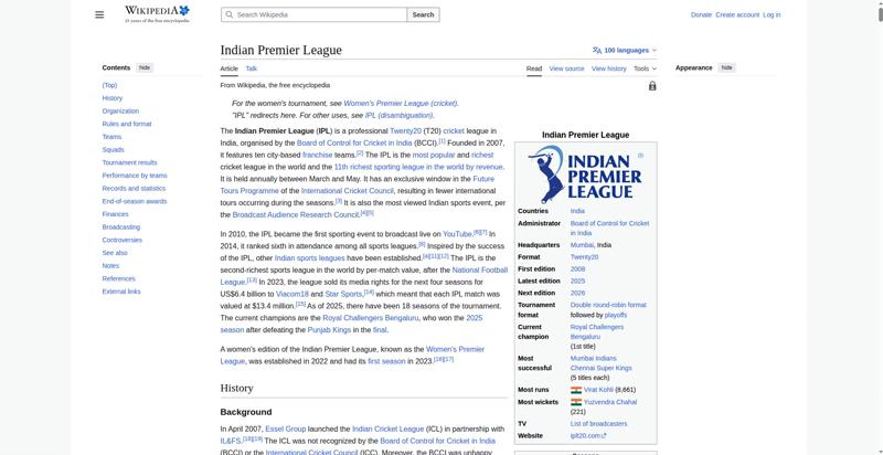 | Offenders: https://upload.wikimedia.org/wikipedia/en/thumb/1/1b/Semi-protection-shackle.svg...n-shackle.svg.png https://upload.wikimedia.org/wikipedia/en/thumb/8/84/Indian_Premier_League_Offic...cial_Logo.svg.png https://upload.wikimedia.org/wikipedia/en/thumb/4/41/Flag_of_India.svg/40px-Flag_of_India.svg.png https://upload.wikimedia.org/wikipedia/commons/thumb/6/67/IPL_T20_Chennai_vs_Kol...ai_vs_Kolkata.JPG https://upload.wikimedia.org/wikipedia/commons/thumb/a/a5/Flag_of_the_United_Kin...%281-2%29.svg.png https://upload.wikimedia.org/wikipedia/commons/thumb/a/af/Flag_of_South_Africa.s...th_Africa.svg.png https://upload.wikimedia.org/wikipedia/commons/thumb/d/dc/India_location_map.svg...ation_map.svg.png https://upload.wikimedia.org/wikipedia/en/timeline/2157om5n8gyp1fscjwj0xvevgp3q3tt.png https://upload.wikimedia.org/wikipedia/commons/thumb/c/cb/Flag_of_the_United_Ara..._Emirates.svg.png https://upload.wikimedia.org/wikipedia/commons/thumb/1/18/WestIndiesCricketFlagP...agPre1999.svg.png https://upload.wikimedia.org/wikipedia/en/thumb/a/a4/Flag_of_the_United_States.s...ed_States.svg.png https://upload.wikimedia.org/wikipedia/commons/thumb/0/0c/Red_pog.svg/20px-Red_pog.svg.png https://upload.wikimedia.org/wikipedia/en/thumb/b/be/Flag_of_England.svg/40px-Fl...f_England.svg.png https://upload.wikimedia.org/wikipedia/commons/thumb/3/3e/Flag_of_New_Zealand.sv...w_Zealand.svg.png https://upload.wikimedia.org/wikipedia/commons/thumb/8/88/Flag_of_Australia_%28c...verted%29.svg.png https://upload.wikimedia.org/wikipedia/commons/thumb/4/44/Virat_Kohli_with_AudiQ...i_with_AudiQ7.png https://upload.wikimedia.org/wikipedia/commons/thumb/d/df/Yuzvendra_Chahal_in_PM...PMO_New_Delhi.jpg https://upload.wikimedia.org/wikipedia/commons/thumb/f/f4/Tata_IPL_EDEN_47th_Mat...KKR_vs_SRH_02.png https://upload.wikimedia.org/wikipedia/commons/thumb/b/b0/Cricketball.png/40px-Cricketball.png https://upload.wikimedia.org/wikipedia/en/thumb/4/4a/Commons-logo.svg/40px-Commons-logo.svg.png https://upload.wikimedia.org/wikipedia/commons/thumb/5/52/Ipl.svg/120px-Ipl.svg.png https://upload.wikimedia.org/wikipedia/en/thumb/9/96/Symbol_category_class.svg/2...ory_class.svg.png https://upload.wikimedia.org/wikipedia/en/thumb/4/4a/Commons-logo.svg/20px-Commons-logo.svg.png https://upload.wikimedia.org/wikipedia/commons/thumb/c/cd/Cricket_pictogram.svg/...pictogram.svg.png https://upload.wikimedia.org/wikipedia/commons/thumb/b/bf/CLT20.svg/120px-CLT20.svg.png https://upload.wikimedia.org/wikipedia/en/thumb/8/8a/OOjs_UI_icon_edit-ltr-progr...ogressive.svg.png https://upload.wikimedia.org/wikipedia/commons/4/4d/Icon_pdf_file.png https://upload.wikimedia.org/wikipedia/commons/a/aa/Lock-red-alt-2.svg https://upload.wikimedia.org/wikipedia/commons/6/65/Lock-green.svg https://en.wikipedia.org/wiki/Special:CentralAutoLogin/start?useformat=desktop&type=script&usesul3=1 https://auth.wikimedia.org/metawiki/wiki/Special:CentralAutoLogin/checkLoggedIn...gin/checkLoggedIn |