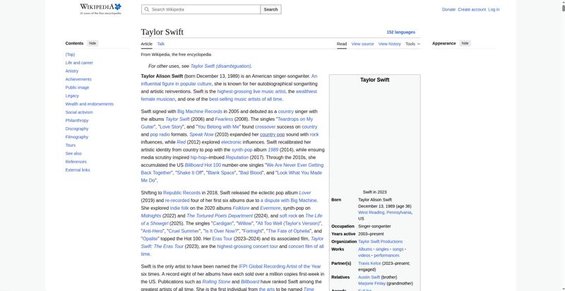 | Offenders: https://upload.wikimedia.org/wikipedia/en/thumb/e/e7/Cscr-featured.svg/20px-Cscr-featured.svg.png https://upload.wikimedia.org/wikipedia/en/thumb/8/8c/Extended-protection-shackle...n-shackle.svg.png https://upload.wikimedia.org/wikipedia/commons/thumb/b/b1/Taylor_Swift_at_the_20...wards_%283%29.png https://upload.wikimedia.org/wikipedia/en/thumb/8/8a/OOjs_UI_icon_edit-ltr-progr...ogressive.svg.png https://upload.wikimedia.org/wikipedia/commons/thumb/e/e6/Taylor_Swift_signature...signature.svg.png https://upload.wikimedia.org/wikipedia/commons/thumb/1/15/Taylor_Swift_at_Yahoo_...%28cropped%29.jpg https://upload.wikimedia.org/wikipedia/en/thumb/4/4a/Commons-logo.svg/20px-Commons-logo.svg.png https://upload.wikimedia.org/wikipedia/commons/thumb/2/24/Wikinews-logo.svg/40px...news-logo.svg.png https://upload.wikimedia.org/wikipedia/commons/thumb/f/fa/Wikiquote-logo.svg/40p...uote-logo.svg.png https://upload.wikimedia.org/wikipedia/commons/thumb/f/ff/Wikidata-logo.svg/40px...data-logo.svg.png https://upload.wikimedia.org/wikipedia/en/thumb/9/96/Symbol_category_class.svg/2...ory_class.svg.png https://upload.wikimedia.org/wikipedia/commons/thumb/e/e8/TaylorSwiftApr09.jpg/2...lorSwiftApr09.jpg https://upload.wikimedia.org/wikipedia/commons/thumb/6/6e/Taylor_Swift_2011crop....wift_2011crop.jpg https://upload.wikimedia.org/wikipedia/commons/thumb/b/b2/Taylor_Swift_Red_Tour_...our_2%2C_2013.jpg https://upload.wikimedia.org/wikipedia/commons/thumb/0/04/Taylor_Swift_045_%2817...7682880264%29.jpg https://upload.wikimedia.org/wikipedia/commons/thumb/7/7e/Taylor_Swift_Reputatio...%28cropped%29.jpg https://upload.wikimedia.org/wikipedia/commons/thumb/d/d9/191125_Taylor_Swift_at..._Music_Awards.png https://upload.wikimedia.org/wikipedia/commons/thumb/7/76/Taylor_Swift_2022_info..._2022_infobox.jpg https://upload.wikimedia.org/wikipedia/commons/thumb/5/5d/Taylor_Swift_The_Eras_...%28cropped%29.jpg https://upload.wikimedia.org/wikipedia/commons/thumb/c/cb/Gnome-mime-audio-openc...enclipart.svg.png https://upload.wikimedia.org/wikipedia/commons/thumb/7/7c/Taylor_Swift_Sydney.jp..._Swift_Sydney.jpg https://upload.wikimedia.org/wikipedia/commons/thumb/1/1f/Taylor_Swift_-_Reputat...%28cropped%29.jpg https://upload.wikimedia.org/wikipedia/commons/thumb/1/1d/Taylor_Swift_2009_MTV_...%28cropped%29.jpg https://upload.wikimedia.org/wikipedia/commons/thumb/0/0a/5.3.10TaylorSwiftByDav...avidShankbone.jpg https://upload.wikimedia.org/wikipedia/commons/thumb/5/5a/Taylor_Swift_wax_figur...%28cropped%29.jpg https://upload.wikimedia.org/wikipedia/commons/thumb/c/cf/Taylor_Swift_for_Keds....wift_for_Keds.jpg https://upload.wikimedia.org/wikipedia/commons/thumb/6/6c/Audio-input-microphone...ut-microphone.png https://upload.wikimedia.org/wikipedia/commons/d/d6/Lock-gray-alt-2.svg https://upload.wikimedia.org/wikipedia/commons/a/aa/Lock-red-alt-2.svg https://upload.wikimedia.org/wikipedia/commons/4/4d/Icon_pdf_file.png https://upload.wikimedia.org/wikipedia/commons/6/65/Lock-green.svg https://en.wikipedia.org/wiki/Special:CentralAutoLogin/start?useformat=desktop&type=script&usesul3=1 https://auth.wikimedia.org/metawiki/wiki/Special:CentralAutoLogin/checkLoggedIn...gin/checkLoggedIn |