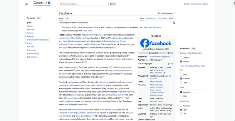 | Offenders: https://upload.wikimedia.org/wikipedia/en/thumb/1/1b/Semi-protection-shackle.svg...n-shackle.svg.png https://upload.wikimedia.org/wikipedia/commons/thumb/b/b9/2023_Facebook_icon.svg...book_icon.svg.png https://upload.wikimedia.org/wikipedia/commons/thumb/9/93/Facebook_logo_%282023%...282023%29.svg.png https://upload.wikimedia.org/wikipedia/en/6/64/Facebook_user_page.png https://upload.wikimedia.org/wikipedia/commons/thumb/b/b0/Increase2.svg/20px-Increase2.svg.png https://upload.wikimedia.org/wikipedia/commons/thumb/0/05/Meta_Platforms_Inc._lo...ropped%29.svg.png https://upload.wikimedia.org/wikipedia/commons/thumb/9/99/Wiktionary-logo-en-v2....ogo-en-v2.svg.png https://upload.wikimedia.org/wikipedia/en/thumb/4/4a/Commons-logo.svg/20px-Commons-logo.svg.png https://upload.wikimedia.org/wikipedia/commons/thumb/2/24/Wikinews-logo.svg/40px...news-logo.svg.png https://upload.wikimedia.org/wikipedia/commons/thumb/f/fa/Wikiquote-logo.svg/40p...uote-logo.svg.png https://upload.wikimedia.org/wikipedia/commons/thumb/3/32/Scholia_logo.svg/40px-Scholia_logo.svg.png https://upload.wikimedia.org/wikipedia/commons/thumb/f/fc/MarkZuckerberg-crop.jp...ckerberg-crop.jpg https://upload.wikimedia.org/wikipedia/en/thumb/8/8a/OOjs_UI_icon_edit-ltr-progr...ogressive.svg.png https://upload.wikimedia.org/wikipedia/en/thumb/1/12/Original-facebook.jpg/250px...inal-facebook.jpg https://upload.wikimedia.org/wikipedia/commons/thumb/0/06/Facebook.svg/250px-Facebook.svg.png https://upload.wikimedia.org/wikipedia/commons/thumb/6/69/Screen_of_Facebook_%28...ebook_%282%29.PNG https://upload.wikimedia.org/wikipedia/commons/3/38/Facebook_Like_React.png https://upload.wikimedia.org/wikipedia/commons/thumb/f/f4/Facebook_t-shirt_with_...d_for_Hackers.jpg https://upload.wikimedia.org/wikipedia/commons/thumb/5/5d/Population_pyramid_of_..._users_by_age.png https://upload.wikimedia.org/wikipedia/commons/thumb/9/9c/Facebook_censorship.sv...ensorship.svg.png https://upload.wikimedia.org/wikipedia/commons/thumb/f/f3/PRISM_Collection_Detai...ction_Details.jpg https://upload.wikimedia.org/wikipedia/commons/thumb/6/62/Onavo_logo.png/250px-Onavo_logo.png https://upload.wikimedia.org/wikipedia/commons/thumb/2/26/Hands_Off%21_protest%2...5%2C_2025-053.jpg https://upload.wikimedia.org/wikipedia/commons/thumb/c/c9/Berlin_%289163009052%2...9163009052%29.jpg https://upload.wikimedia.org/wikipedia/commons/thumb/6/61/Ad-tech_London_2010_%2..._2010_%285%29.JPG https://upload.wikimedia.org/wikipedia/commons/thumb/2/27/2011_Egyptian_protests...26_jan25_card.jpg https://upload.wikimedia.org/wikipedia/commons/thumb/9/99/SF_Pride_2014_-_Stierc...4_-_Stierch_7.jpg https://upload.wikimedia.org/wikipedia/commons/thumb/2/2a/Industry5.svg/40px-Industry5.svg.png https://upload.wikimedia.org/wikipedia/commons/thumb/f/f9/Crystal_Clear_app_linn...ghborhood.svg.png https://upload.wikimedia.org/wikipedia/commons/a/aa/Lock-red-alt-2.svg https://upload.wikimedia.org/wikipedia/commons/4/4d/Icon_pdf_file.png https://upload.wikimedia.org/wikipedia/commons/6/65/Lock-green.svg https://upload.wikimedia.org/wikipedia/commons/d/d6/Lock-gray-alt-2.svg https://en.wikipedia.org/wiki/Special:CentralAutoLogin/start?useformat=desktop&type=script&usesul3=1 https://auth.wikimedia.org/metawiki/wiki/Special:CentralAutoLogin/checkLoggedIn...gin/checkLoggedIn |